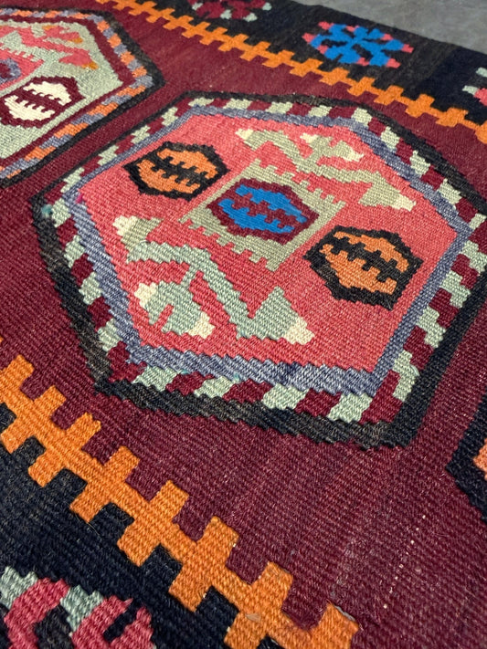 Berry Red Sarkisla Turkish Vintage Mini Kilim • Tribal Handmade Flatweave Wool Accent Rug (18"x42")