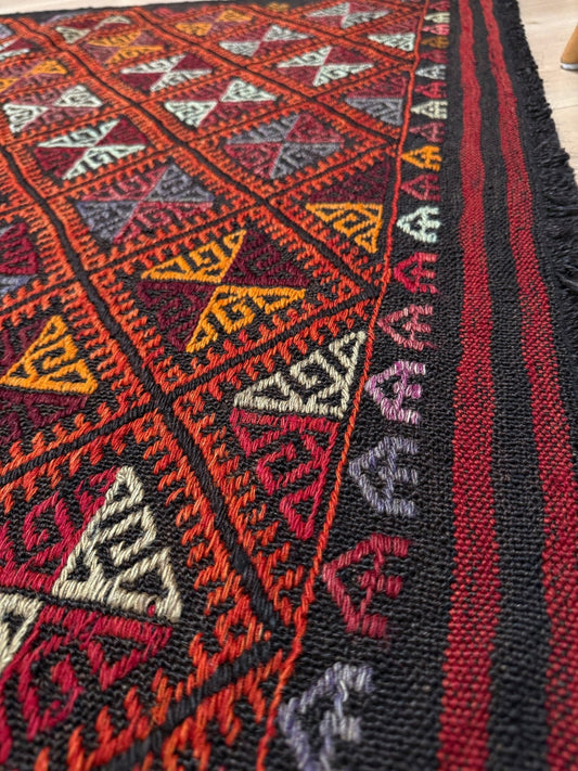 Charcoal & Orange Malatya Cicim Kilim • Vintage Handmade Rug / Wall Art (3'3" x 3’6")