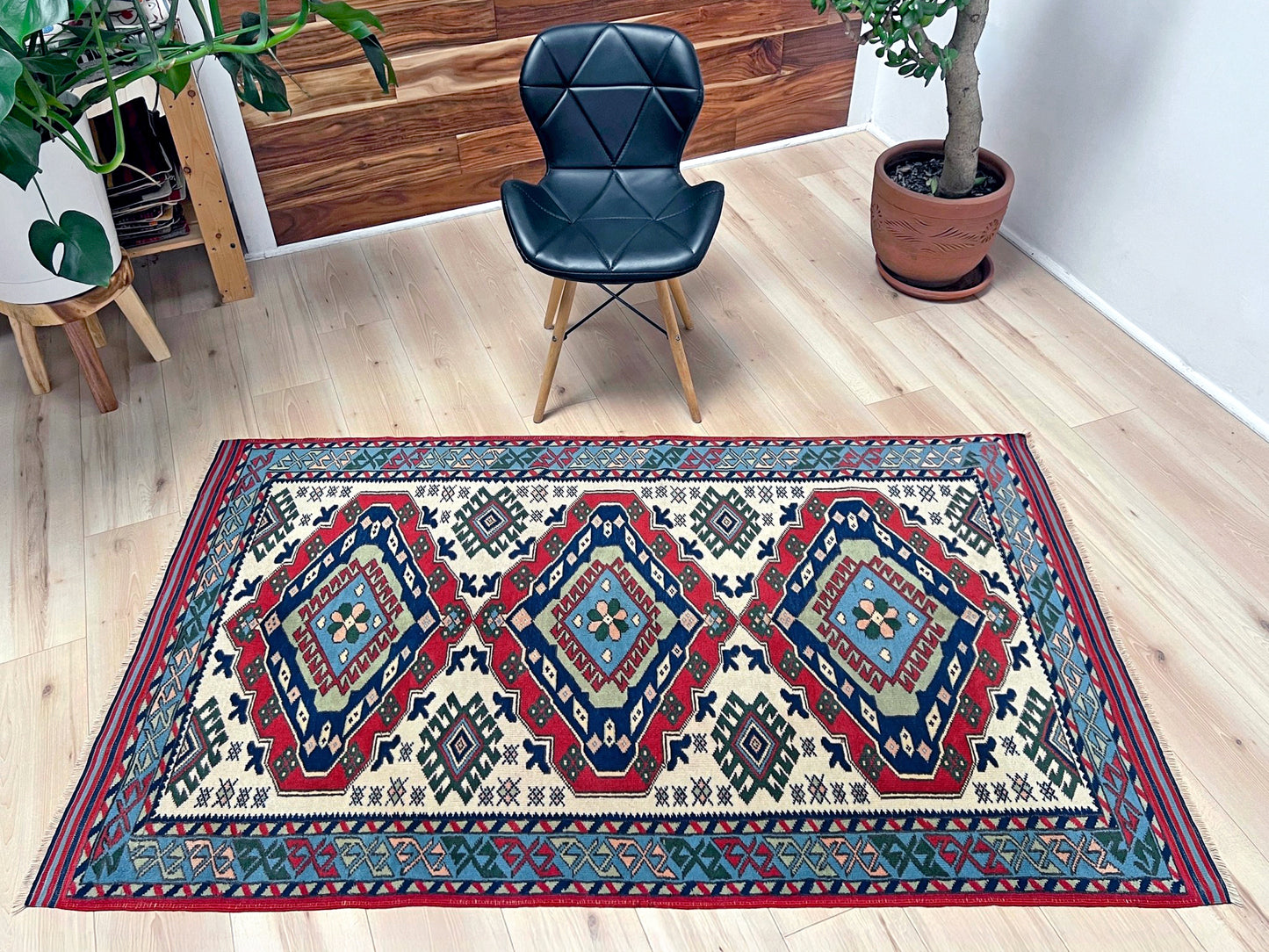 ✔ This charming handmade Turkish rug is a playful blend of baby blue and crisp white, bringing a fresh, serene vibe to any room. Its intricate tribal motifs weave tradition and artistry together, adding a touch of bohemian elegance to your space. Crafted from soft wool, the rug is perfect for high-traffic areas, balancing durability with a welcoming, cozy texture. Whether placed in a nursery or living room, it’s bound to be a delightful statement piece with a whisper of whimsy.