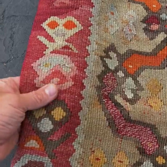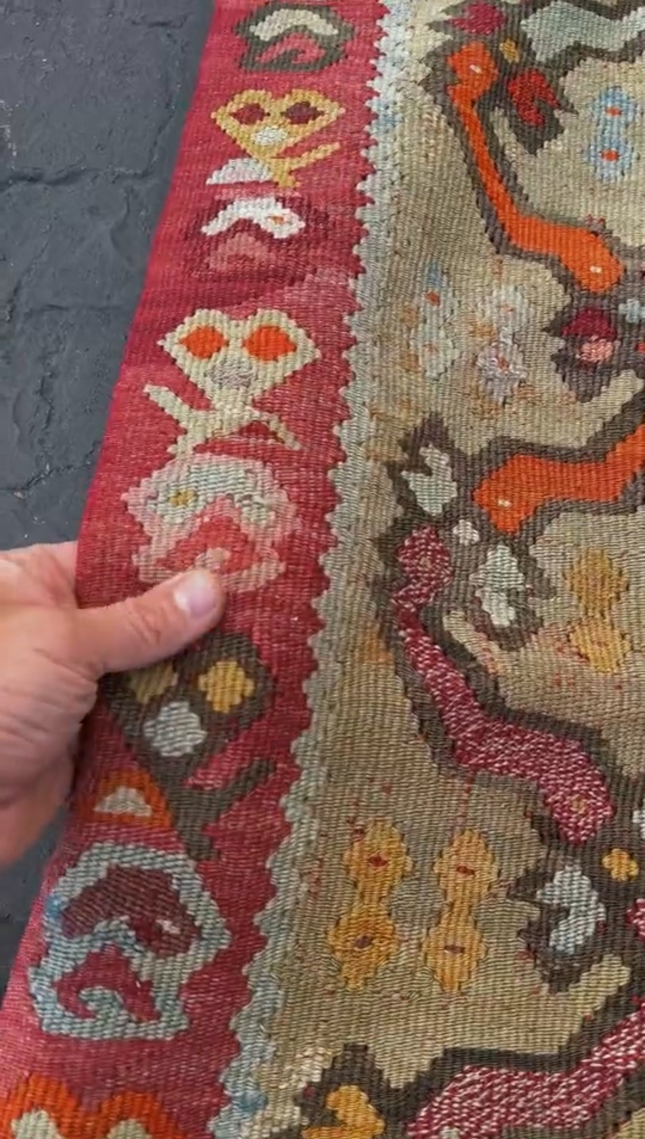 This 1920s Oushak kilim dances between tradition and charm, showcasing the "Elibelinde" motif and a striking angular medallion that radiates folkloric flair. The field glows with a rich, softened red—tempered by layers of sandy taupe, warm saffron, slate blue, and faded ivory that bring depth and movement across the design. Accents of charcoal, rust, and apricot peek through the geometric borders like well-placed brushstrokes. At nearly 9x12 feet, it’s a woven tale from Anatolia—sophisticated, storied, and not afraid to have a little fun.