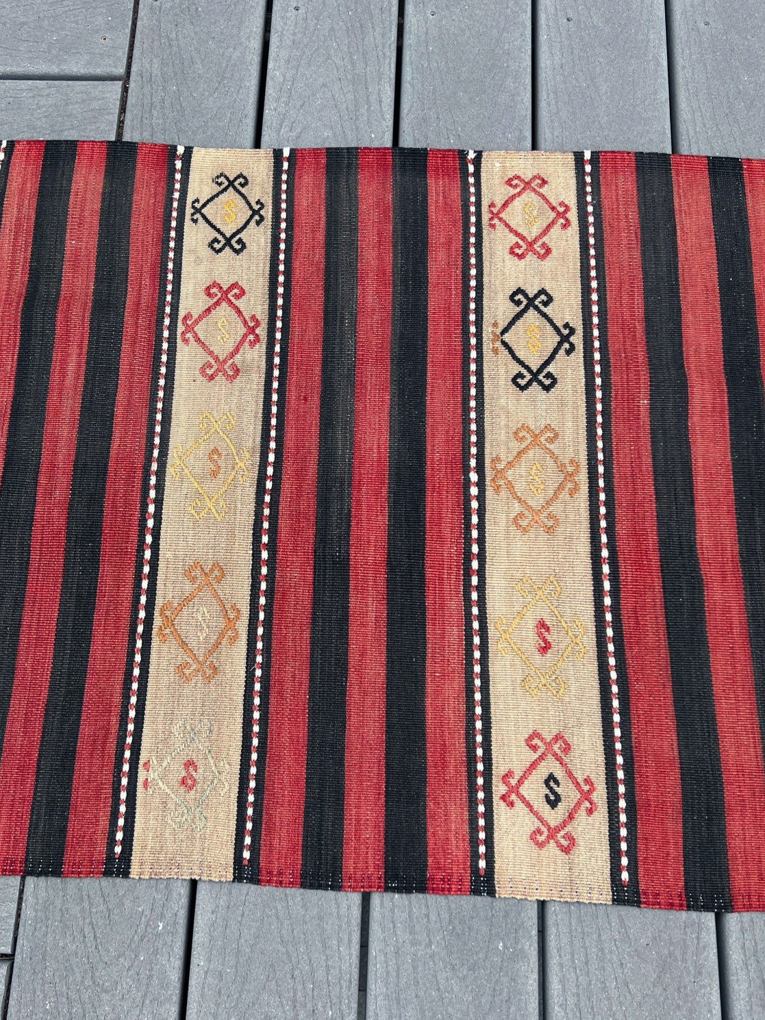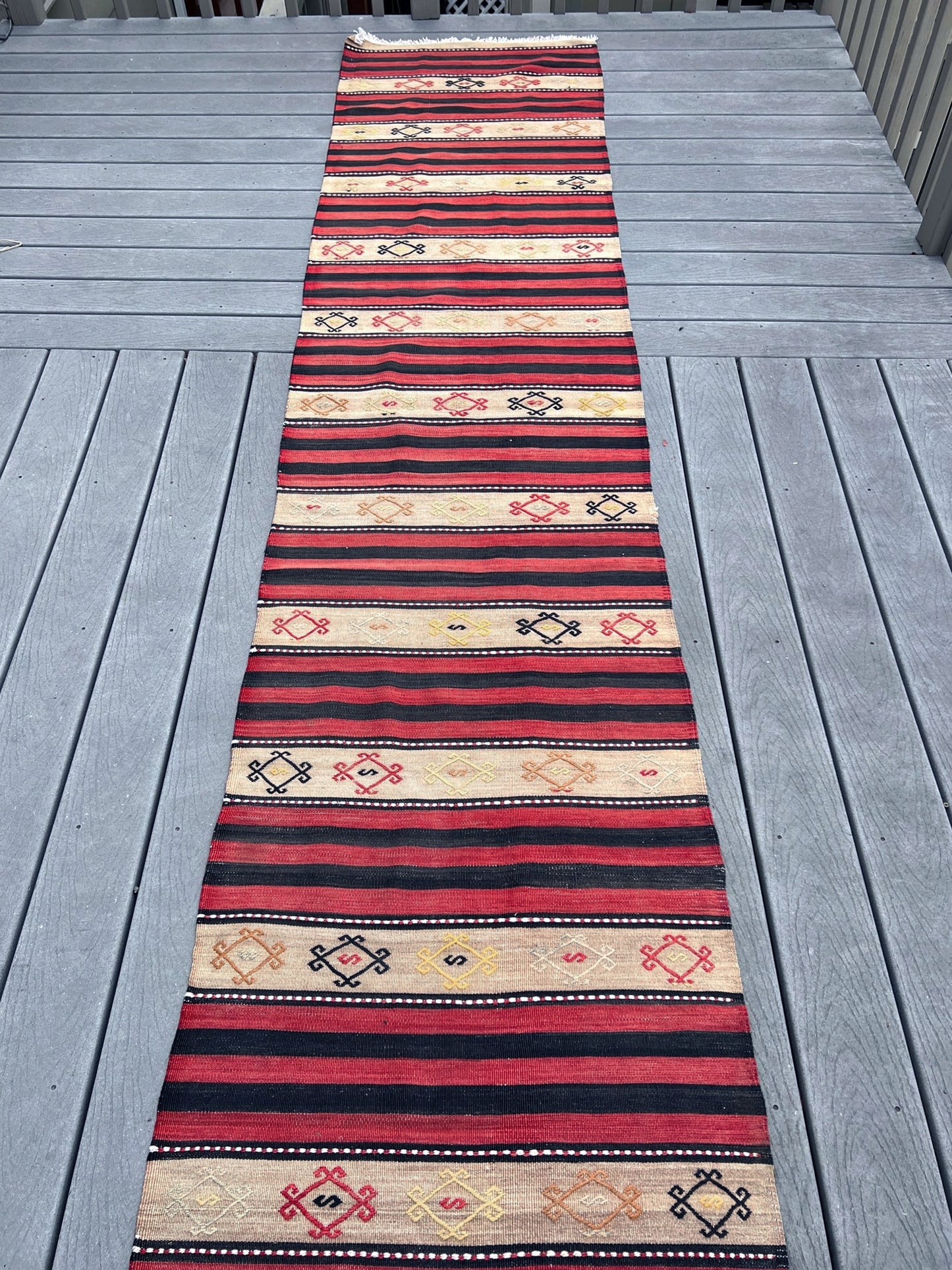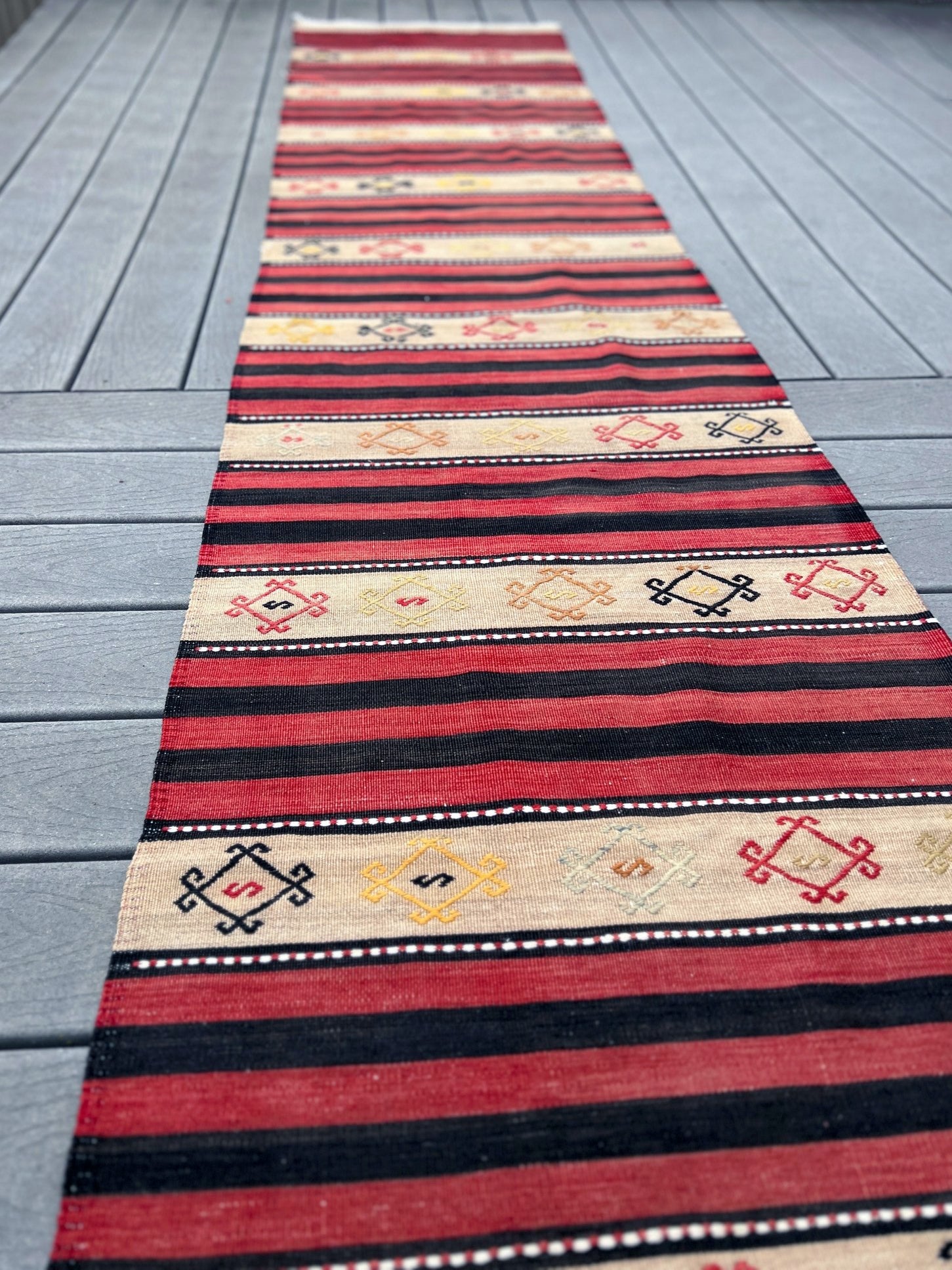 Vintage Turkish Kilim Rug • Handmade Wool Carpet • 12 ft Flatweave Striped Runner for Hallway, Entry, Living Room, Bedroom & Office