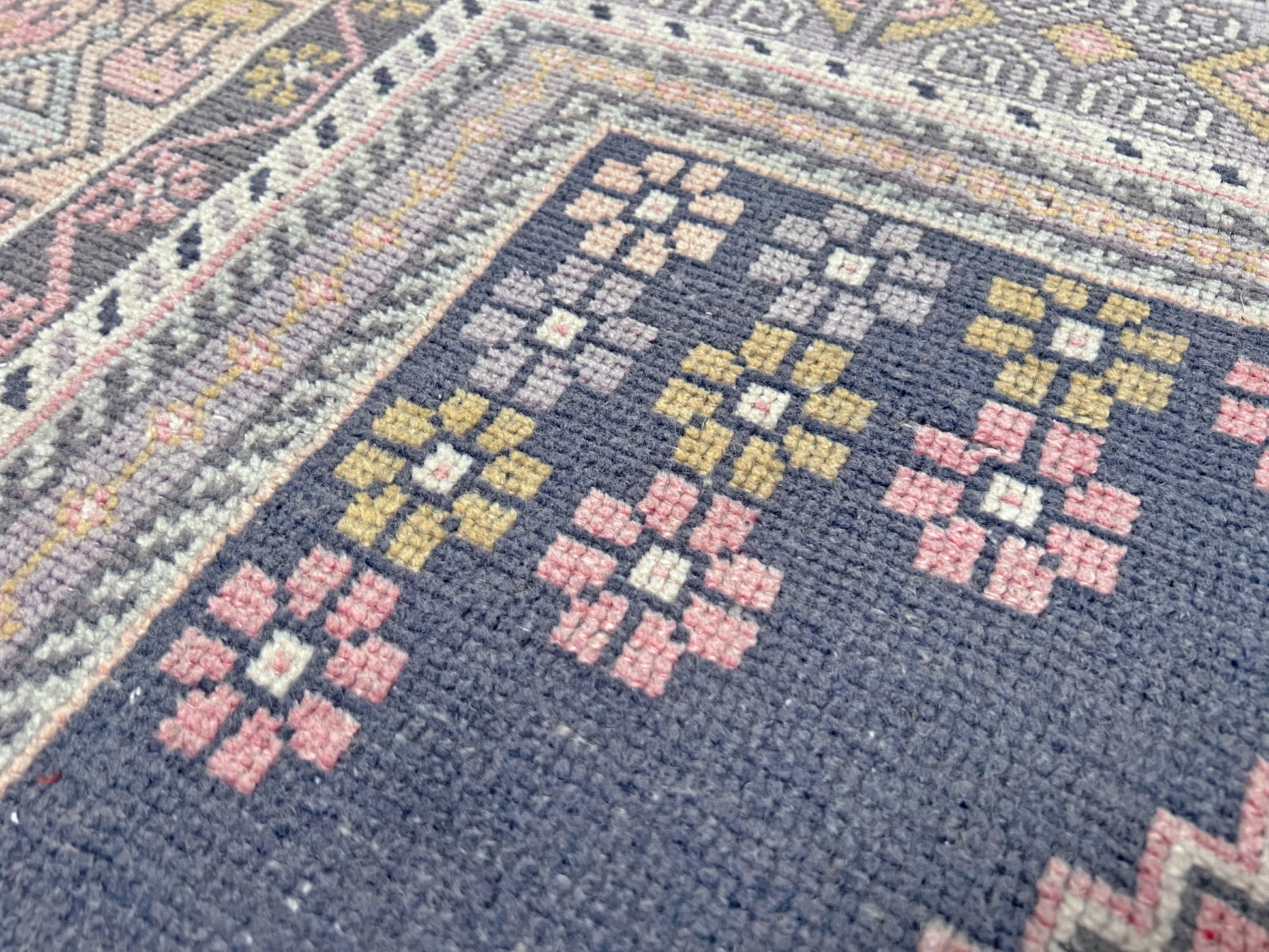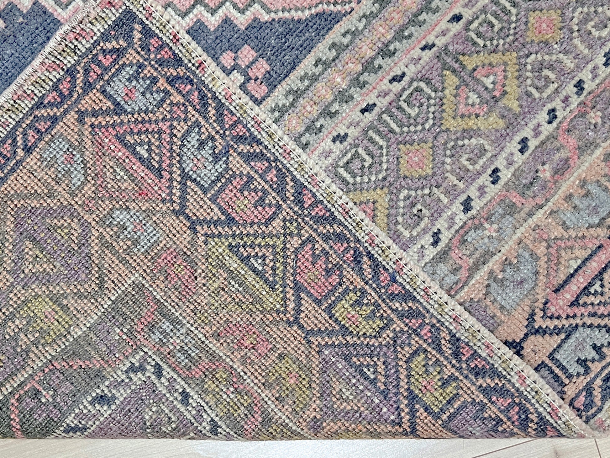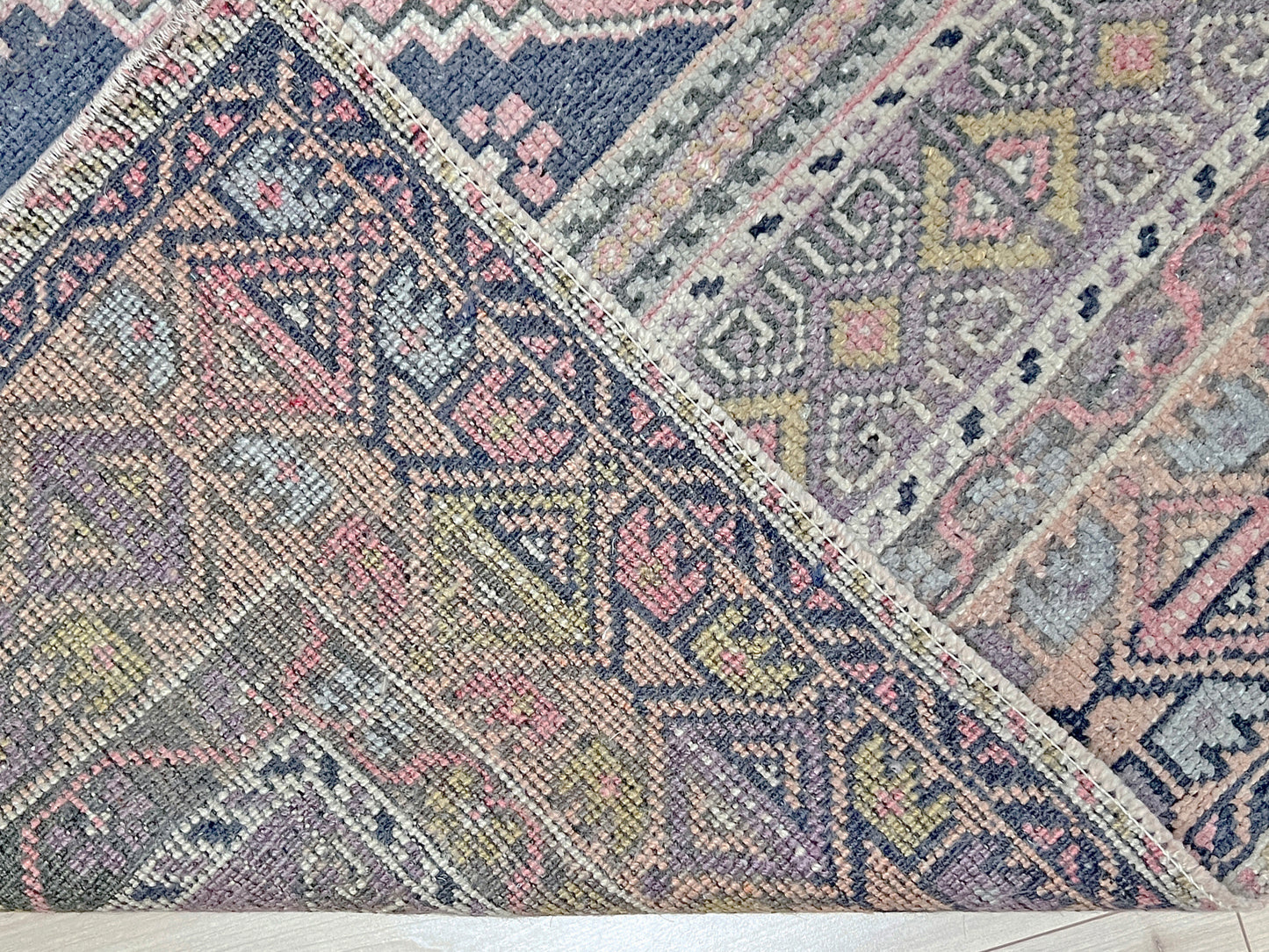 Condition: This rug is in overall excellent condition with a sturdy foundation and full pile. It exhibits a slight discoloration in a small area at one of the corners, seemingly from the washing process. This can be seen in the last picture. Professionally cleaned, it's now primed for your enjoyment.