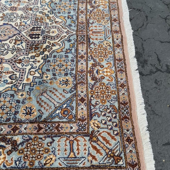 ✔ This hand-knotted Persian Tabriz rug is a serene composition of sky blue, ivory, and warm taupe, woven into an intricate tapestry of floral arabesques and a central medallion. The refined geometry and balanced color transitions evoke the elegance of Persian court weaving while remaining light and livable for modern interiors. The palette—soft blues, golds, and gentle neutrals—feels like a morning sky over Isfahan, lending calmness and sophistication to any setting.