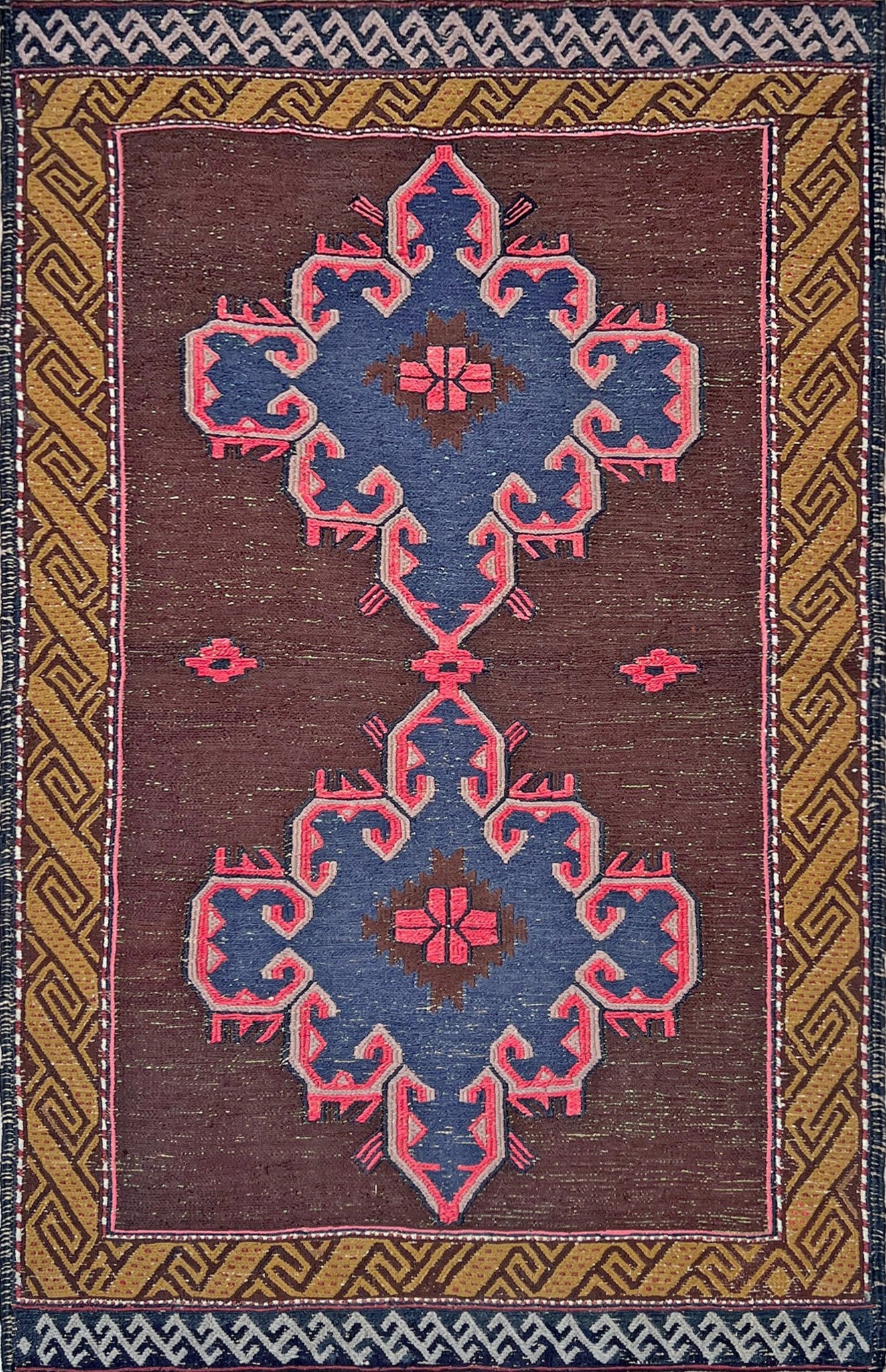 ✔ This vintage Turkish Soumak rug is a study in bold contrasts and ancient symmetry. Deep espresso brown grounds a pair of mirrored medallions in denim blue and fuchsia pink — a palette that feels both grounded and electric. The mustard-gold border, woven with traditional “running meander” motifs, frames the composition with graphic precision.