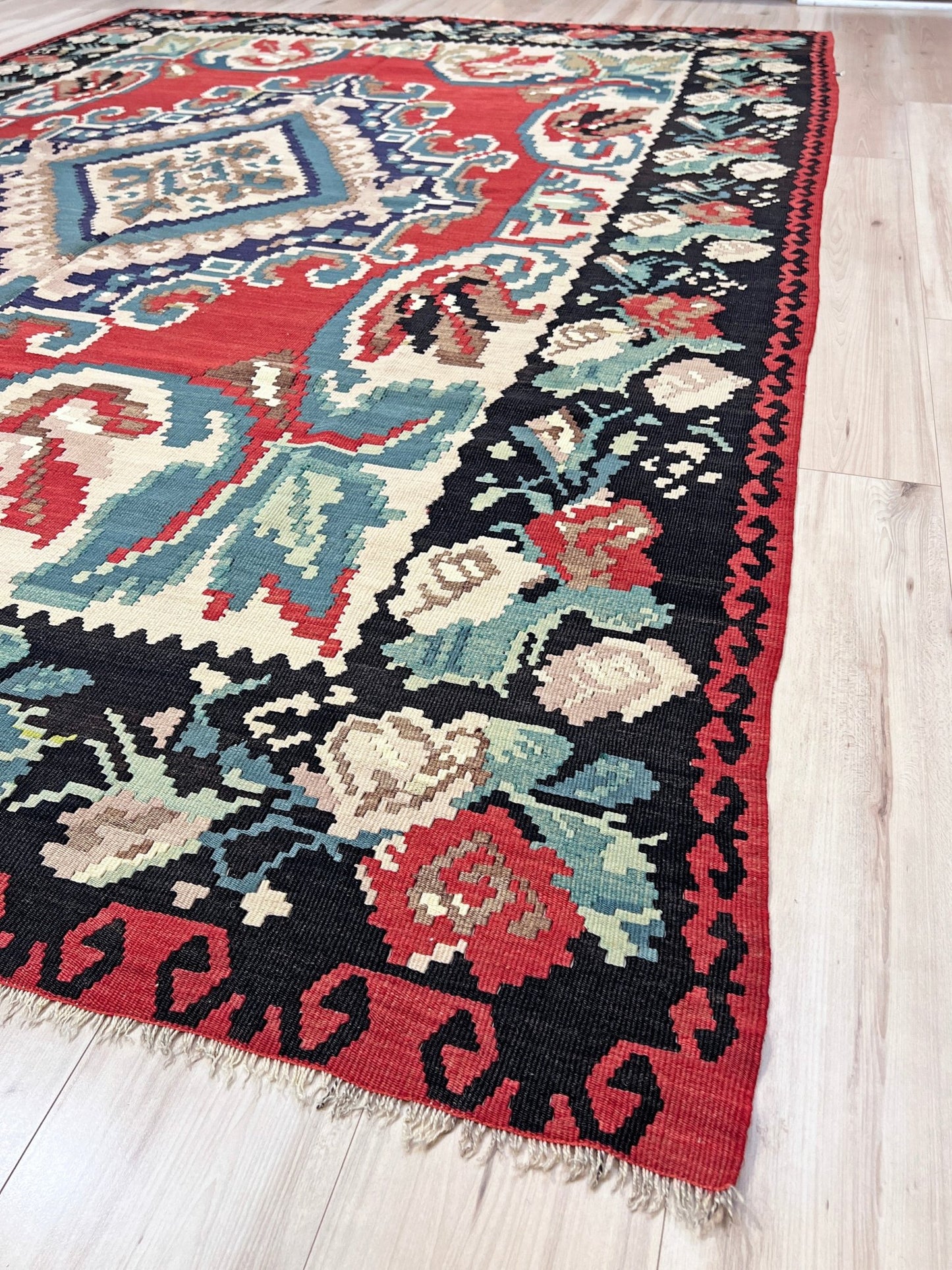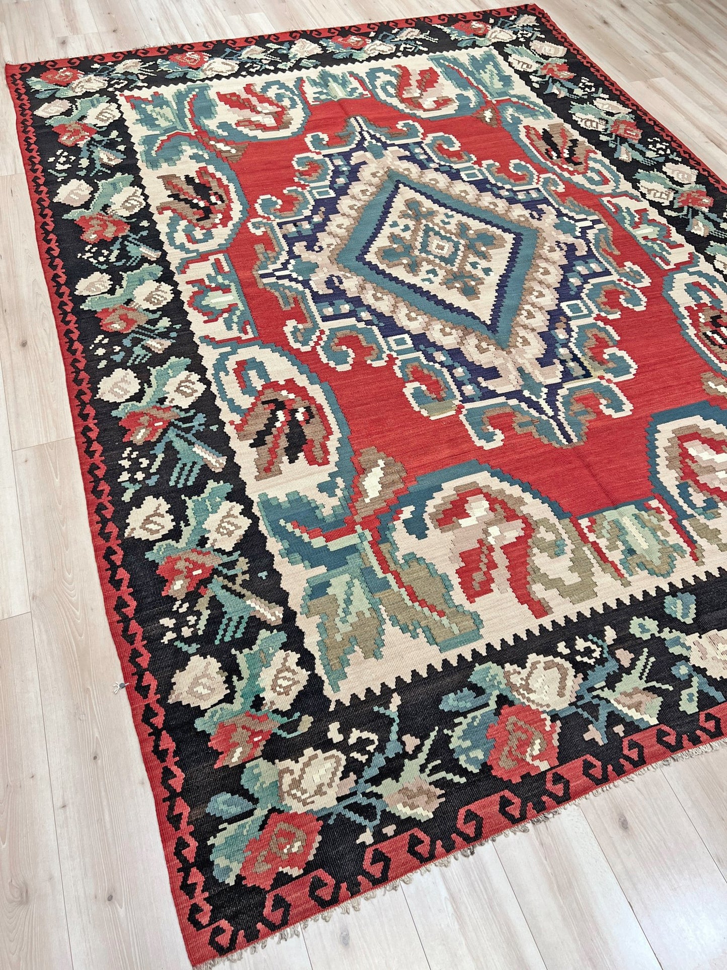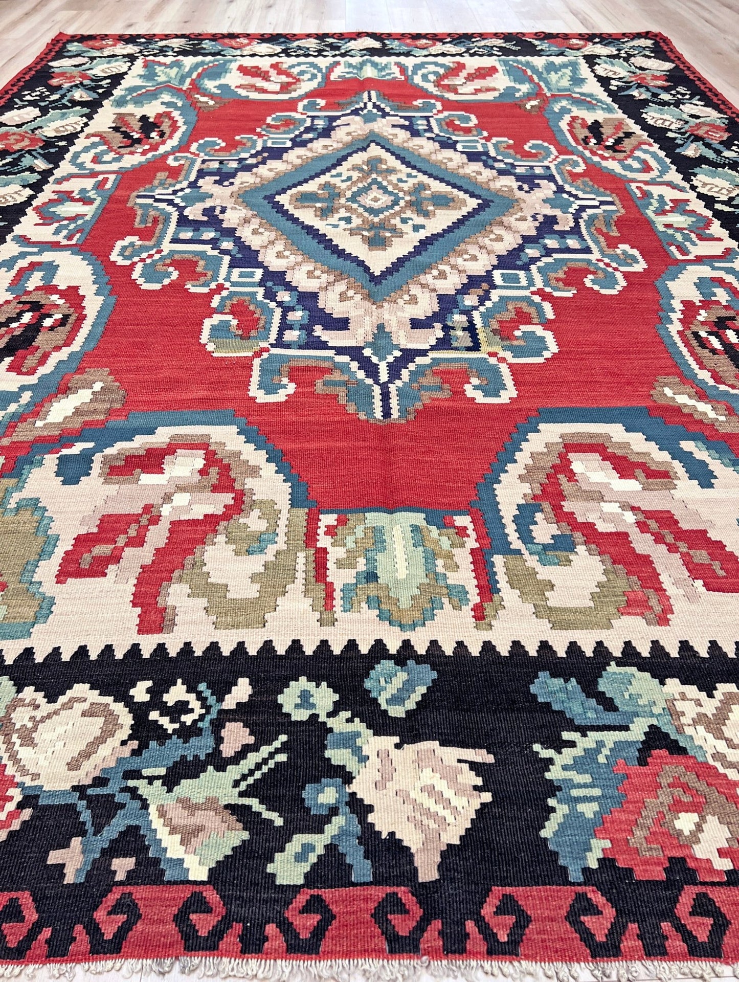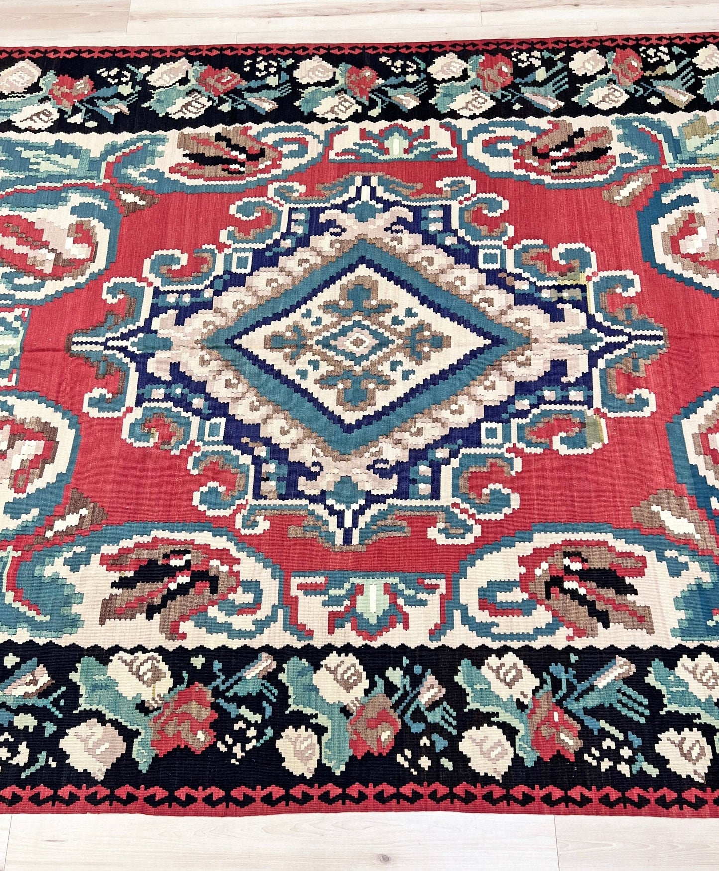 A beautiful Bessarabian rug with a big medallion in the center and row of flowers on the border, which is a classic Kilim design in the Eastern Europe. It is in mint condition.