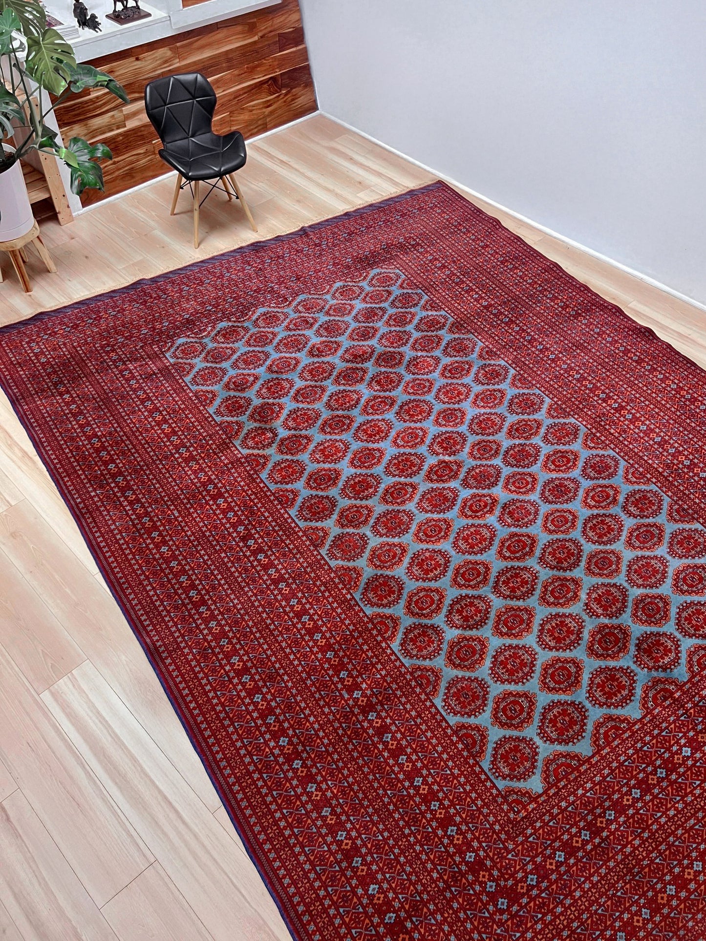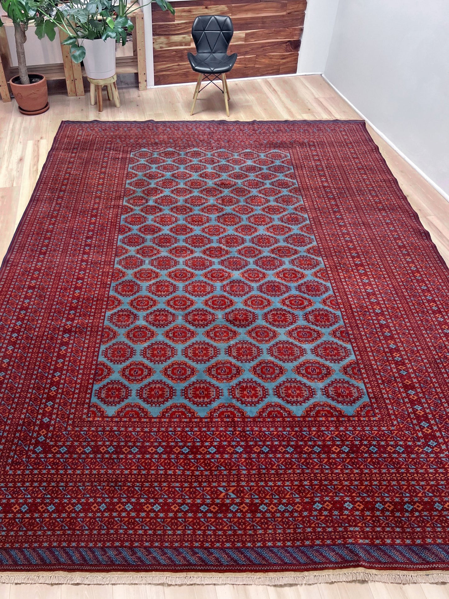 Blue Bukhara Area Rug • Handmade Wool Carpet • 10x14 Extra Large Rug for Living Room, Bedroom, Dining & Office