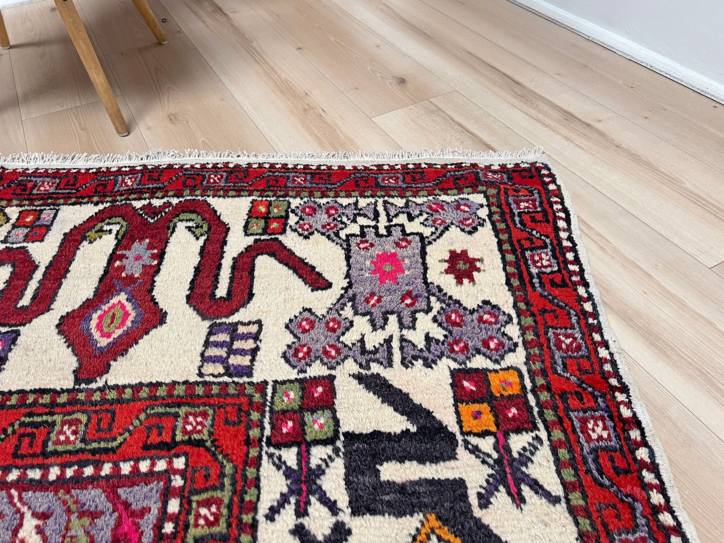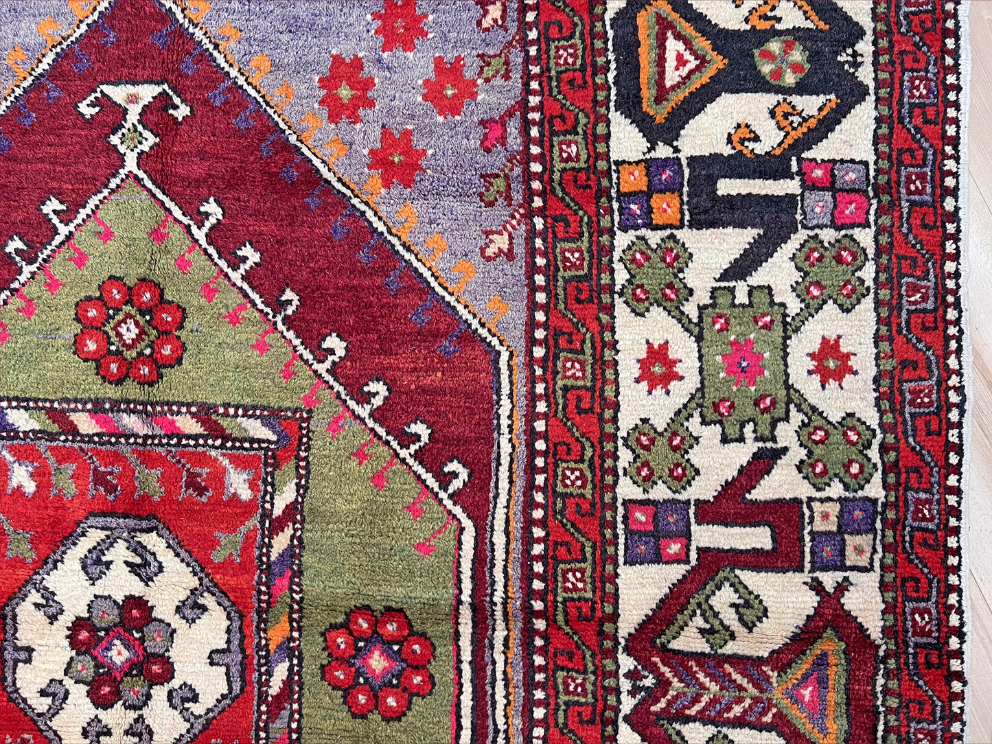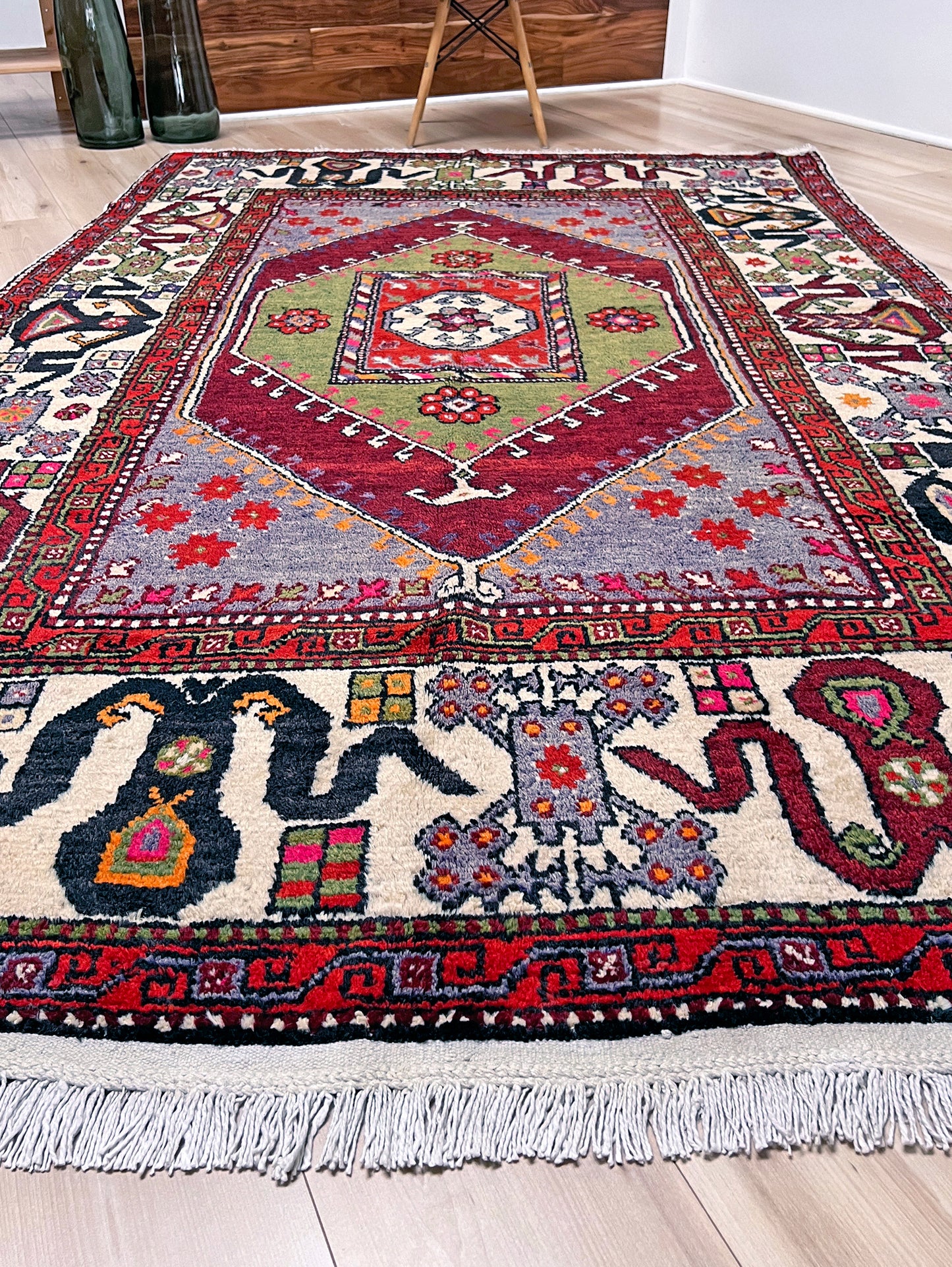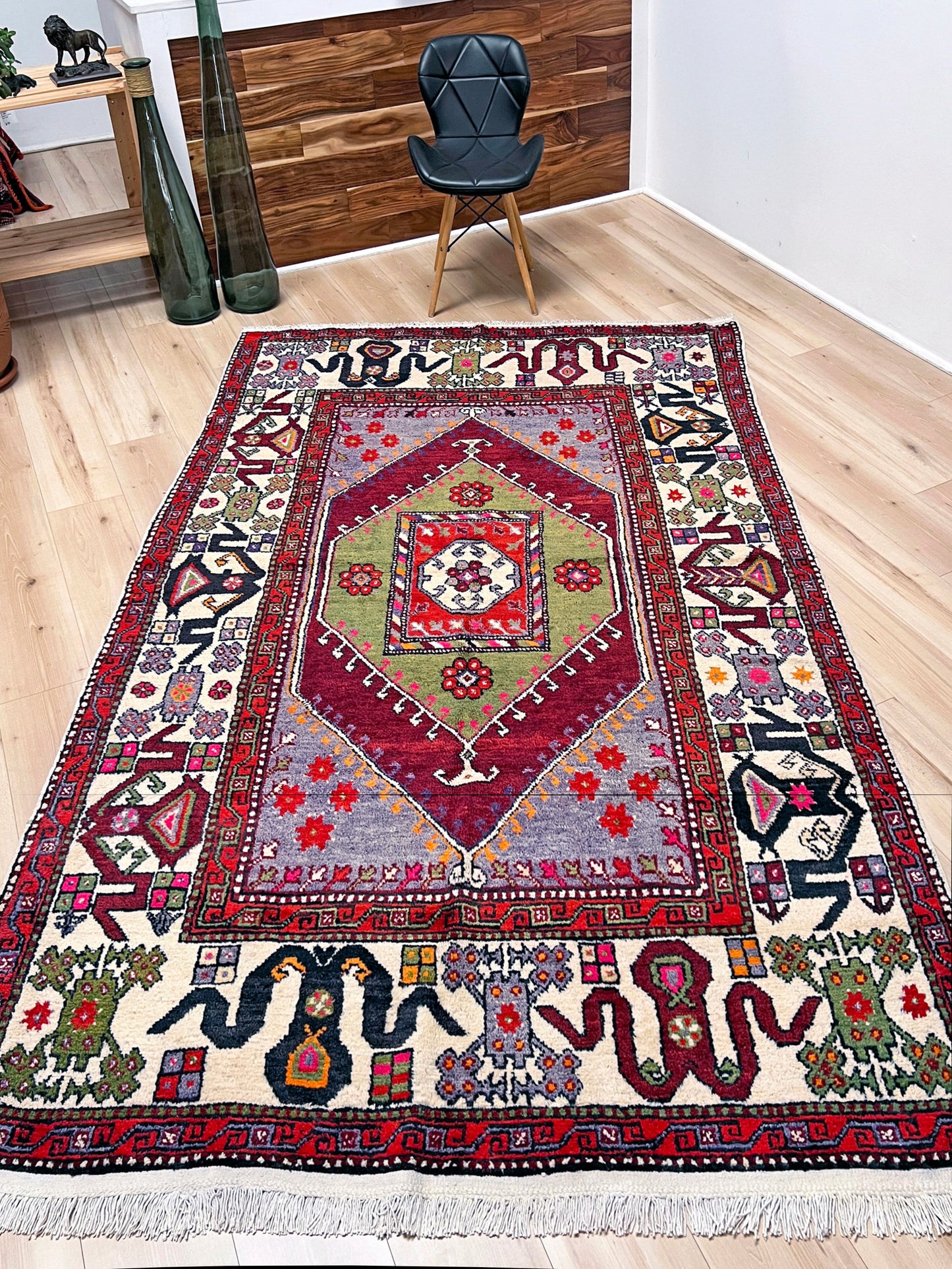 Adorned with a striking border design featuring rare cloudband motifs on a light beige backdrop, this piece exudes sophistication. Meticulously handcrafted from top-quality wool sourced from the esteemed Manisa region of Turkey, it boasts a sturdy cotton foundation for durability. Elevate your space with the timeless elegance of this vintage Turkish rug. Bursting with vibrant hues, it effortlessly commands attention in any room. Experience perfection with this exquisite Turkish rug, a true testament to artistry and quality craftsmanship.