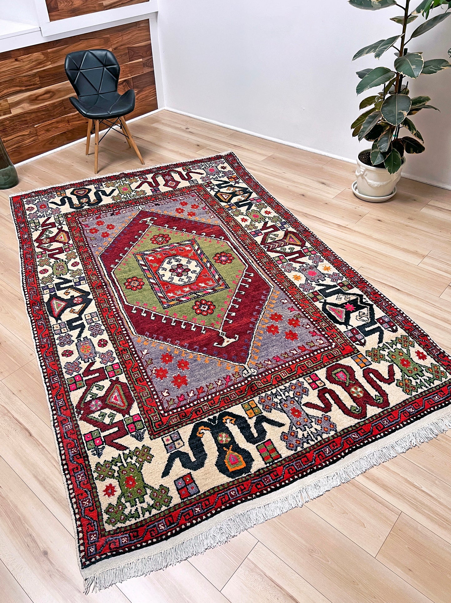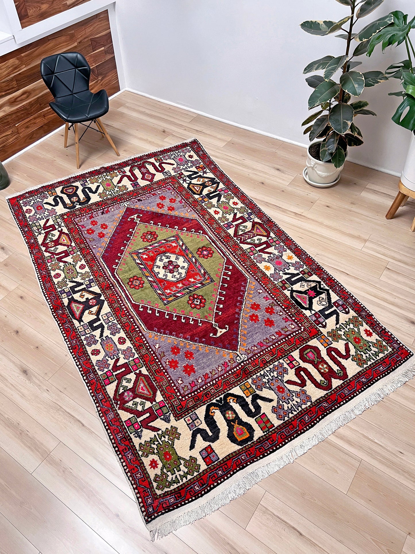 Cloudband Vintage Turkish Rug • Handmade Wool Carpet • 6x8 ft Rug for Boho Living Room, Bedroom, Dining, Kitchen, Study & Nursery