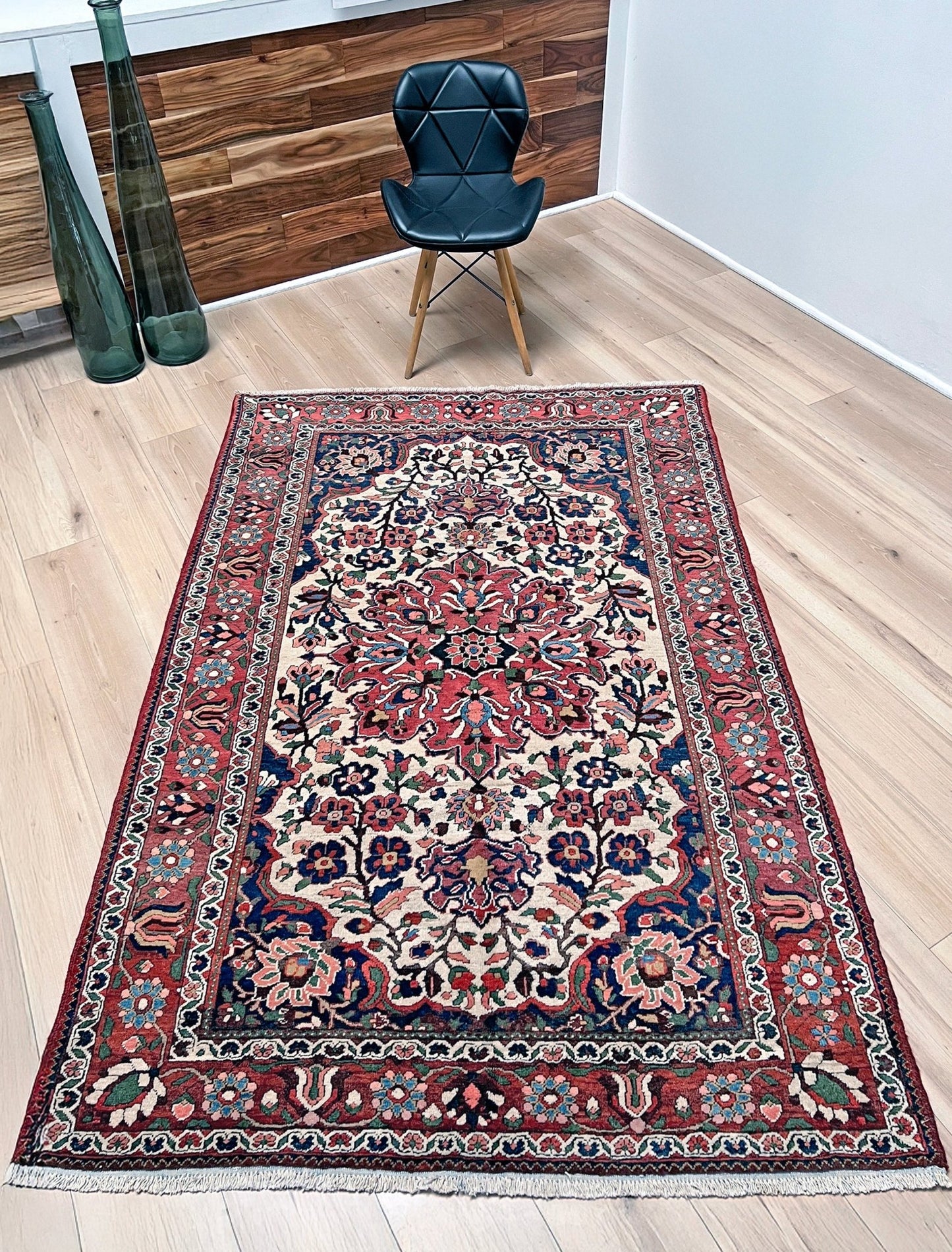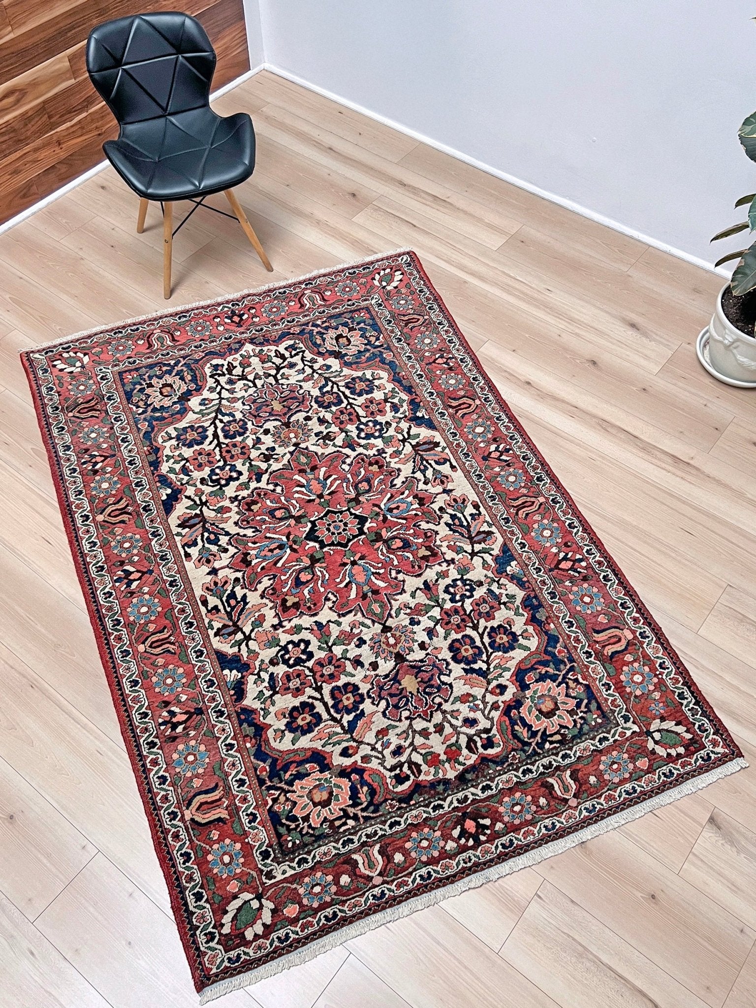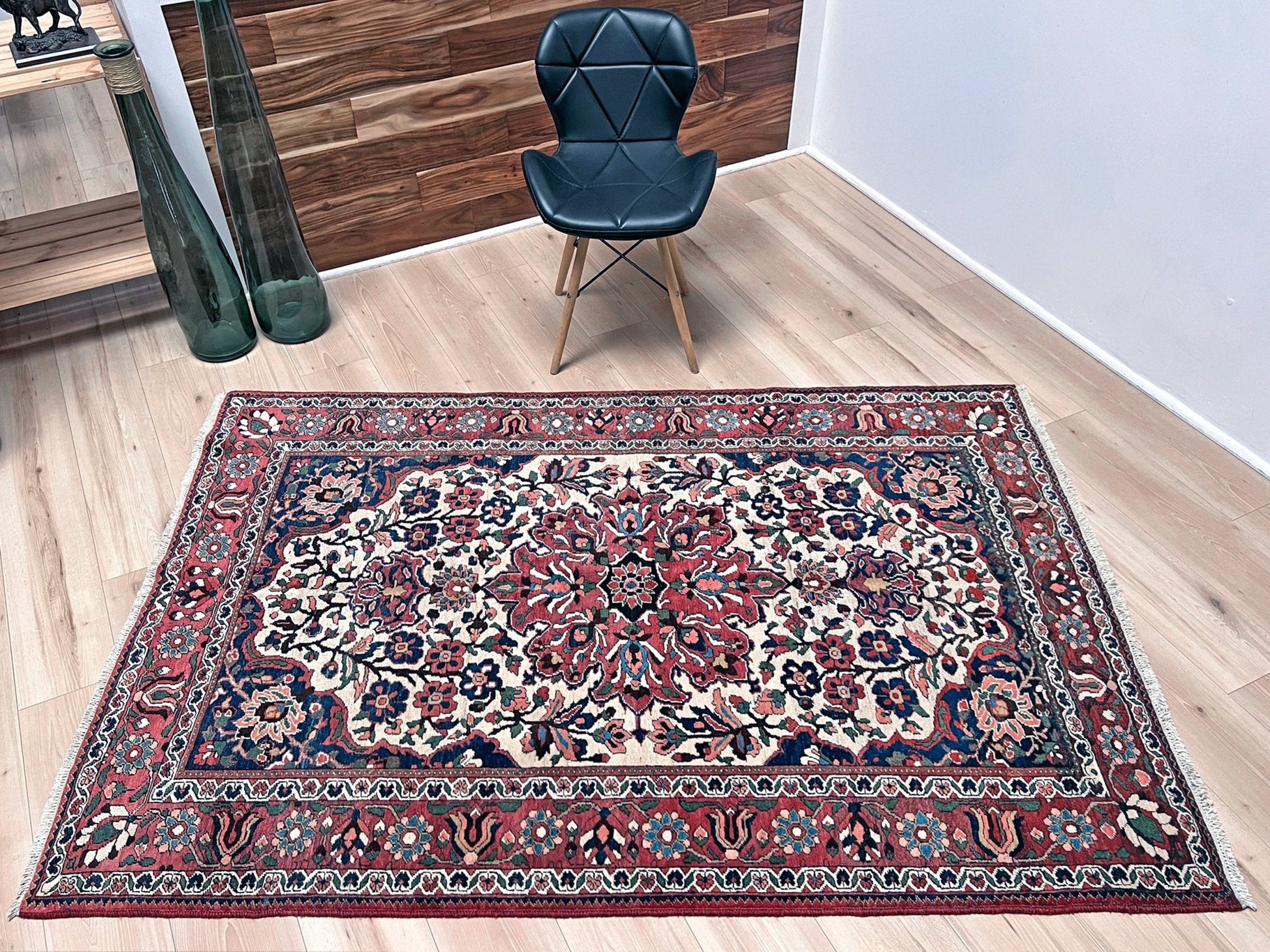 Floral Bakhtiari Vintage Persian Rug • Handmade Wool Carpet • 5x7 Scatter Rug for Living Room, Bedroom, Dining, Kitchen, Study & Office