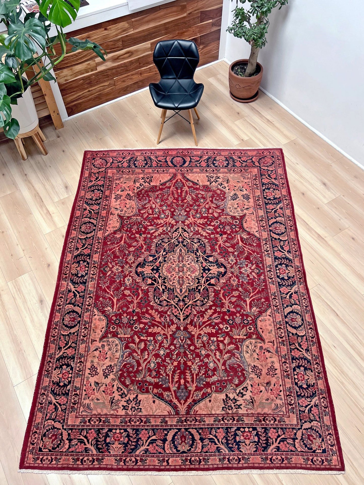 Red Kayseri Vintage Turkish Rug • Handmade Wool Carpet • 7x9 Floral Rug for Living Room, Bedroom & Dining