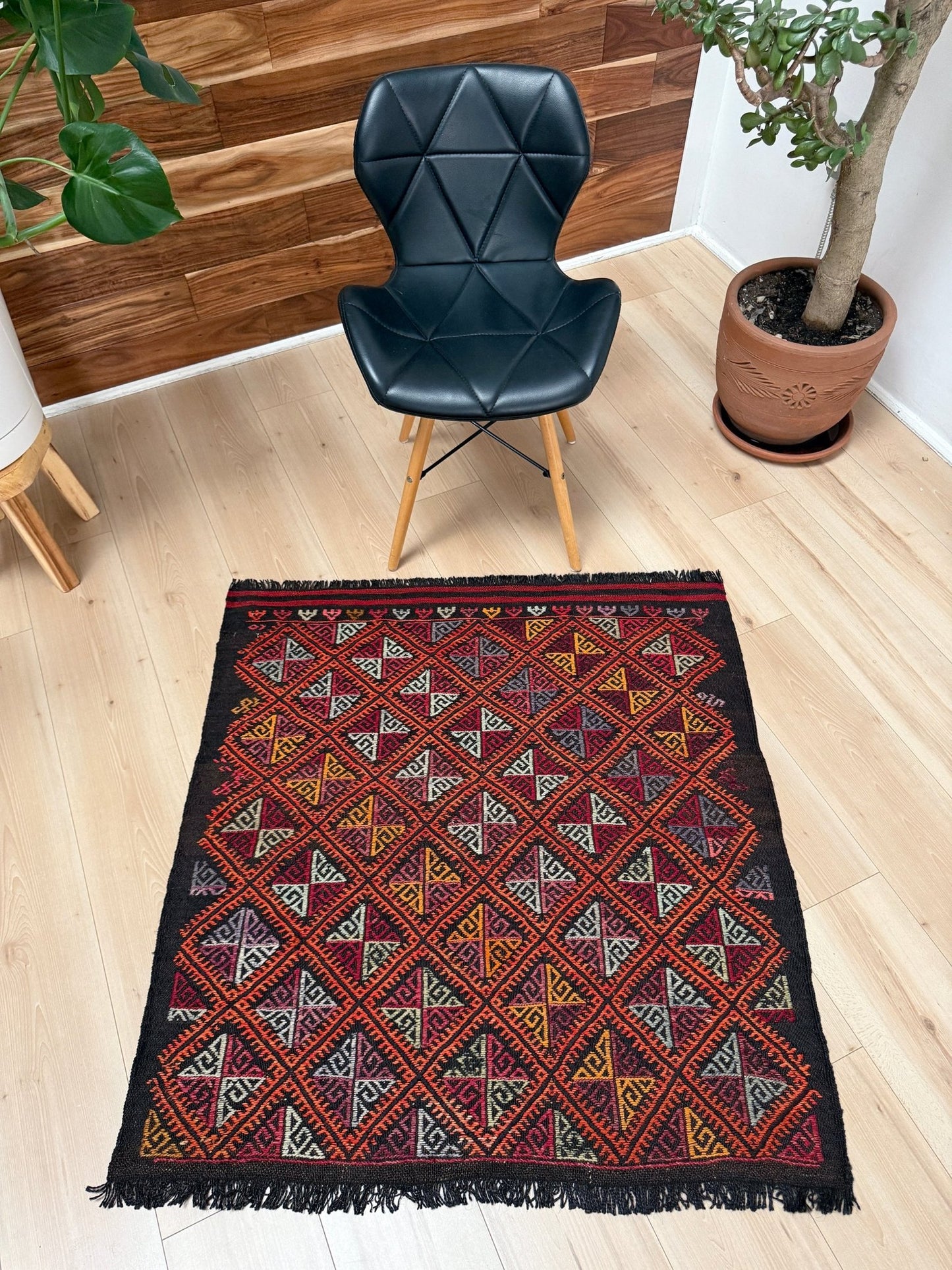 Vintage Turkish Kilim • Handmade Wool Carpet / Wall Art • 3x4 Flatweave Scatter Rug for Entryway, Bedroom, Kitchen & Study