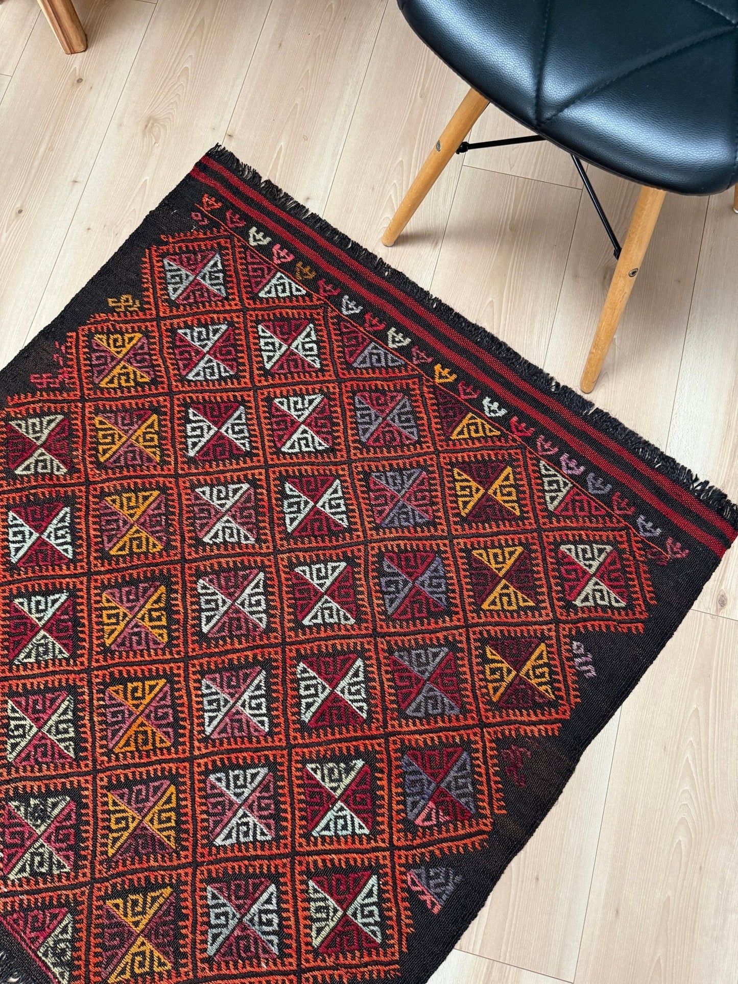 Charcoal & Orange Malatya Cicim Kilim • Vintage Handmade Rug / Wall Art (3'3" x 3’6")