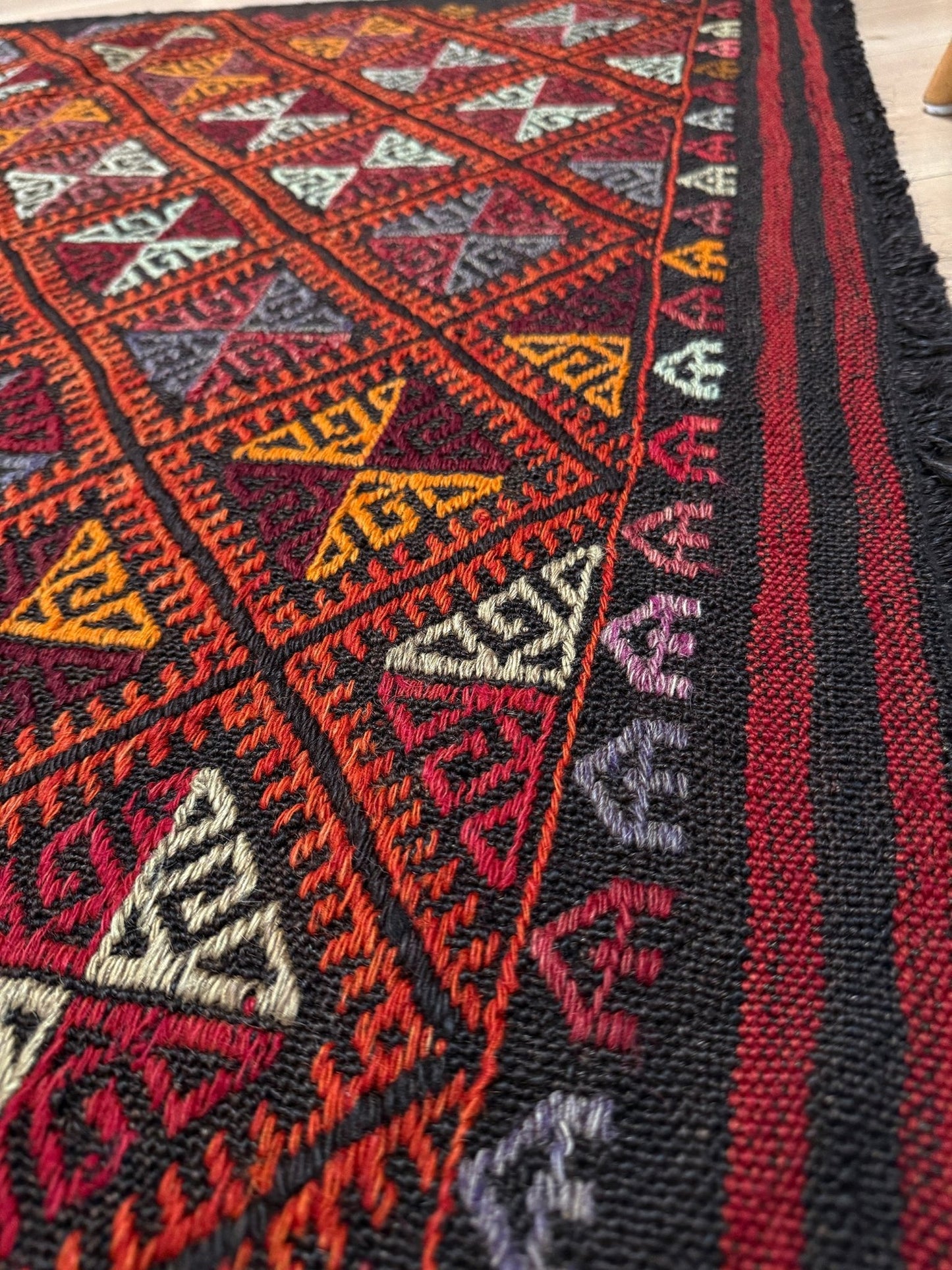 The richly layered palette of crimson red, burnt orange, violet, saffron yellow, mint green, ivory, and charcoal is derived from natural plant-based dyes, now softly mellowed with age. Its rhythmic structure, fine texture, and embroidered dimension give this piece depth and presence far beyond its compact size. Perfect as a wall hanging, tabletop textile, or accent rug, it brings history, energy, and handmade soul into any setting.