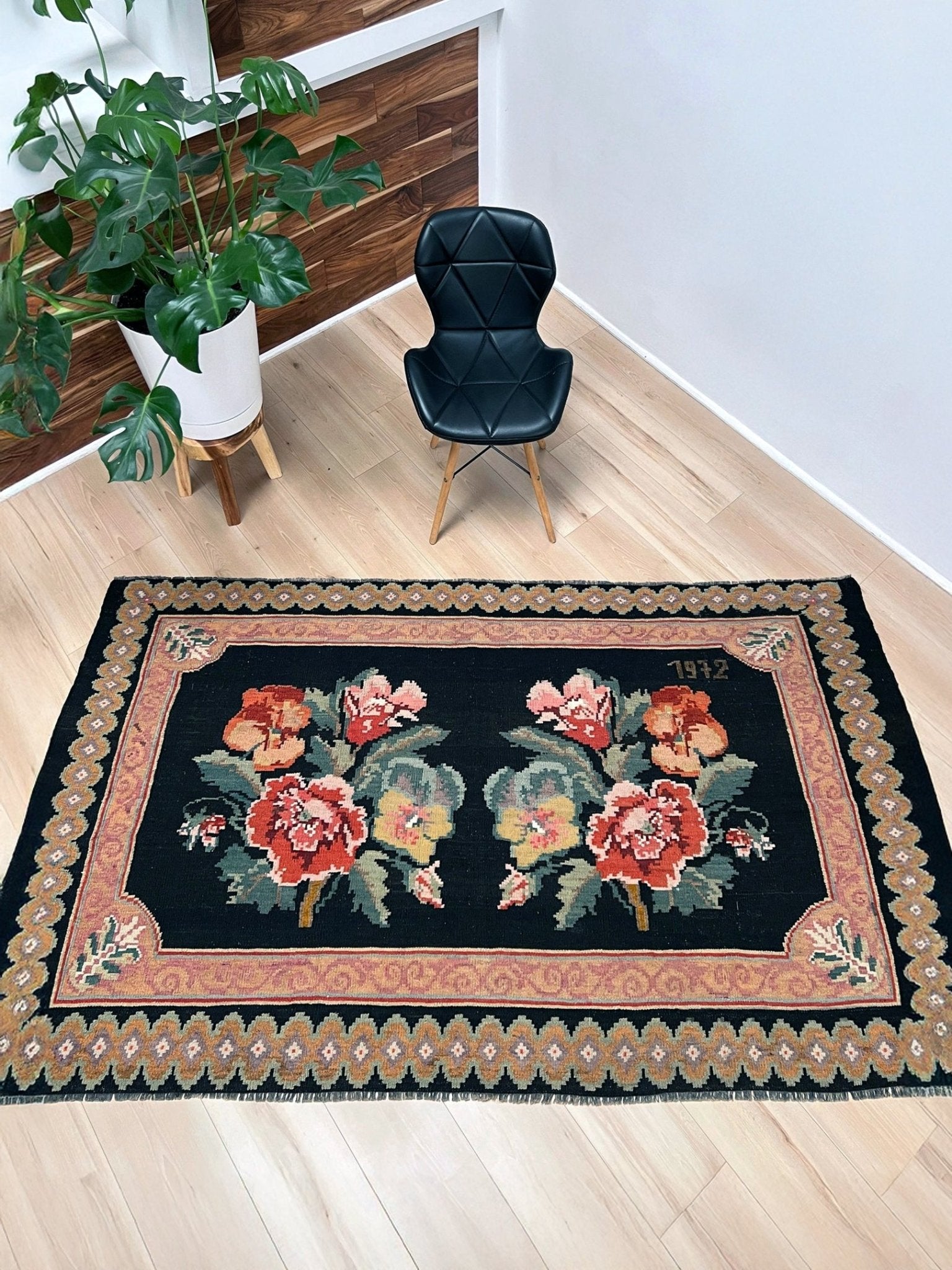 Rose Kilim Moldovan Vintage Rug • Handmade Wool Carpet Wall Hanging • 4x7 Flatweave Rug for Living Room, Bedroom, Dining, Kitchen & Nursery