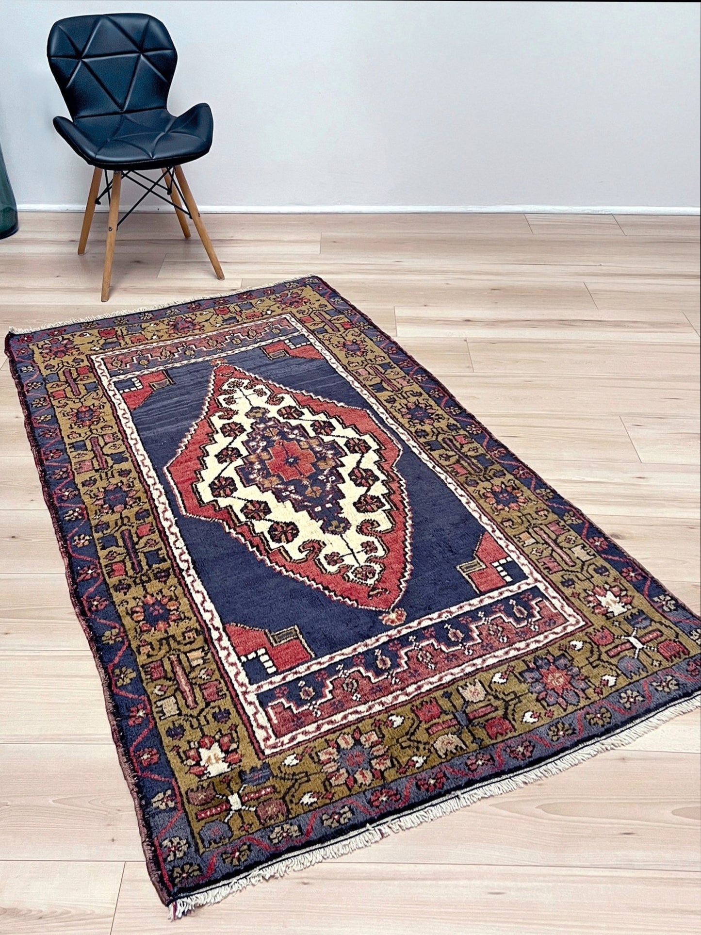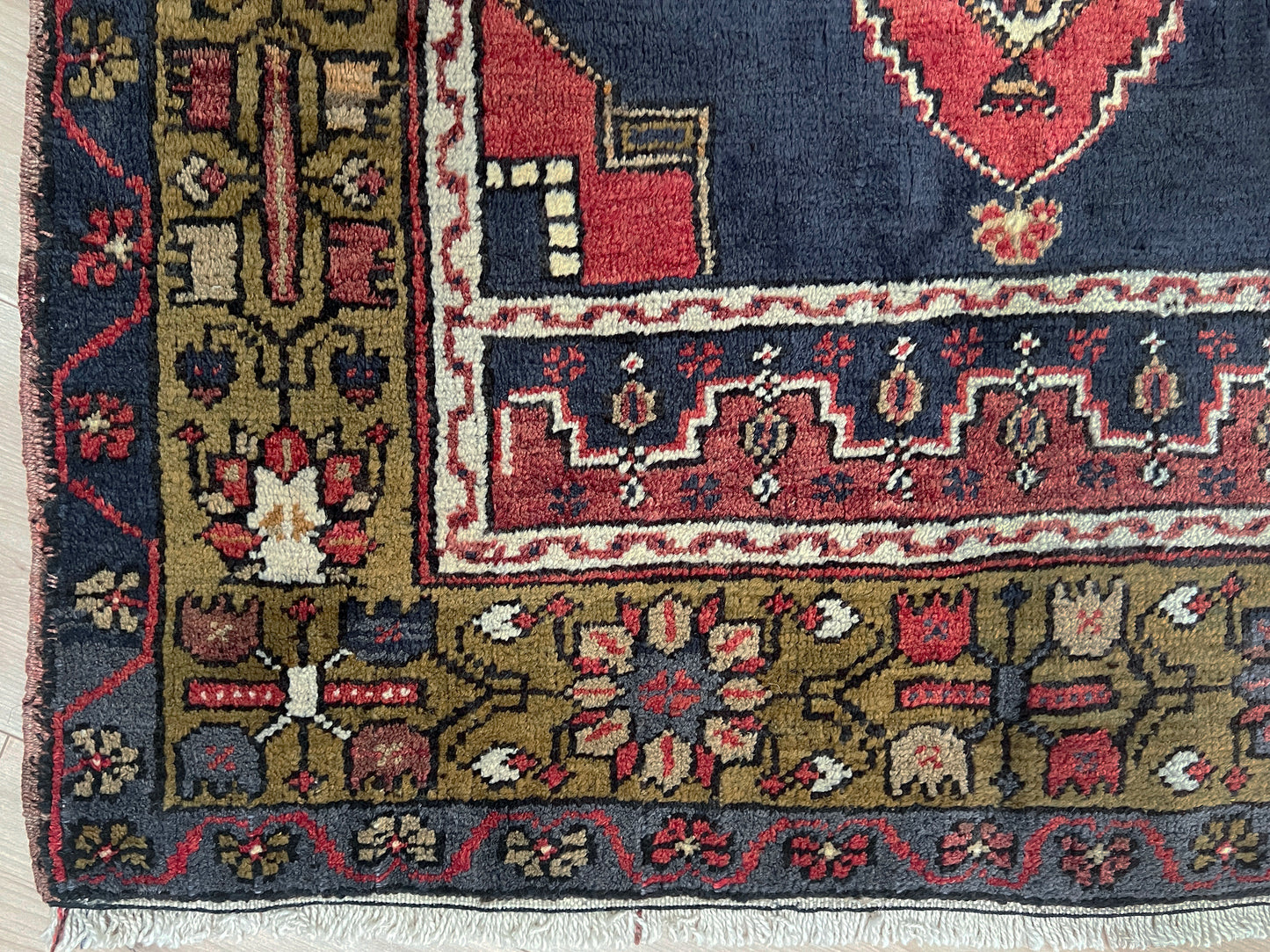 â  This vintage Taspinar rug from central Anatolia captures the soul of Turkish village weaving in its purest form. Hand-knotted in the mid-20th century, it features a bold central medallion framed by a dramatic indigo blue field and warm brick-red spandrels, all bordered by golden olive vines and floral motifs.