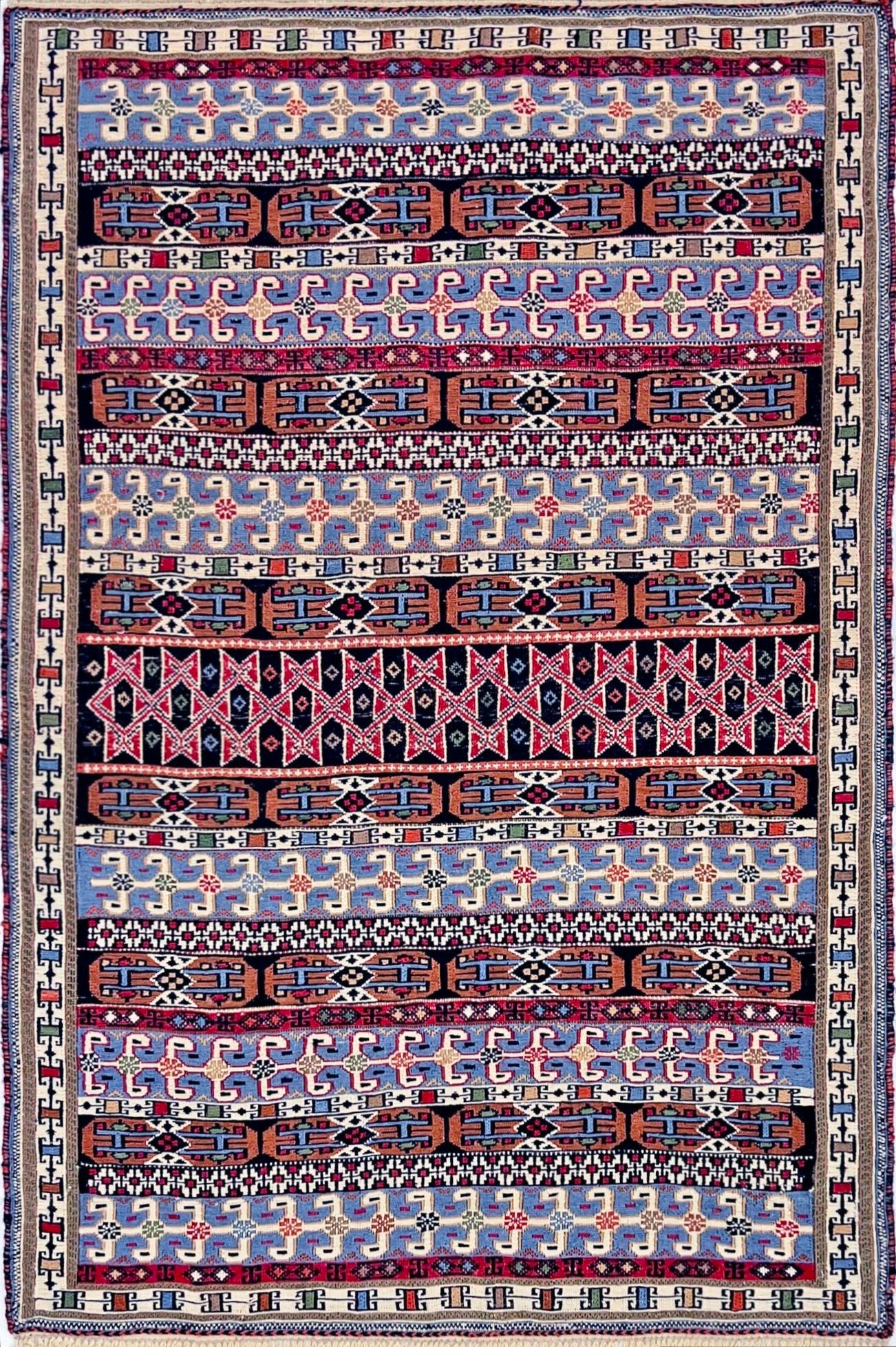 ✔  Traditionally crafted by semi-nomadic artisans spanning the regions of Northwest Iran and Eastern Turkey, these exquisite rugs, known as Soumak, distinguish themselves from their Kilim counterparts. Their front displays a captivating design, while the reverse side bears an intricately woven construction, a testament to their handmade craftsmanship. The distinctive pattern they feature is referred to as Rahrah, and their production involves the use of special hooks and needles, lending them their distinctive character. These rugs proudly showcase a repertoire of distinctive geometric motifs, including central diamonds, crosses, eyes, and depictions of animals, all imbued with profound symbolism that reflects the nomadic way of life.