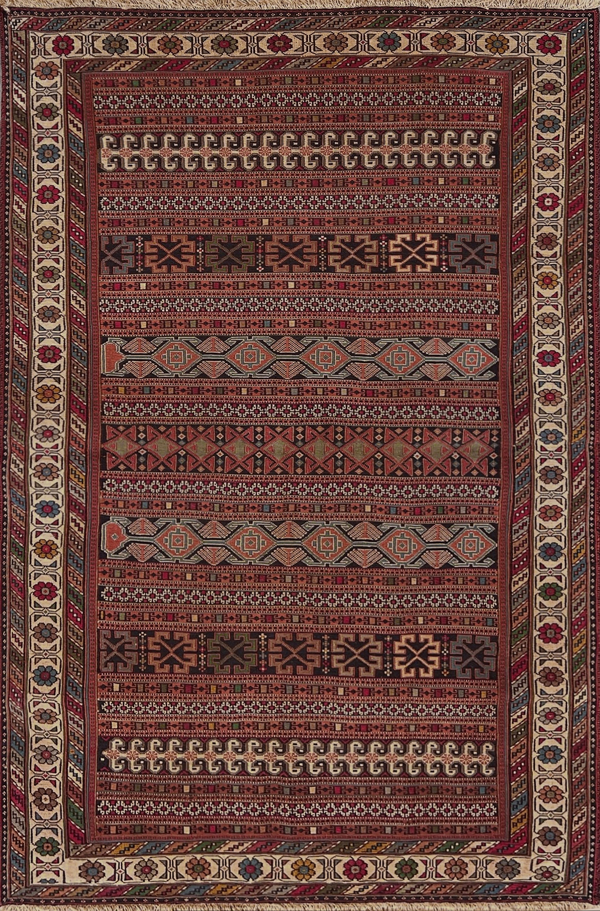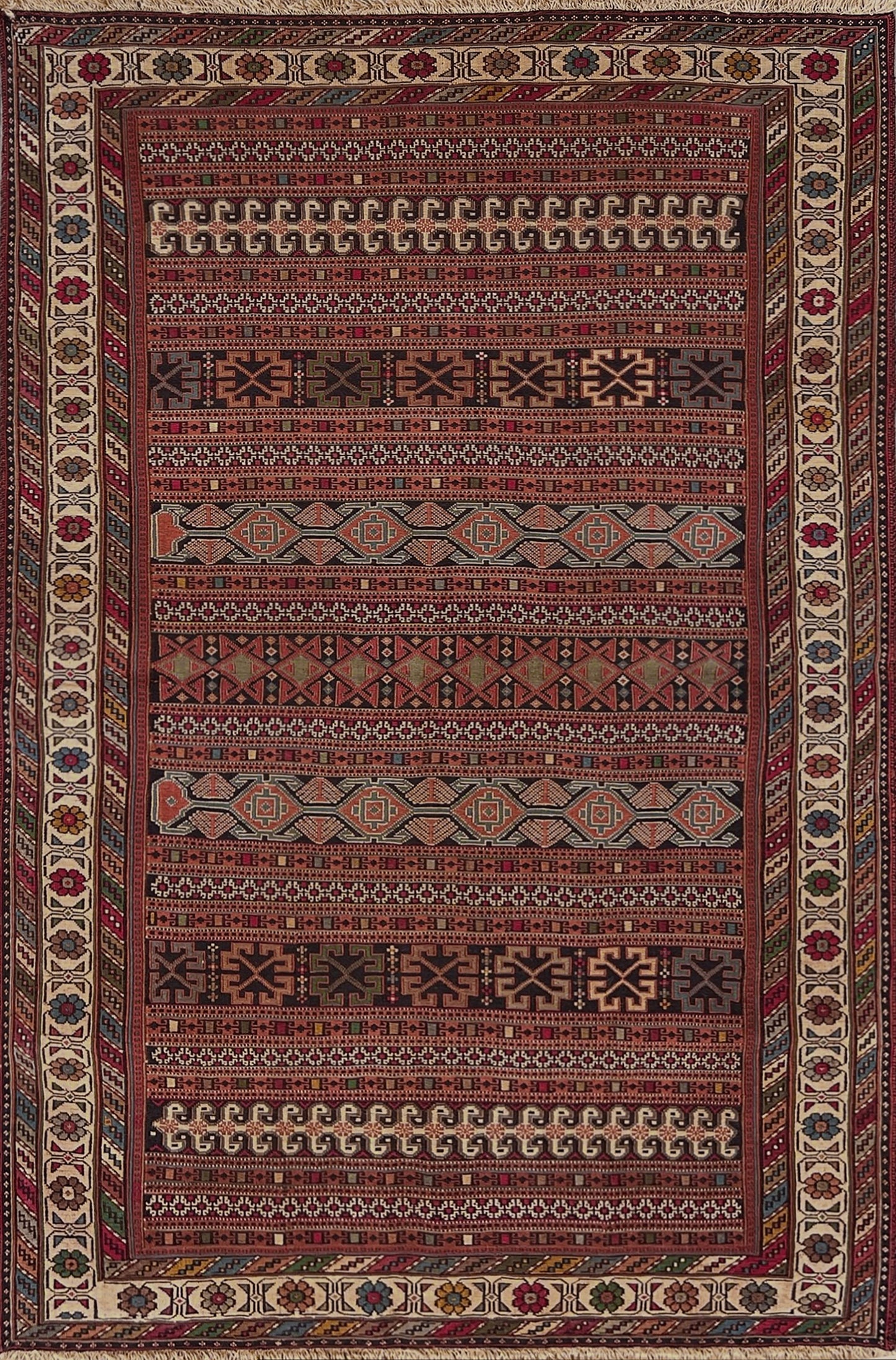 The palette glows in terracotta and rust, softened by touches of olive green, indigo blue, walnut brown, and ivory. The floral border frames the composition beautifully, lightening the dense geometry of the field and adding a lyrical balance.
