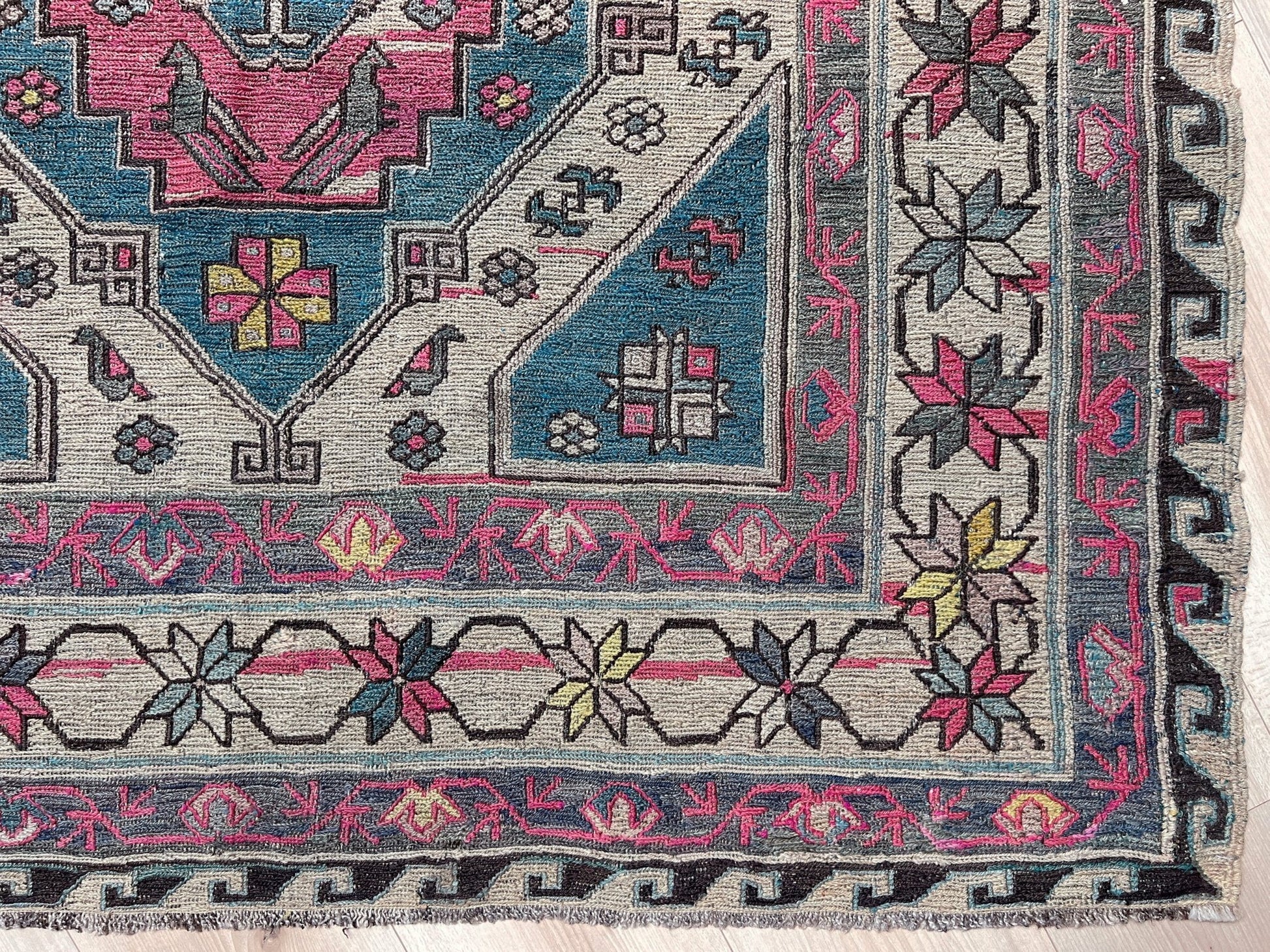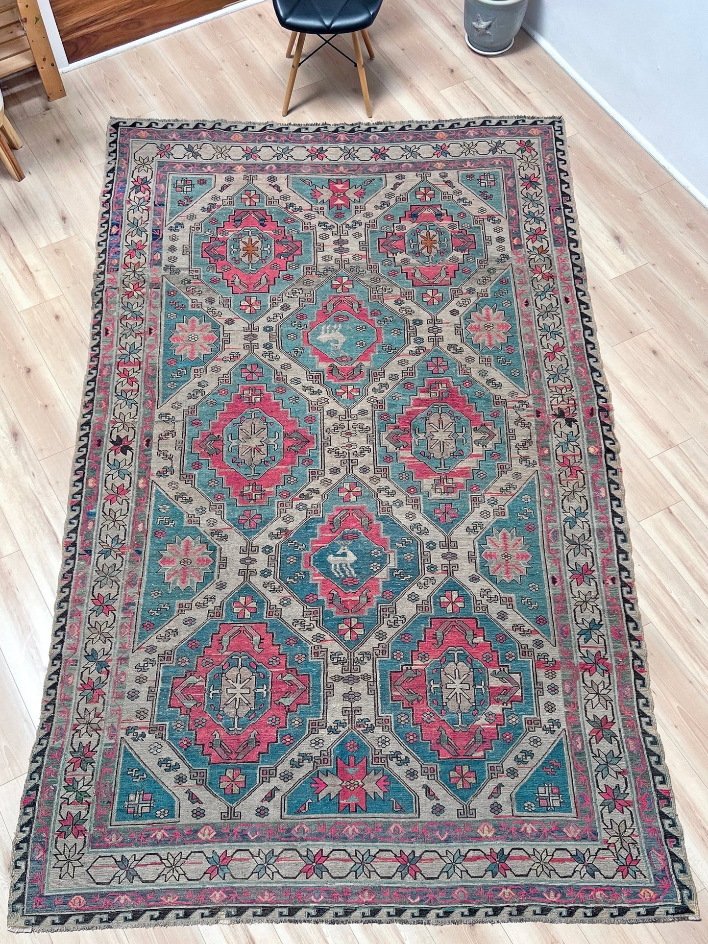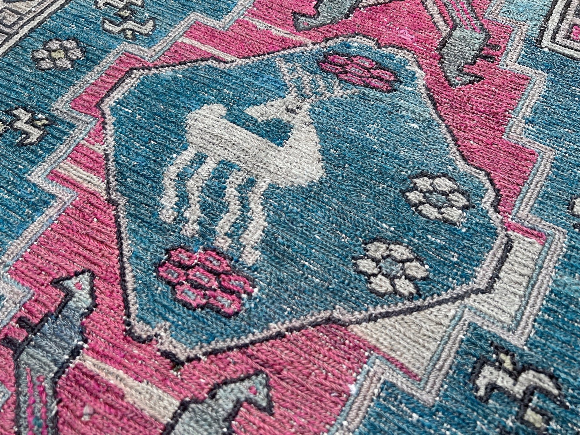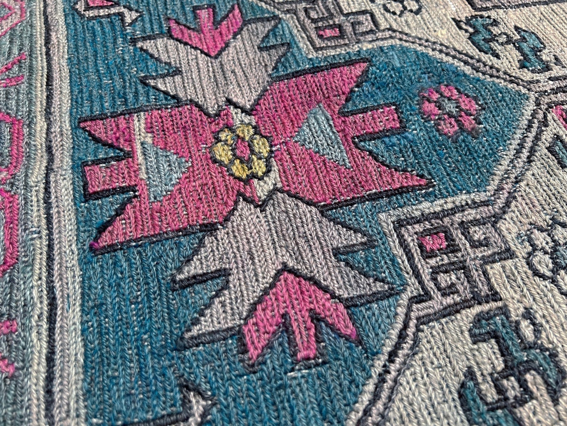 This exquisite handmade Caucasian Soumak rug is meticulously woven in the traditional style, showcasing a captivating tribal design that adds a wild and distinctive aesthetic. Vintage from the 1940s, this rug features a striking teal and hot pink color combination, which is very rare. Crafted from hand-spun wool and dyed with natural vegetable pigments, the rug has aged beautifully, with its colors developing a rich, faded patina over time.