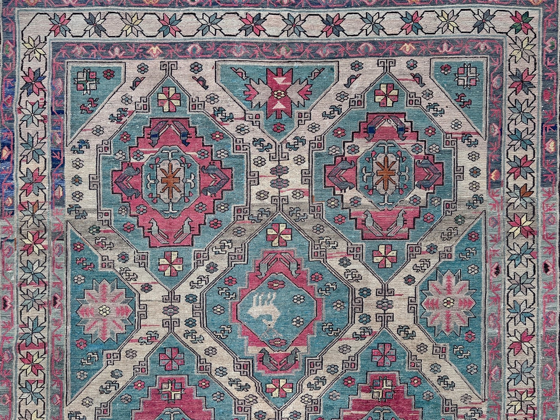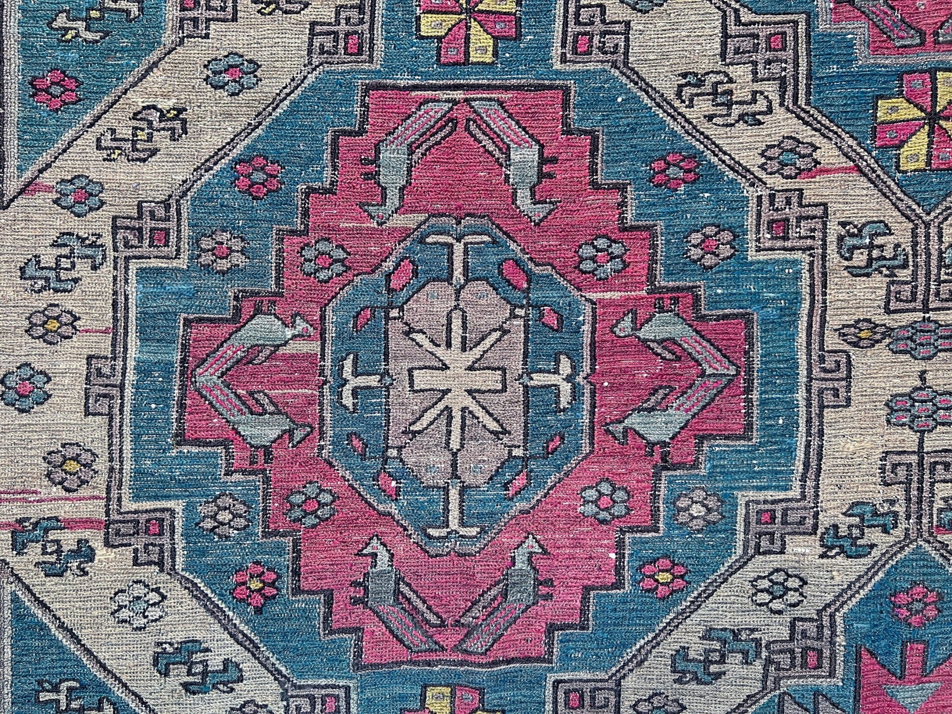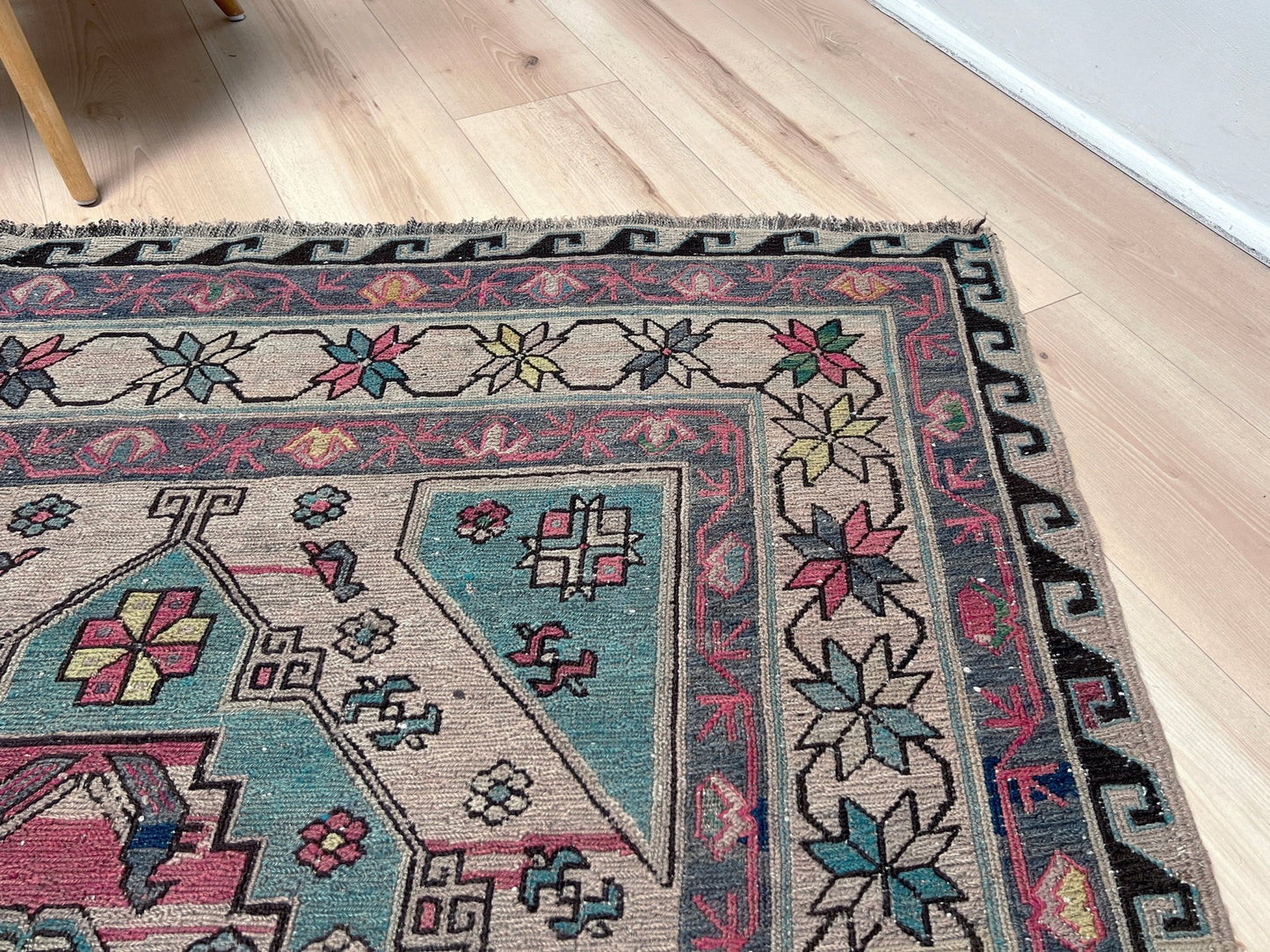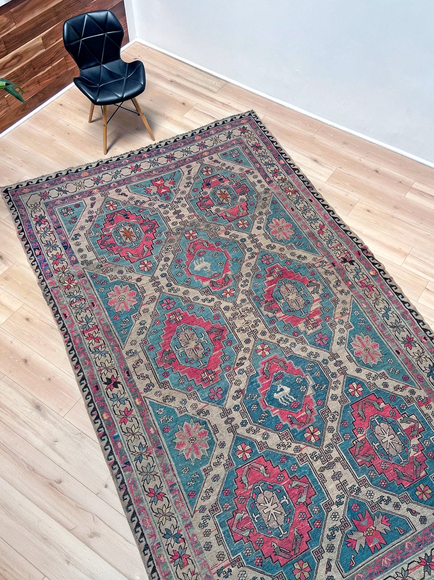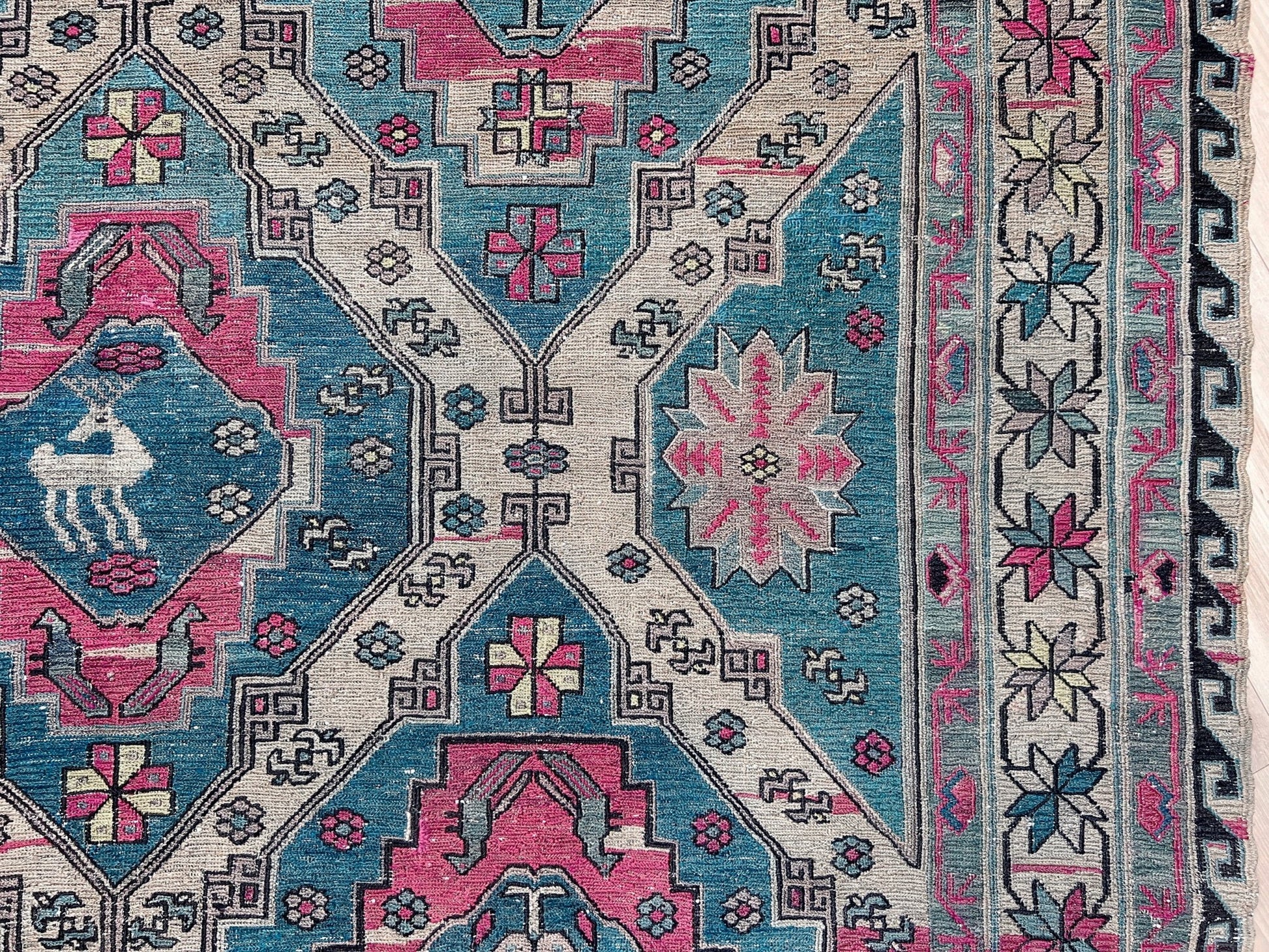 This exquisite handmade Caucasian Soumak rug is meticulously woven in the traditional style, showcasing a captivating tribal design that adds a wild and distinctive aesthetic. Vintage from the 1940s, this rug features a striking teal and hot pink color combination, which is very rare. Crafted from hand-spun wool and dyed with natural vegetable pigments, the rug has aged beautifully, with its colors developing a rich, faded patina over time.