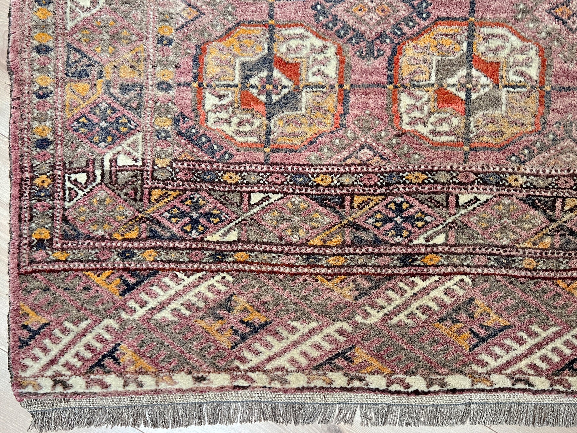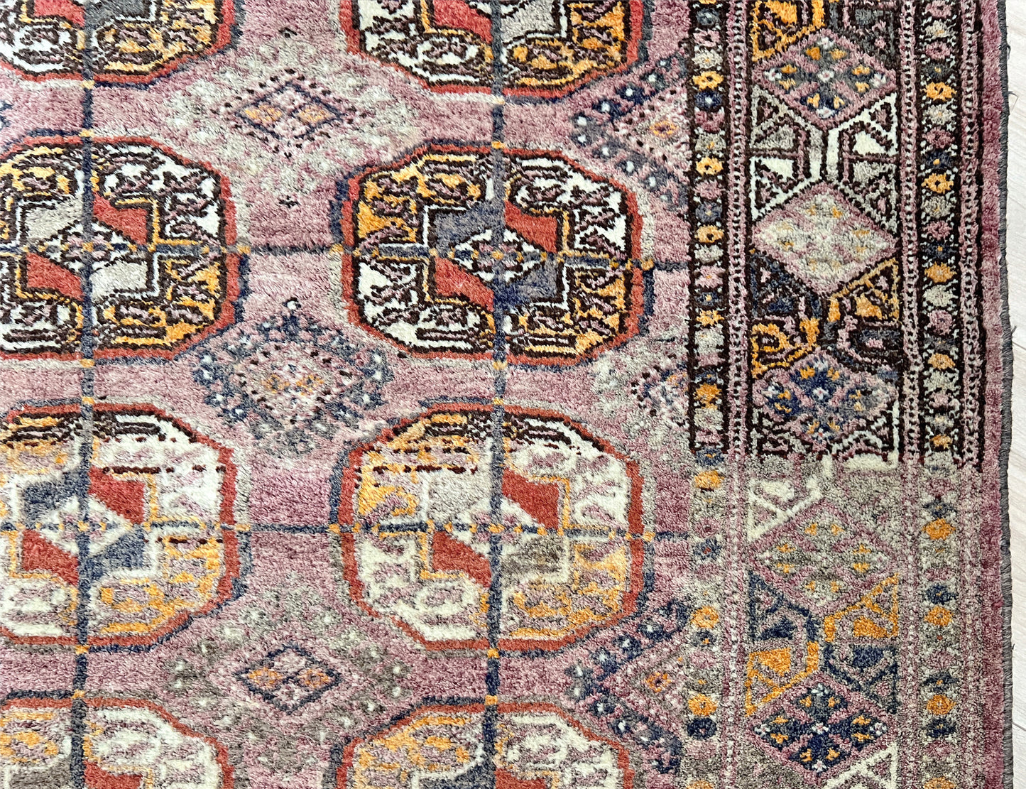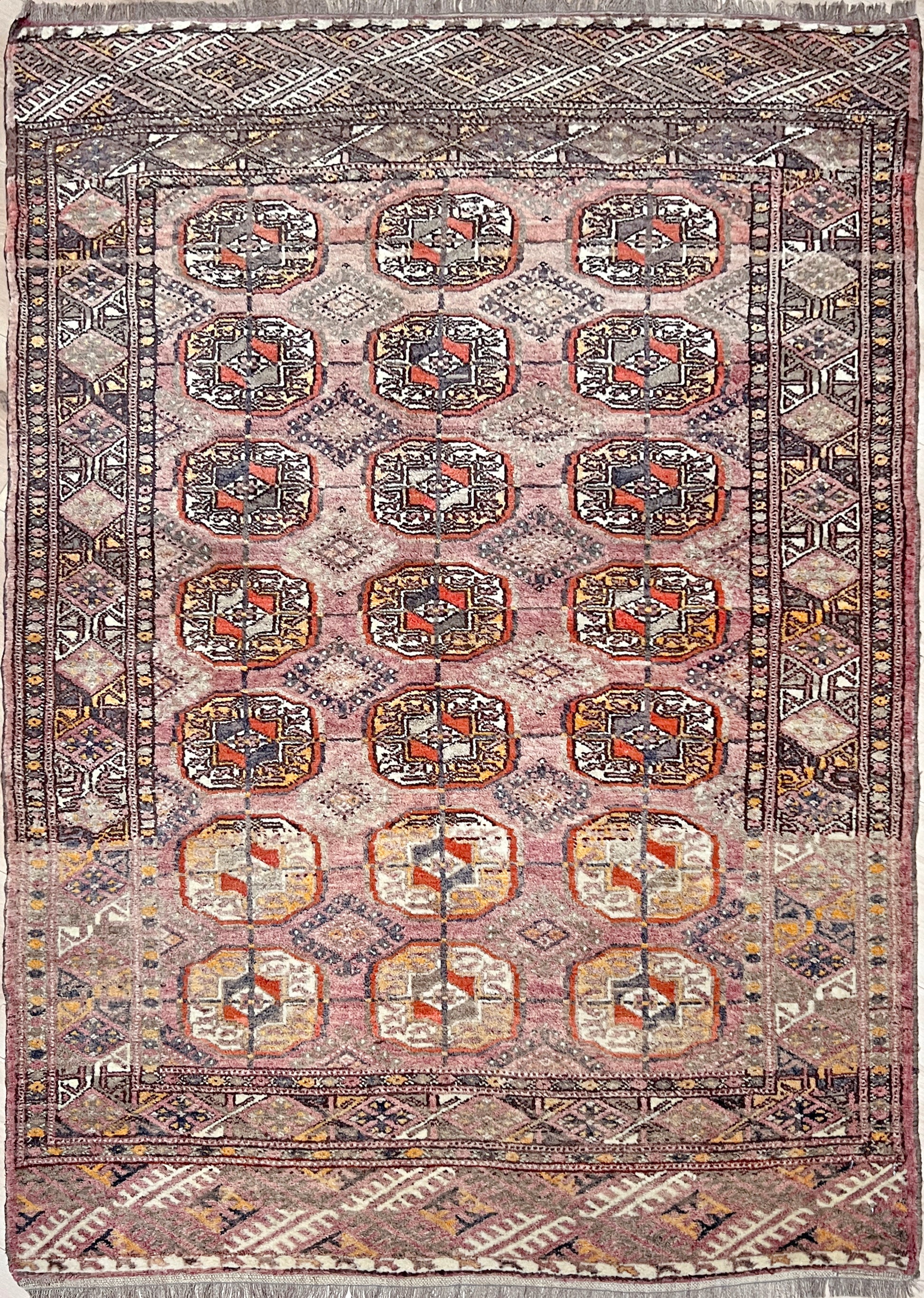 ✔ This vintage Turkmen Bukhara rug embodies timeless elegance with a soft, naturally faded palette of mauve beige, russet, clay, and gray. Hand-knotted with silky wool in the mid-20th century, it displays the classic Bukhara gul pattern — rows of octagonal medallions framed by intricate tribal borders.