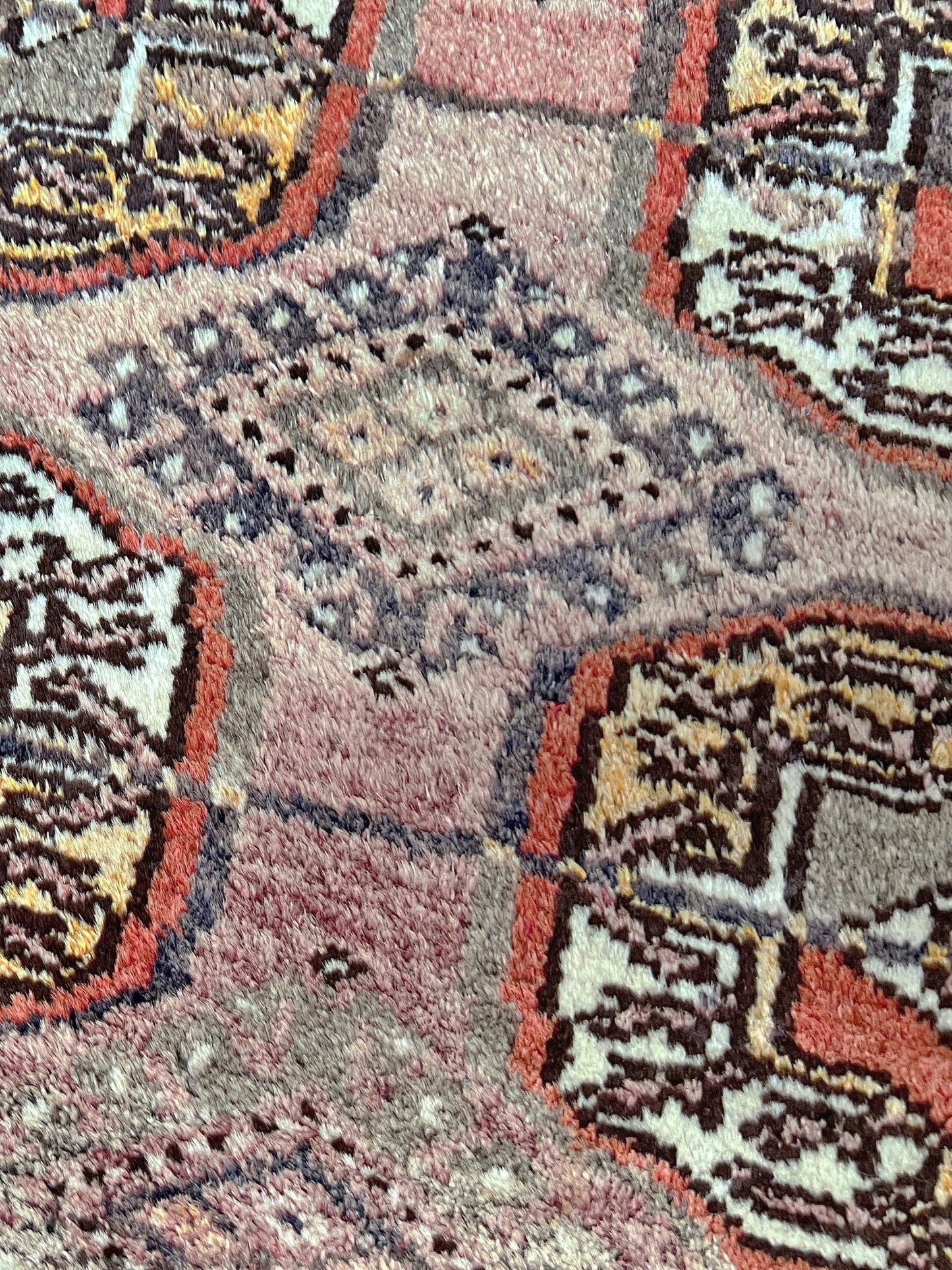Material: Hand knotted, hand spun wool pile (naturally dyed with roots & plants) on a wool foundation.