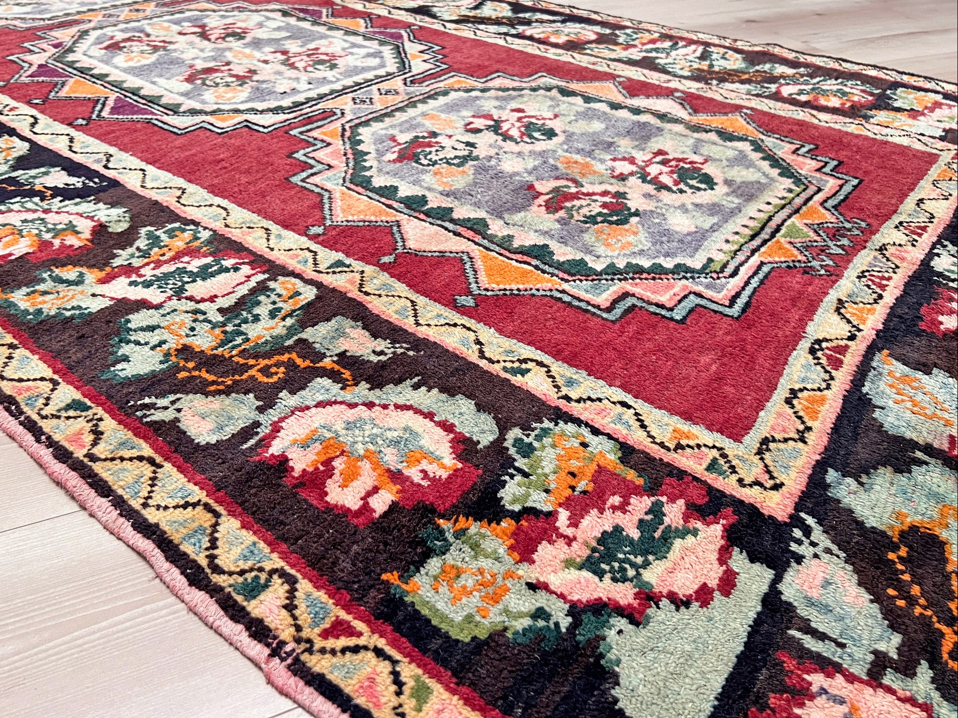 ✔ Traditionally hand knotted Caucasian rug. Combining floral Karabagh style borders with octagonal central medallions, this vintage rug has a rare eclectic style. It has a very soft full pile. The shape is a kind of a wide runner, which is very useful not only for wide hallways, but also for a kitchen, dining, living room or bedroom.