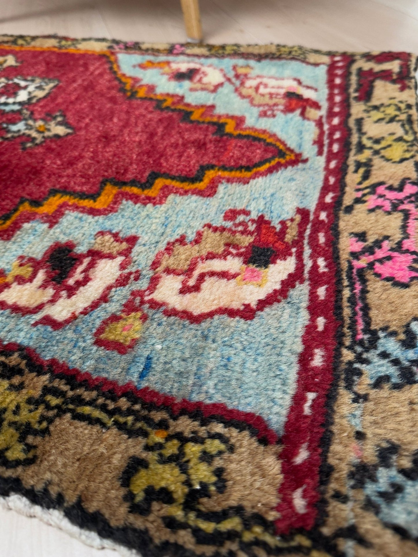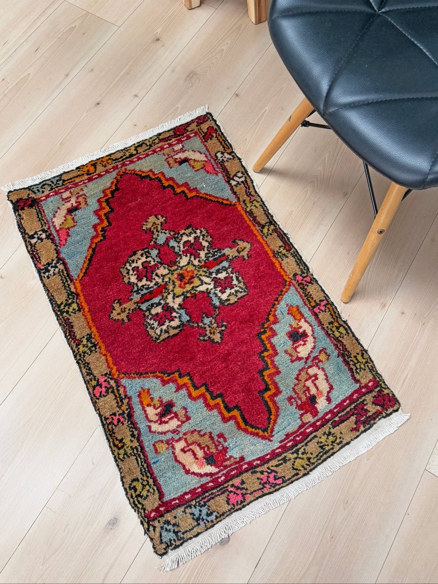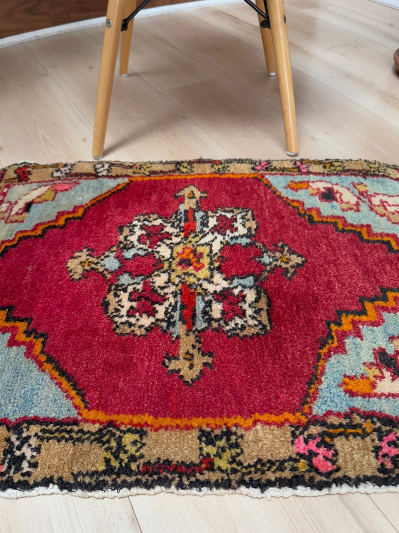 Ruby Red & Sky Blue Anatolian Yastik •Vintage Turkish Village Mini Rug • Handmade Wool Carpet • 2x3 Doormat Small Rug for Entry, Bathroom, Bedroom, Kitchen & Study