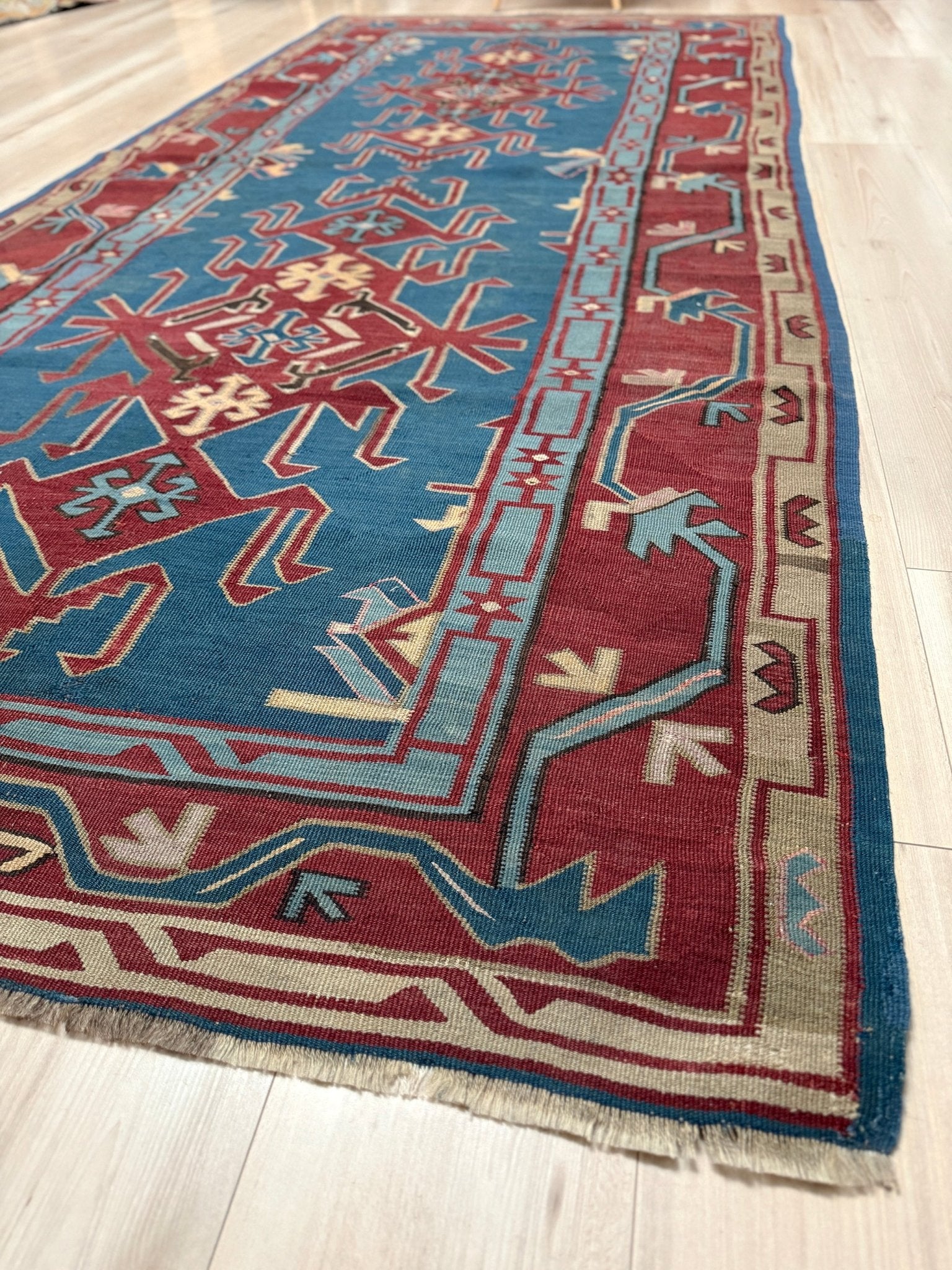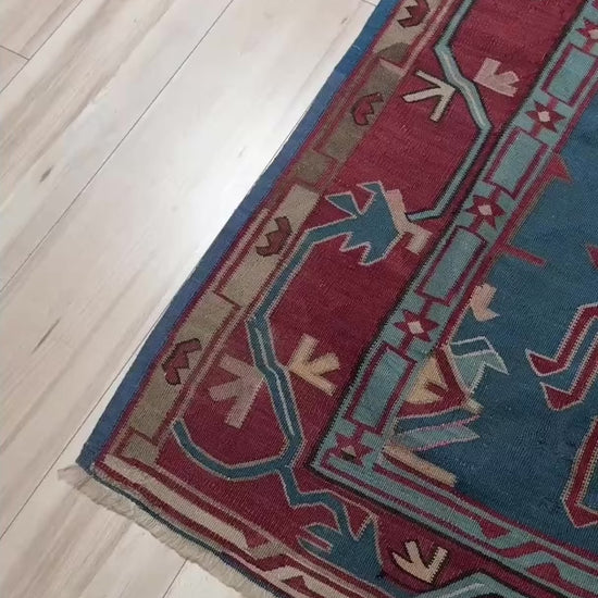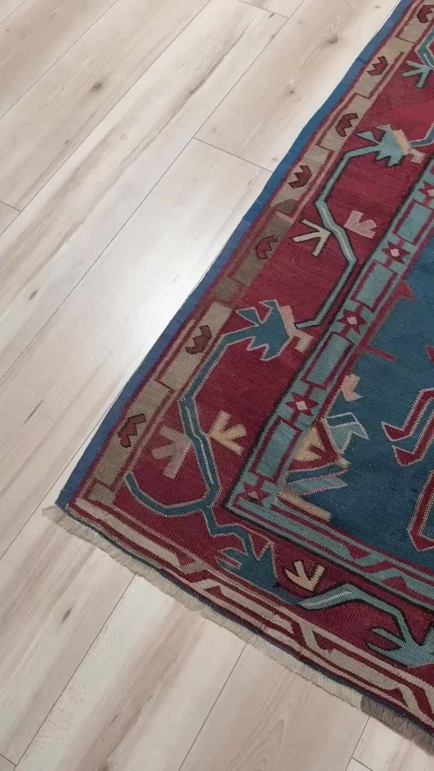 This vintage Avar kilim from the Caucasus is pure drama in wool form—bold tribal motifs stretch across a sea of deep denim blue, framed by a rush of terracotta red, pistachio green, and soft ivory tones. Handwoven with meticulous detail, its flatweave texture adds depth and character without the weight of a pile. The jagged, almost electric geometry dances playfully while staying rooted in centuries-old tradition.