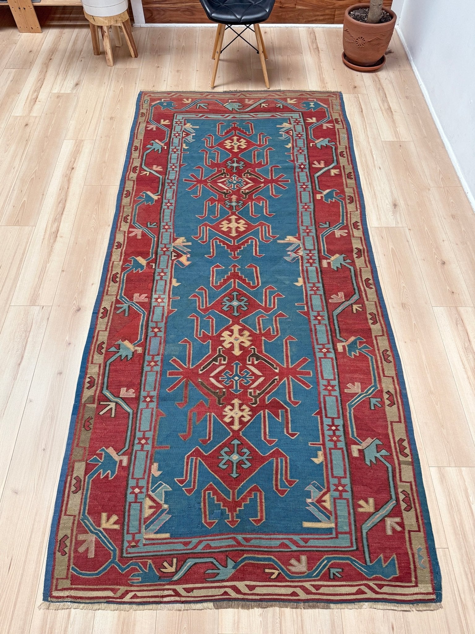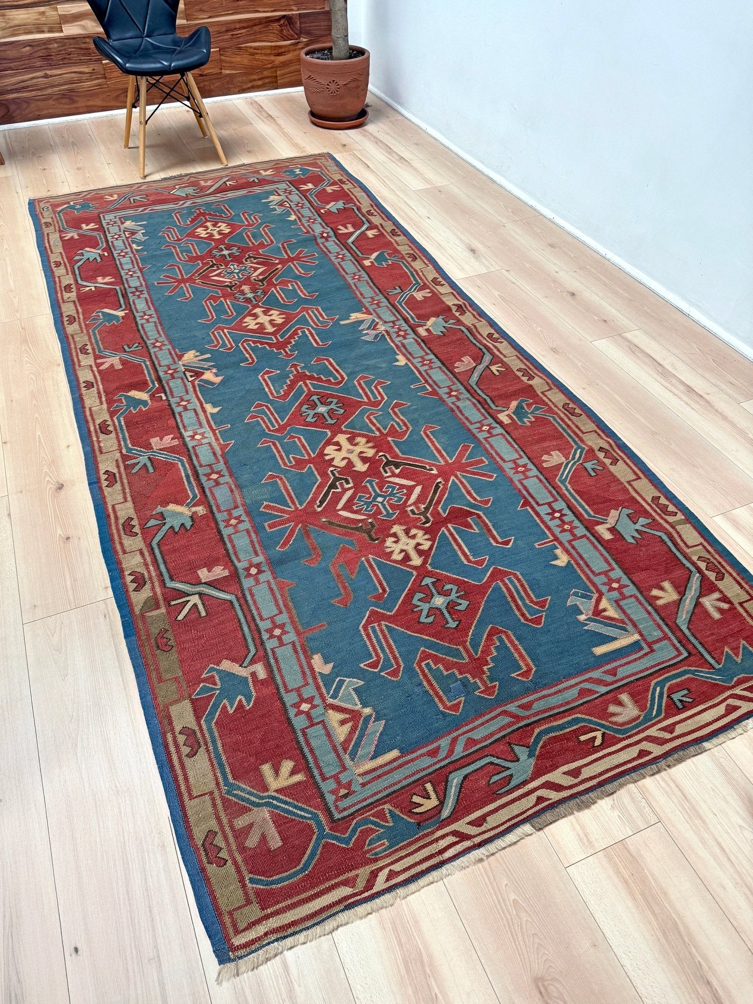 Avar Denim Blue Vintage Caucasian Kilim Rug • Handmade Flatweave Wool Carpet • 4x10 Tribal Wide Runner Rug for Living Room, Bedroom, Entryway, Hallway & Kitchen