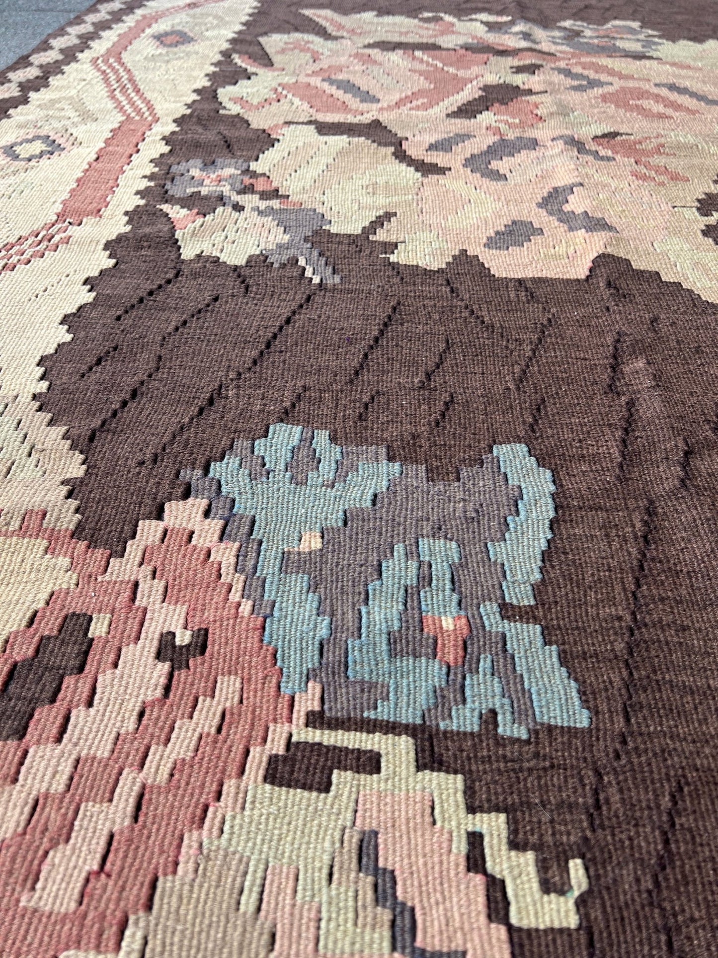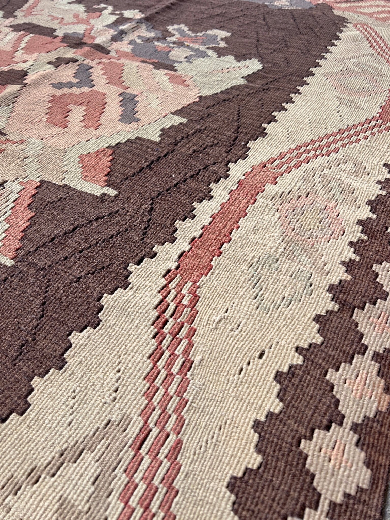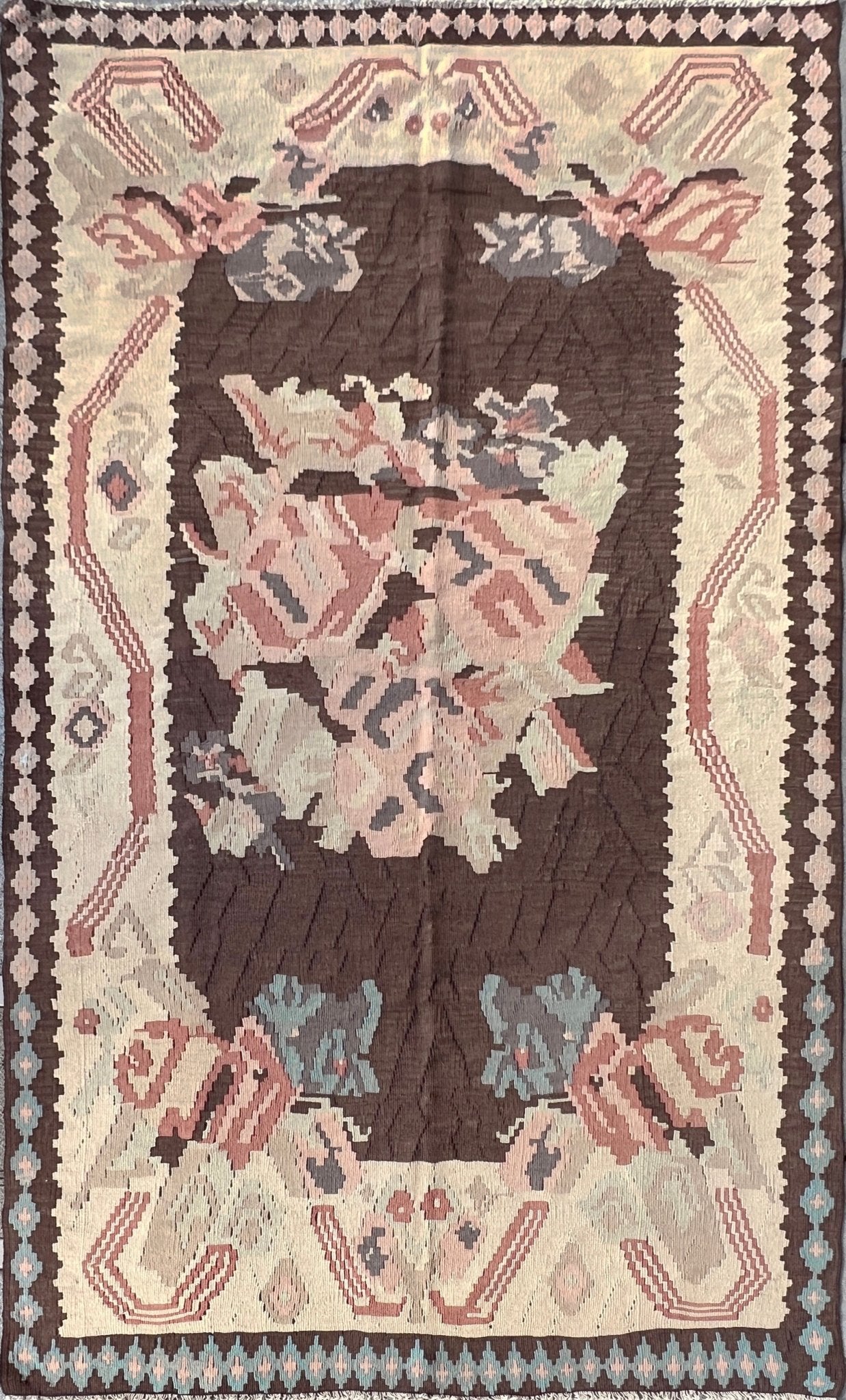 This vintage Balkan kilim from 1950s Eastern Europe is a flatweave treasure with an earthy color combination that feels both grounded and sophisticated. Its rich chocolate brown field is framed by soft ivory tones, with blush pink and dusty blue accents adding subtle charm. Handwoven with care, this timeless piece brings character and versatility to any living room, bedroom, or cozy nook. Whether you're a collector or simply looking for a rug with soul, this kilim is ready to tell its story in your space.
