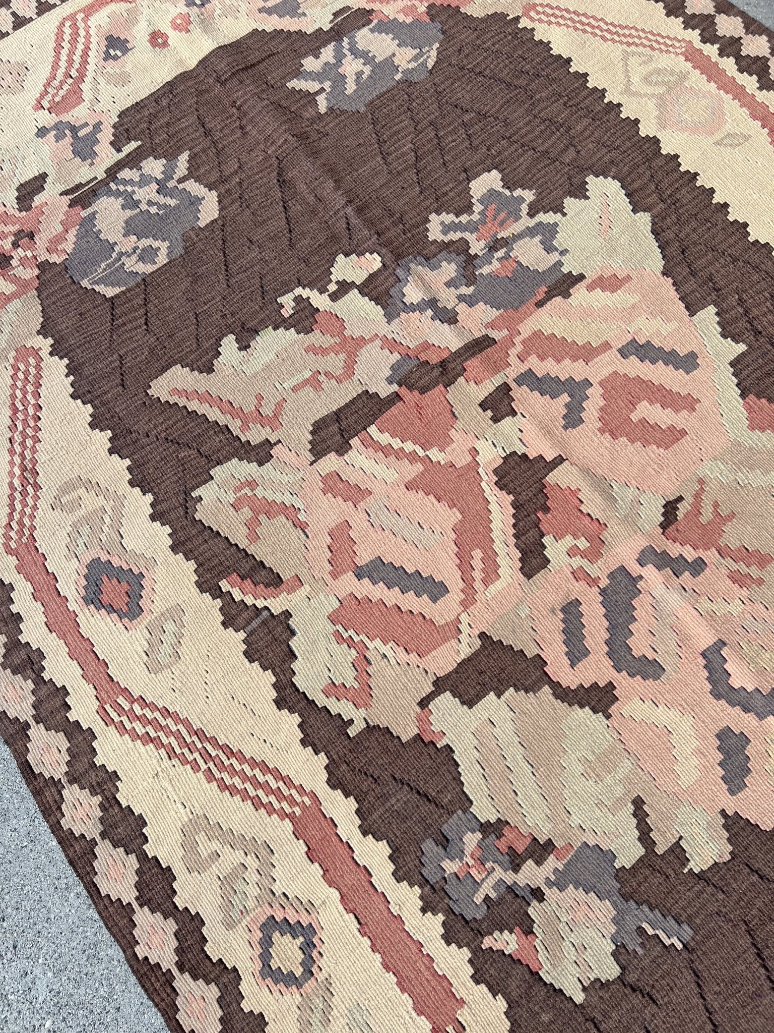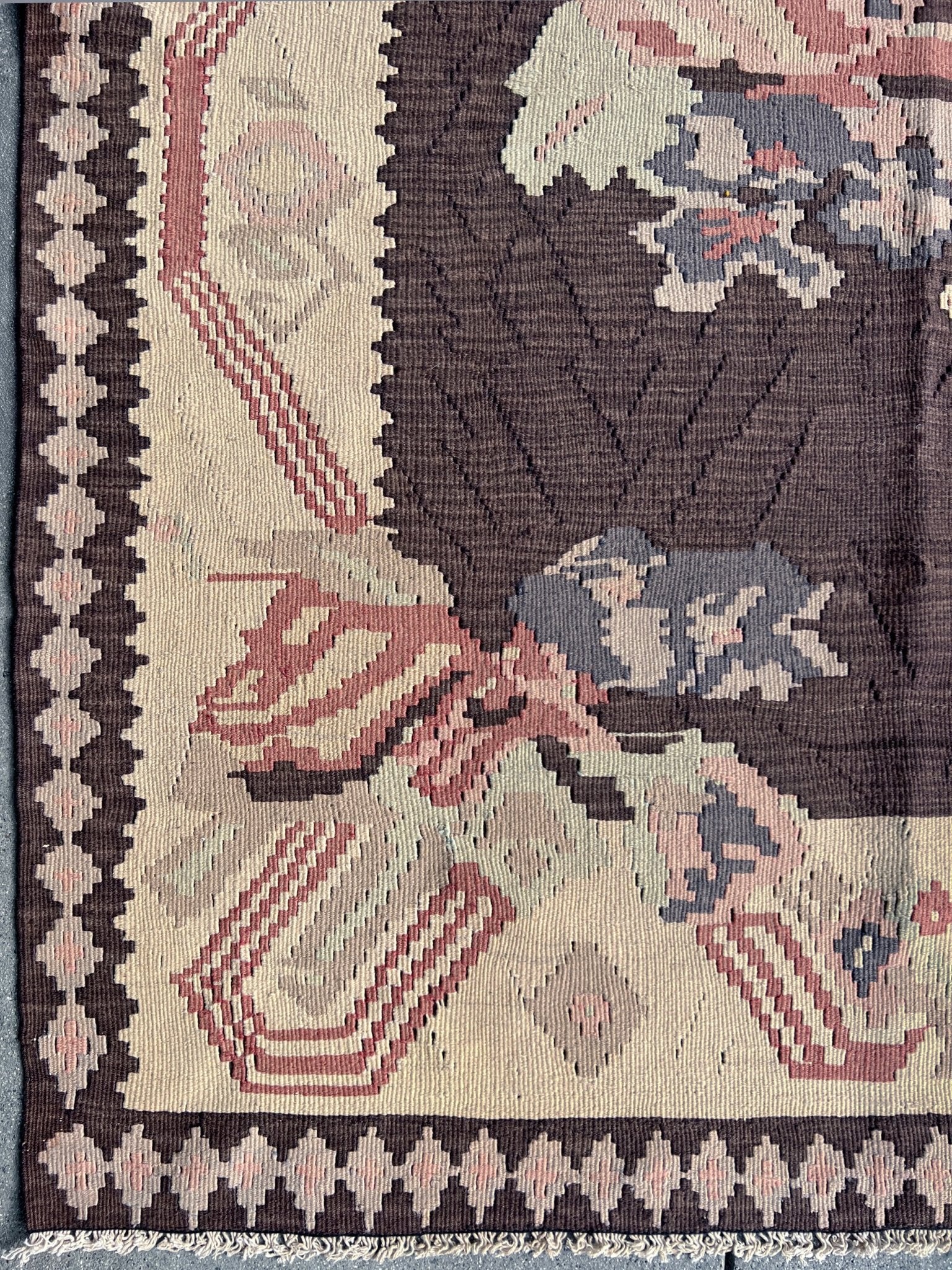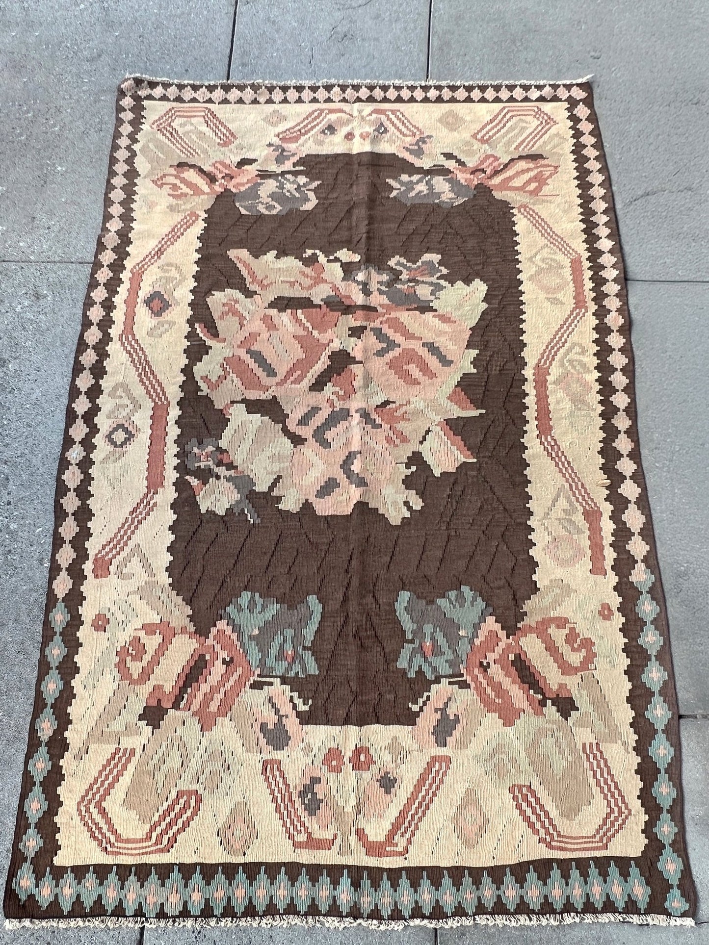 This vintage Balkan kilim from 1950s Eastern Europe is a flatweave treasure with an earthy color combination that feels both grounded and sophisticated. Its rich chocolate brown field is framed by soft ivory tones, with blush pink and dusty blue accents adding subtle charm. Handwoven with care, this timeless piece brings character and versatility to any living room, bedroom, or cozy nook. Whether you're a collector or simply looking for a rug with soul, this kilim is ready to tell its story in your space.