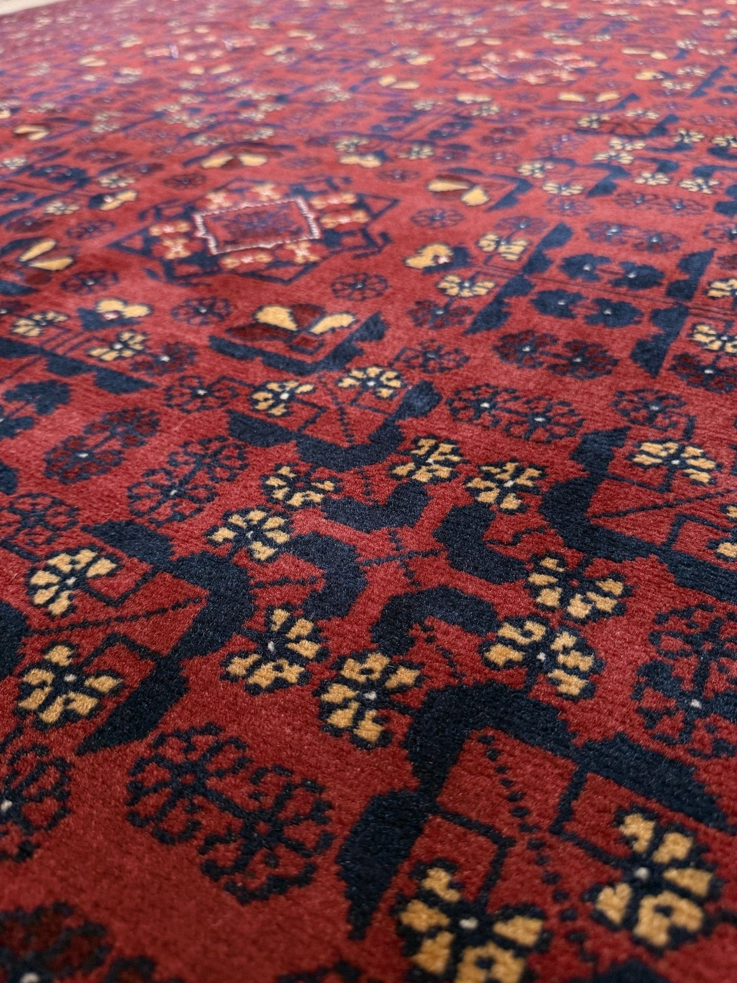 ✔ Deep crimson and midnight navy intertwine in this exquisite Turkmen Bilcik rug, creating a mesmerizing play of warmth and mystery. The intricate geometric gul motifs, each framed in symmetry, echo the echoes of a nomadic past while exuding an air of refined sophistication. Its velvety soft pile enhances the richness of the hues, shifting subtly with the light to reveal hidden depths of earthy umber and delicate ivory. Framed by a striking multi-layered border, this masterpiece doesn’t just lie on the floor—it commands presence, anchoring any space with timeless elegance.