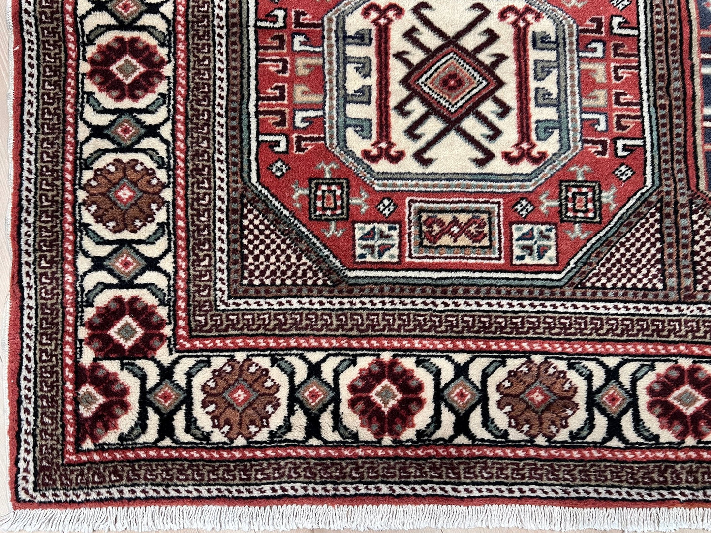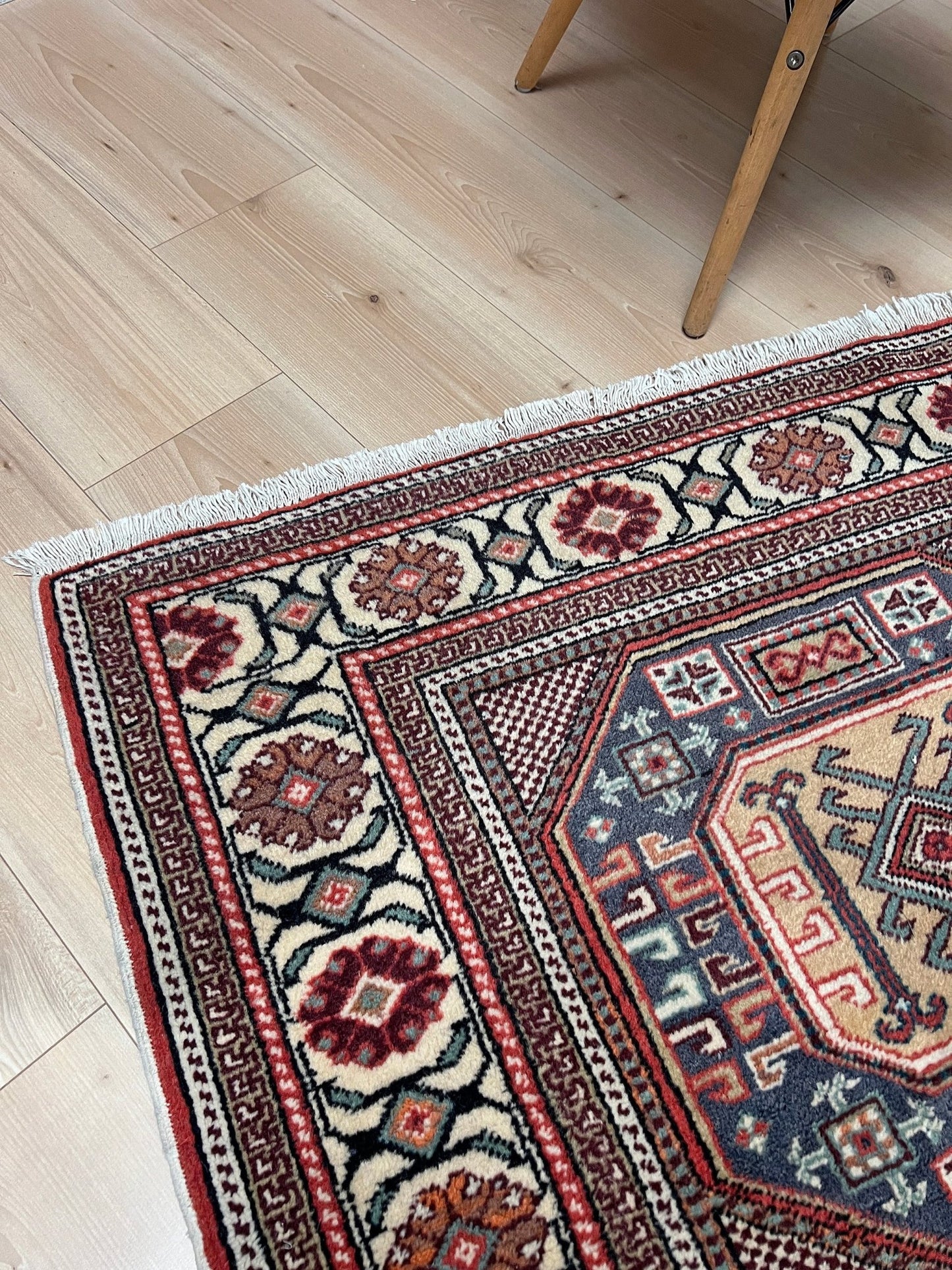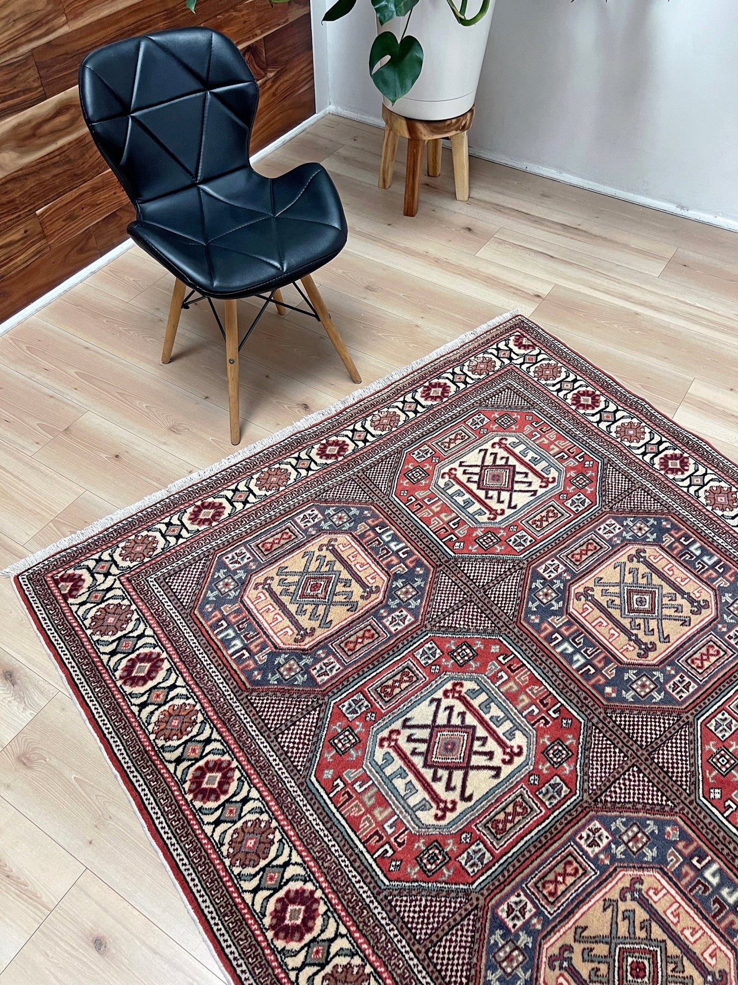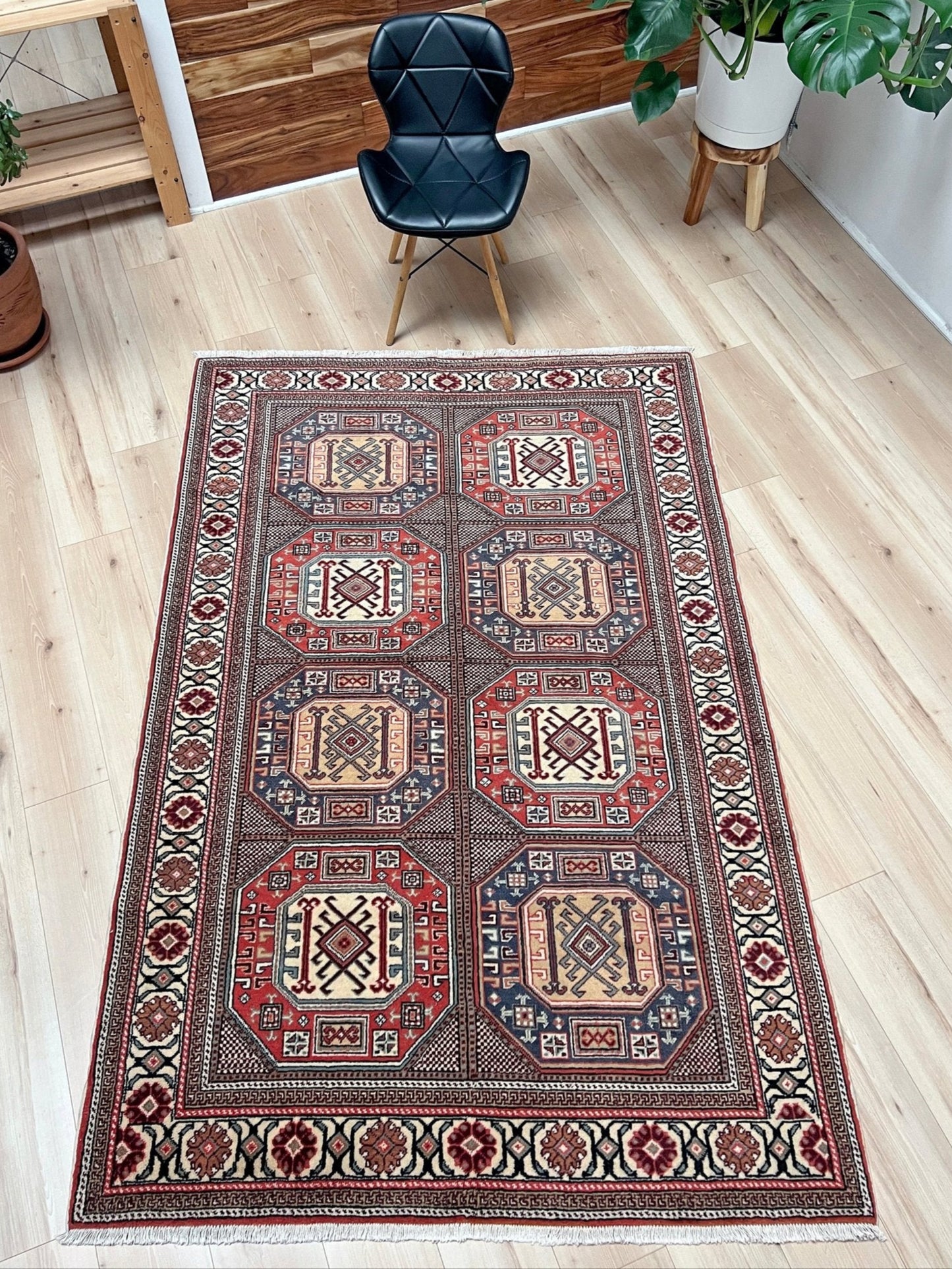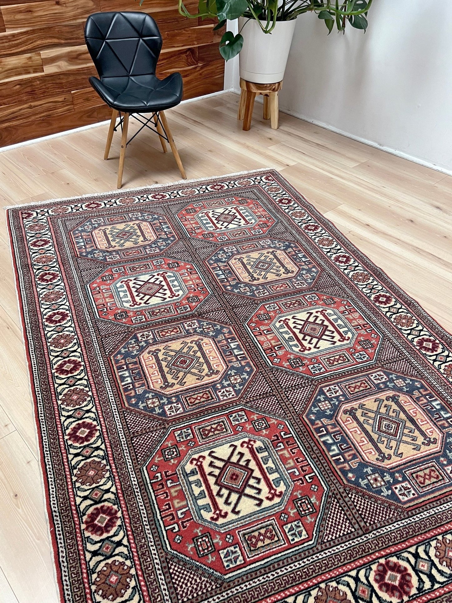 Chest Turkish Tribal Rug with Geometric Design • Red, Blue, Ivory Handmade Wool Carpet • 5x7 Scatter Rug for Living Room, Bedroom, Kitchen, Entryway & Nursery