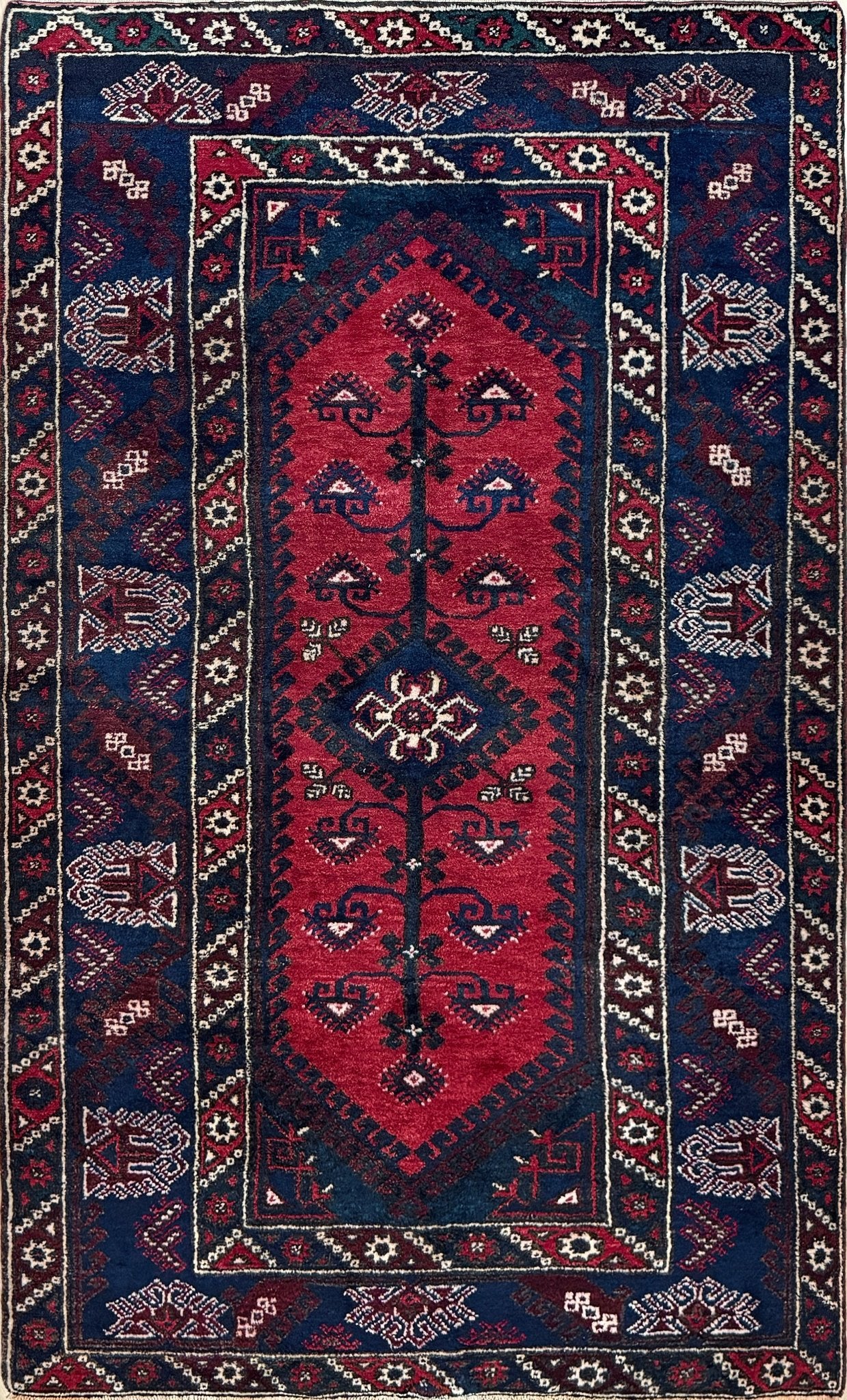 This vintage Turkish Rug  is a bold yet timeless piece woven with story, symbolism, and warmth. A deep crimson field anchors the design, while an elongated hexagonal medallion blooms with stylized floral motifs that feel both ancient and alive. Accents of midnight blue and earthy brown move through the borders, grounding the composition and letting the red pulse with energy. Soft ivory highlights glimmer throughout, adding contrast and quiet depth like moonlight against wool.