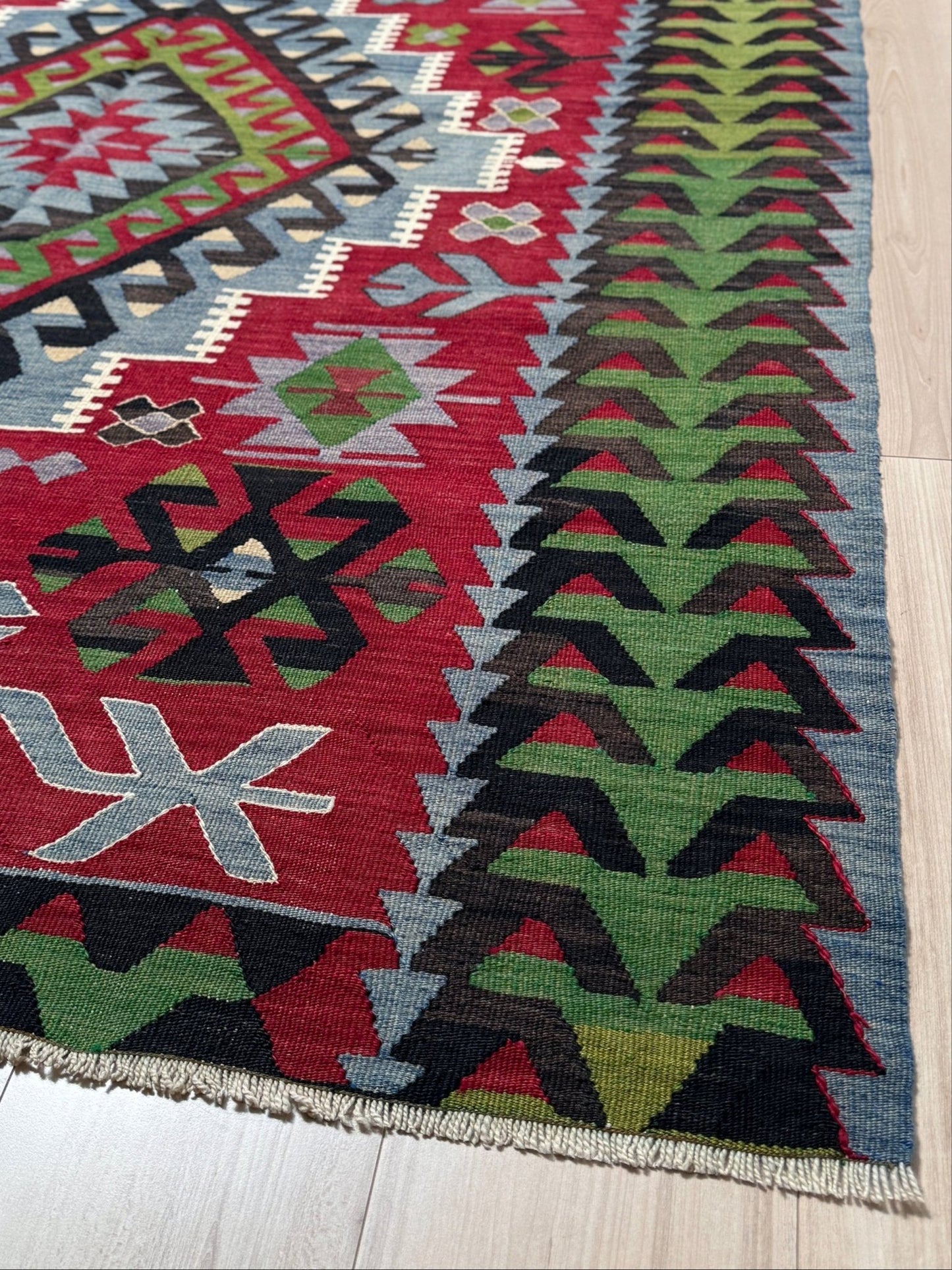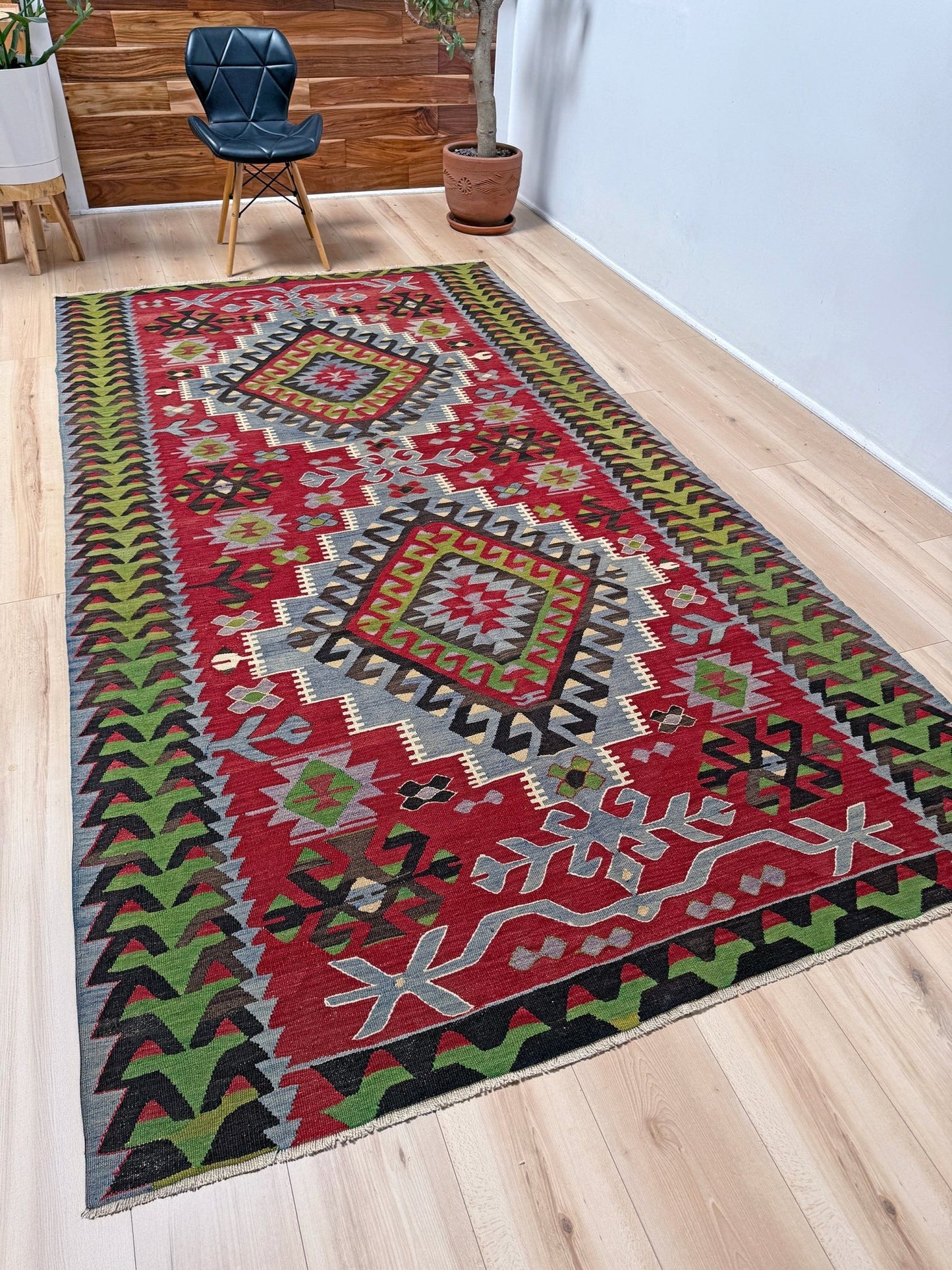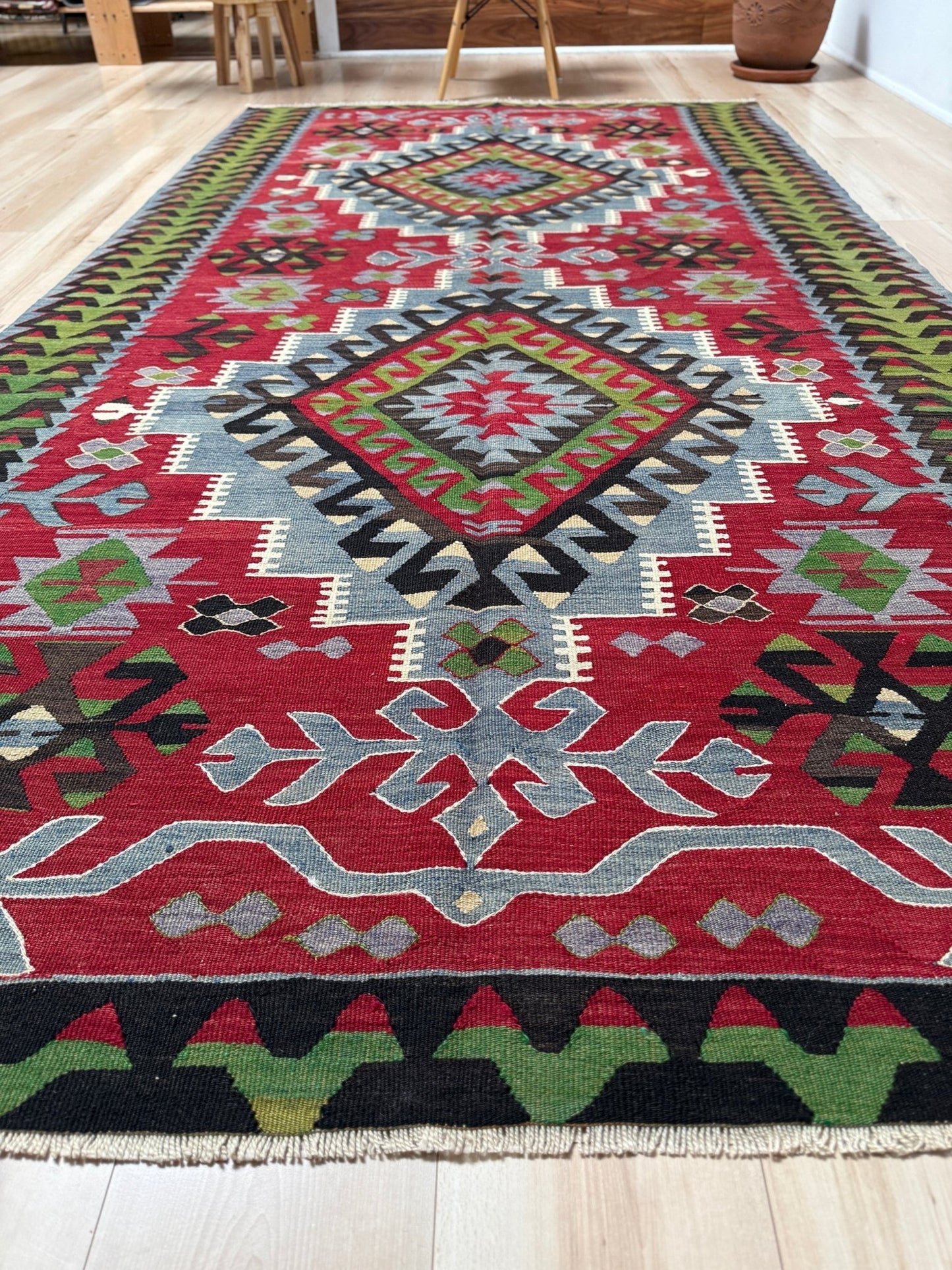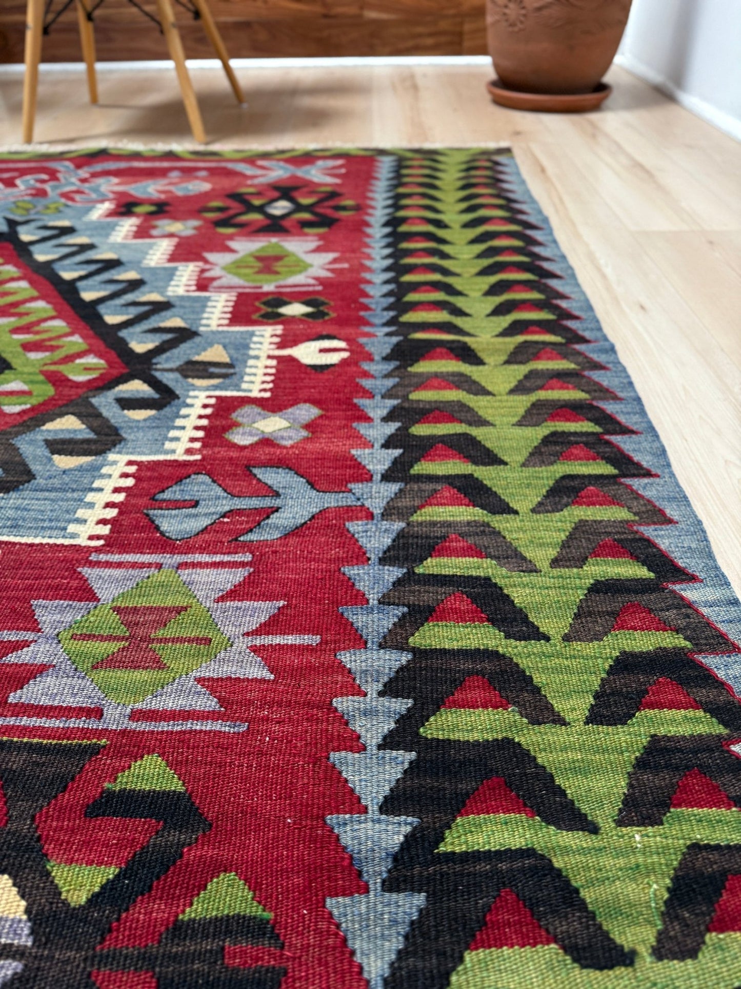 ✔ This Esme Turkish vintage kilim flatweave is a riot of joyful geometry, where bold diamond medallions steal the scene in earthy reds, mossy greens, and sky blues. The rhythmic zigzags and tribal motifs bring a lively, almost musical energy to the piece, making it feel both timeless and refreshingly spirited. Rich burgundy tones ground the design, while soft greens and cool blues add an unexpected lightness, keeping the eye dancing across the weave. Handwoven in pure wool, this kilim feels like a conversation between tradition and play — ready to spark life into any space.