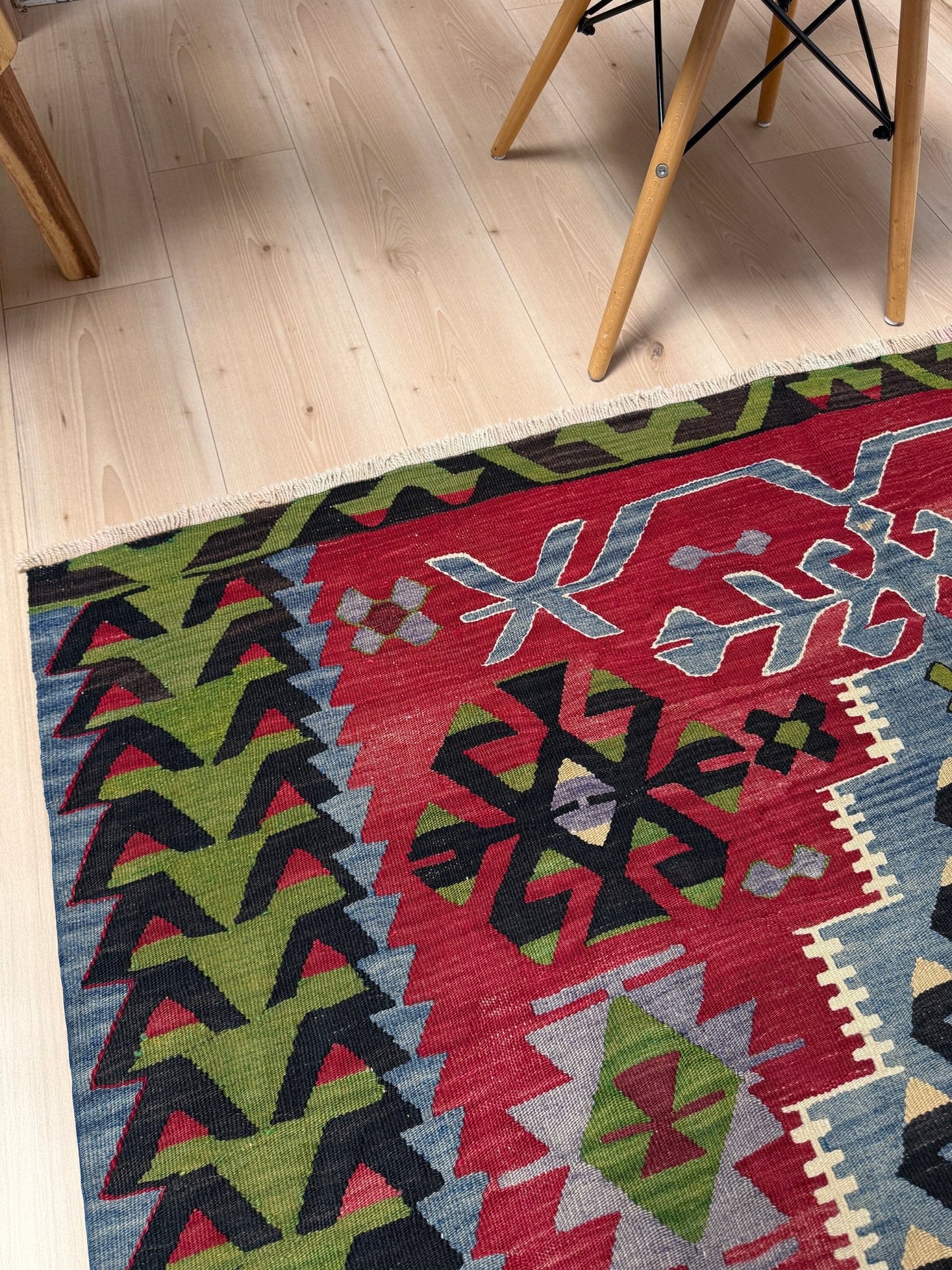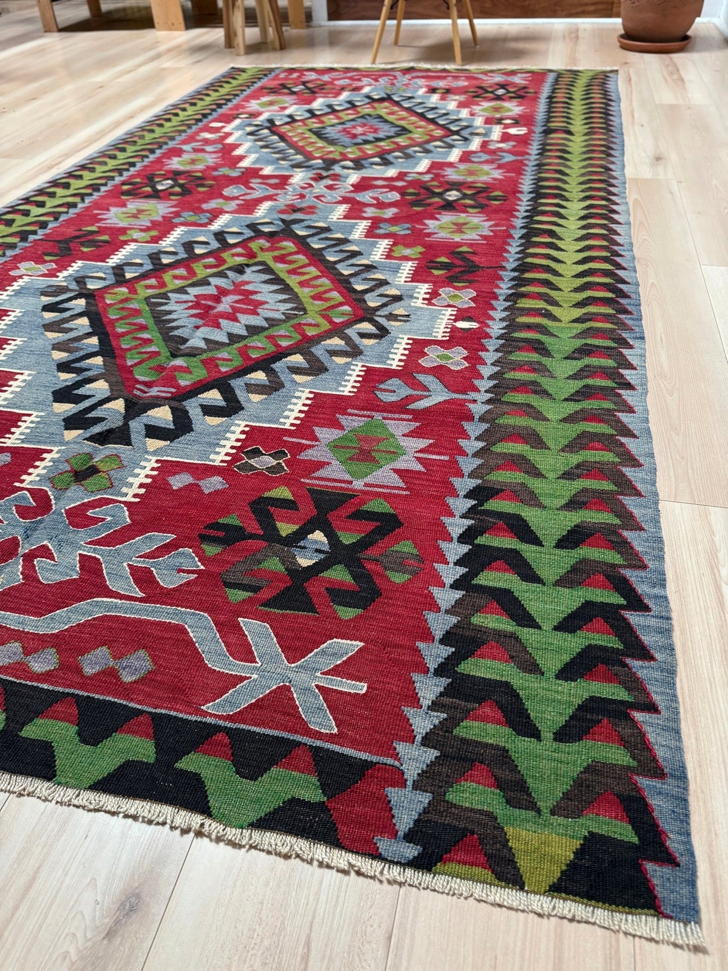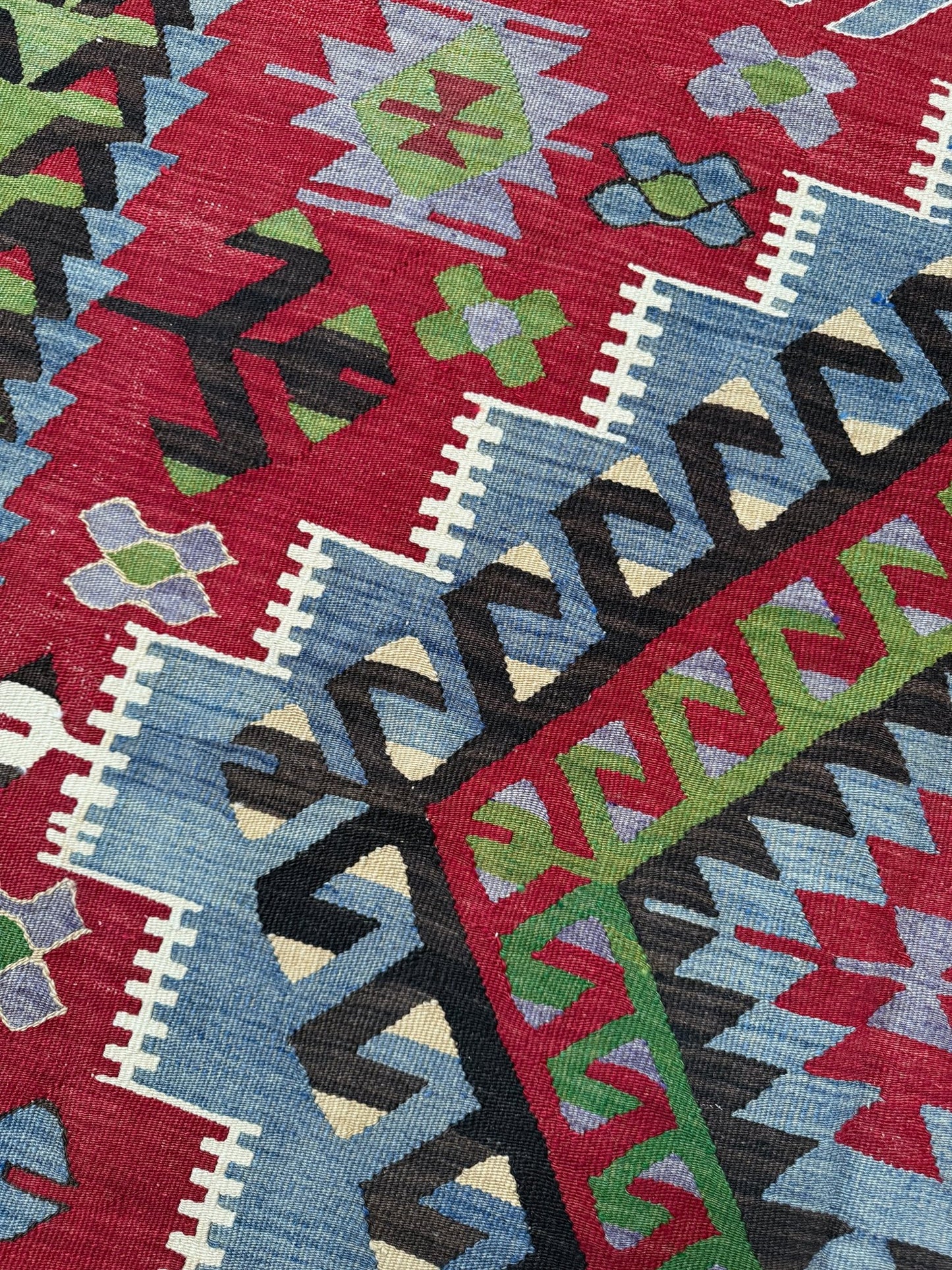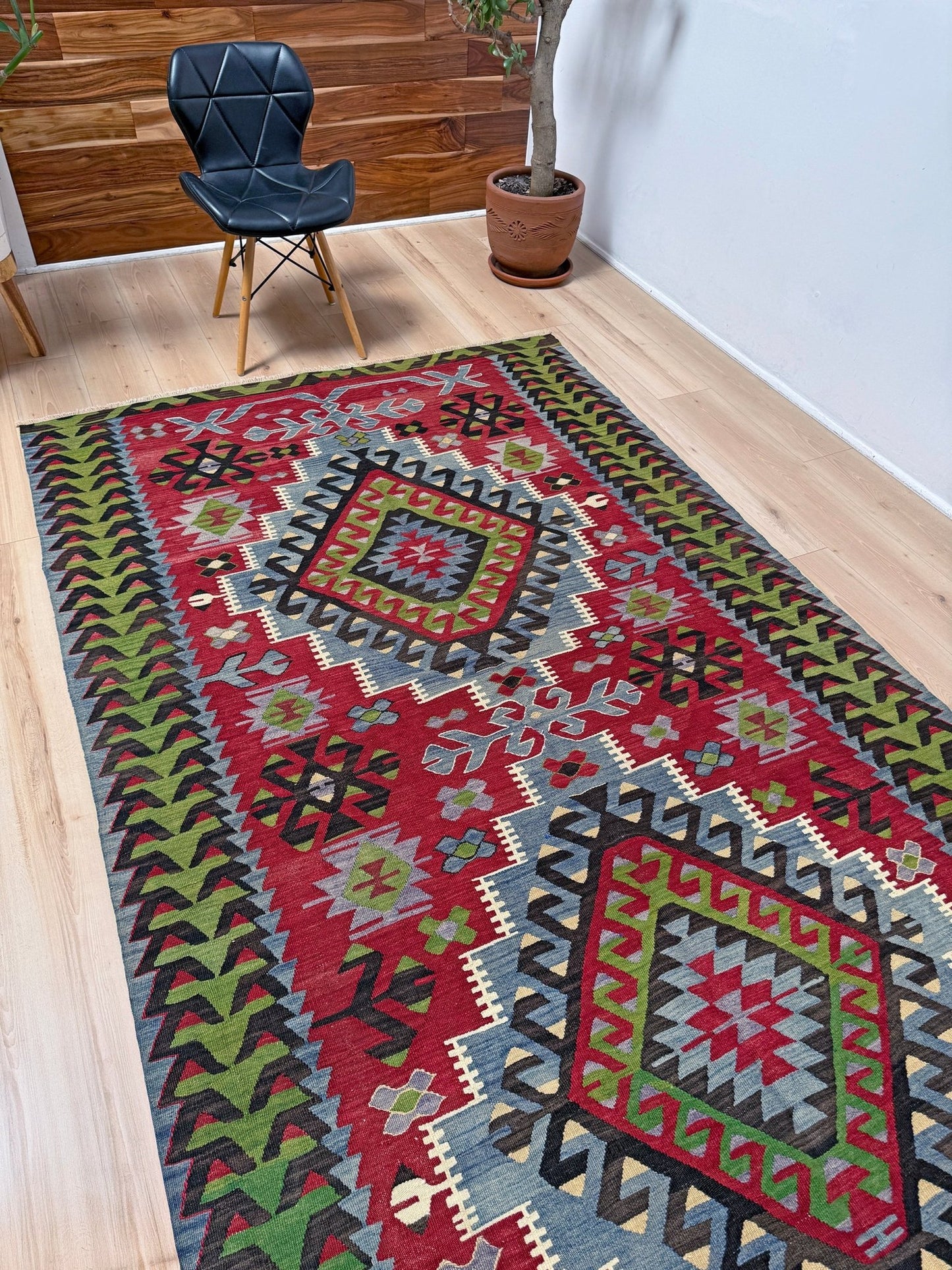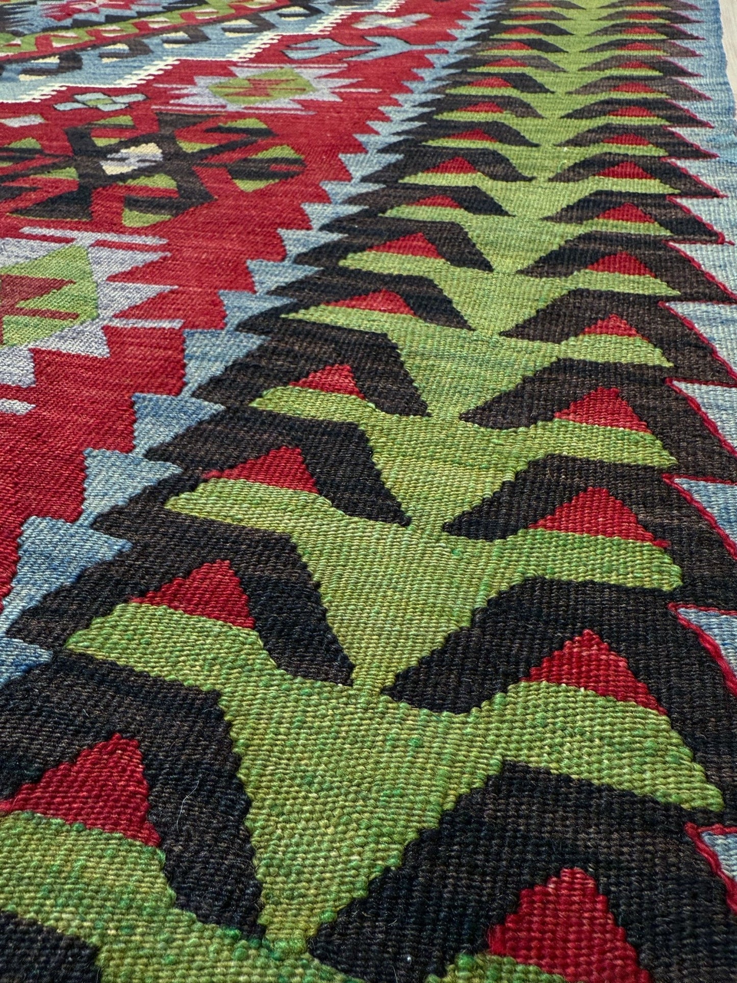 ✔ This Esme Turkish vintage kilim flatweave is a riot of joyful geometry, where bold diamond medallions steal the scene in earthy reds, mossy greens, and sky blues. The rhythmic zigzags and tribal motifs bring a lively, almost musical energy to the piece, making it feel both timeless and refreshingly spirited. Rich burgundy tones ground the design, while soft greens and cool blues add an unexpected lightness, keeping the eye dancing across the weave. Handwoven in pure wool, this kilim feels like a conversation between tradition and play — ready to spark life into any space.