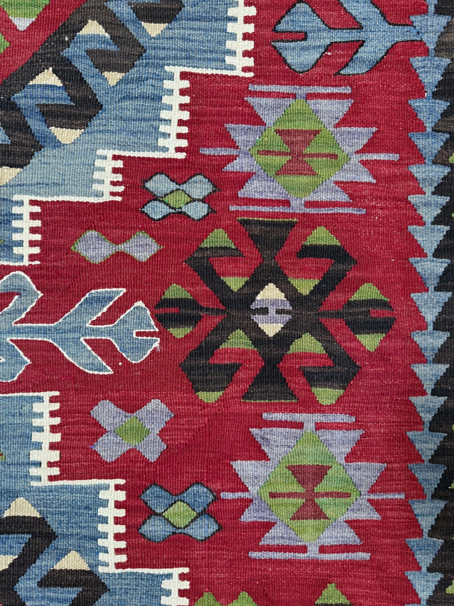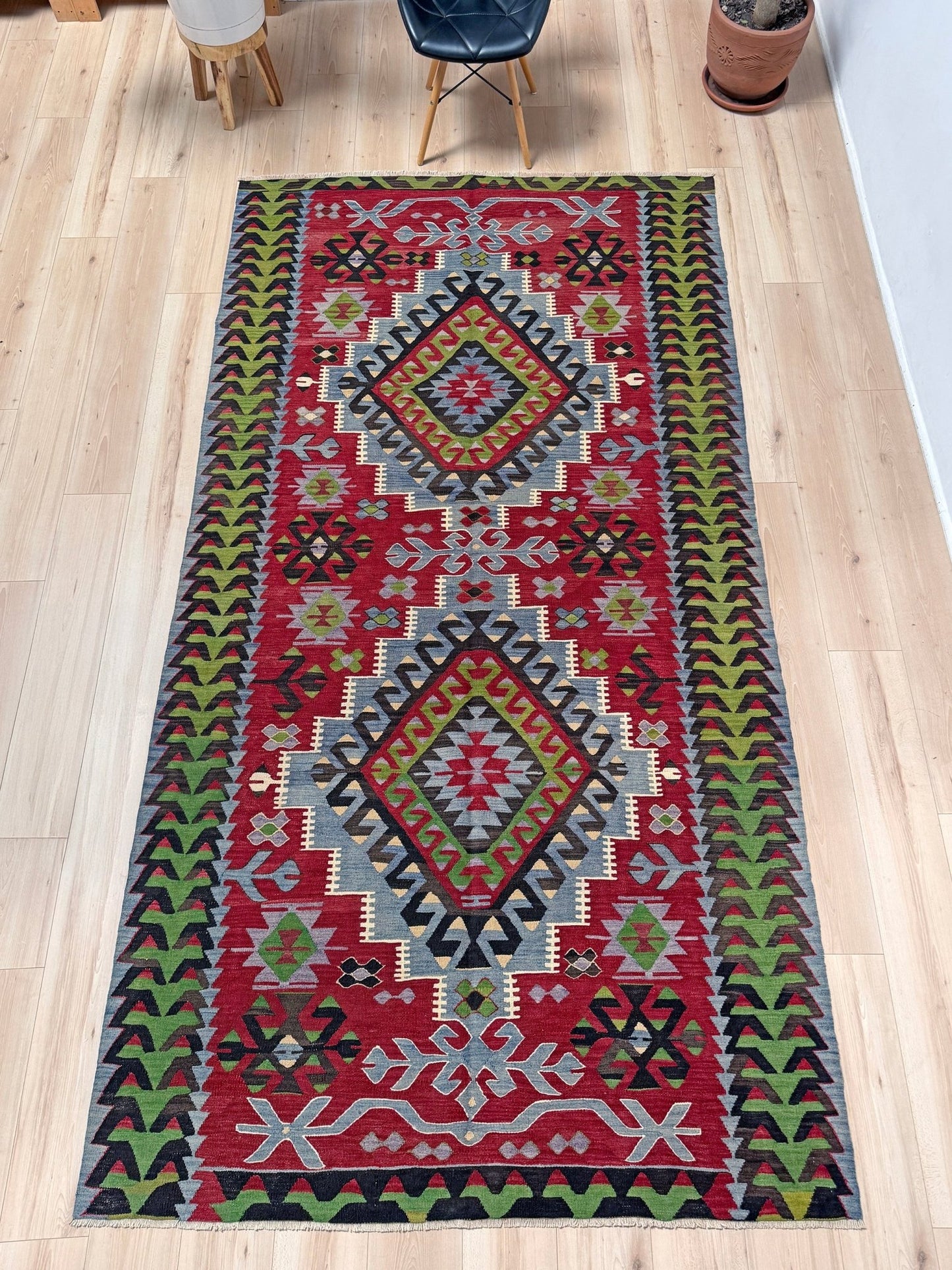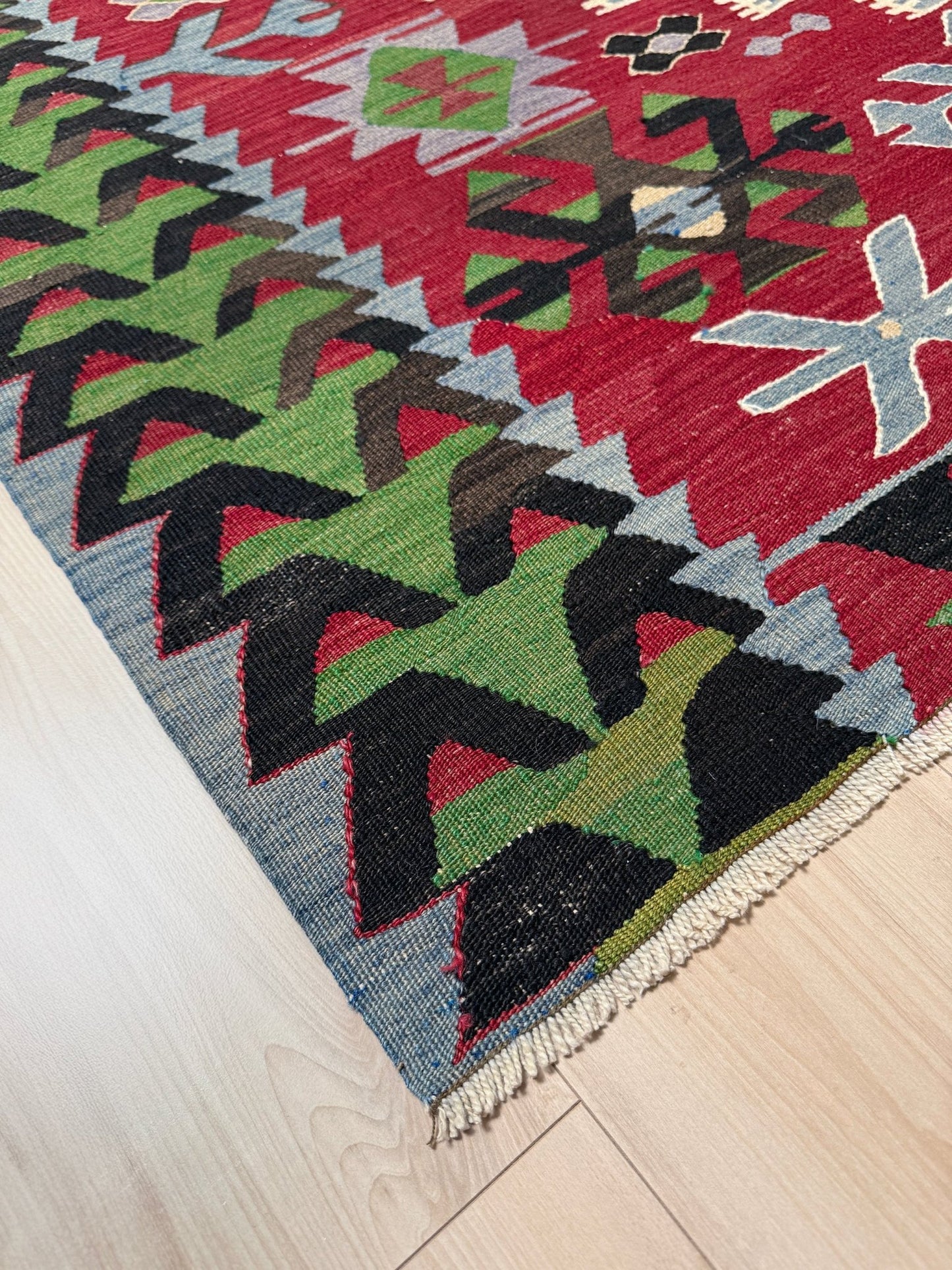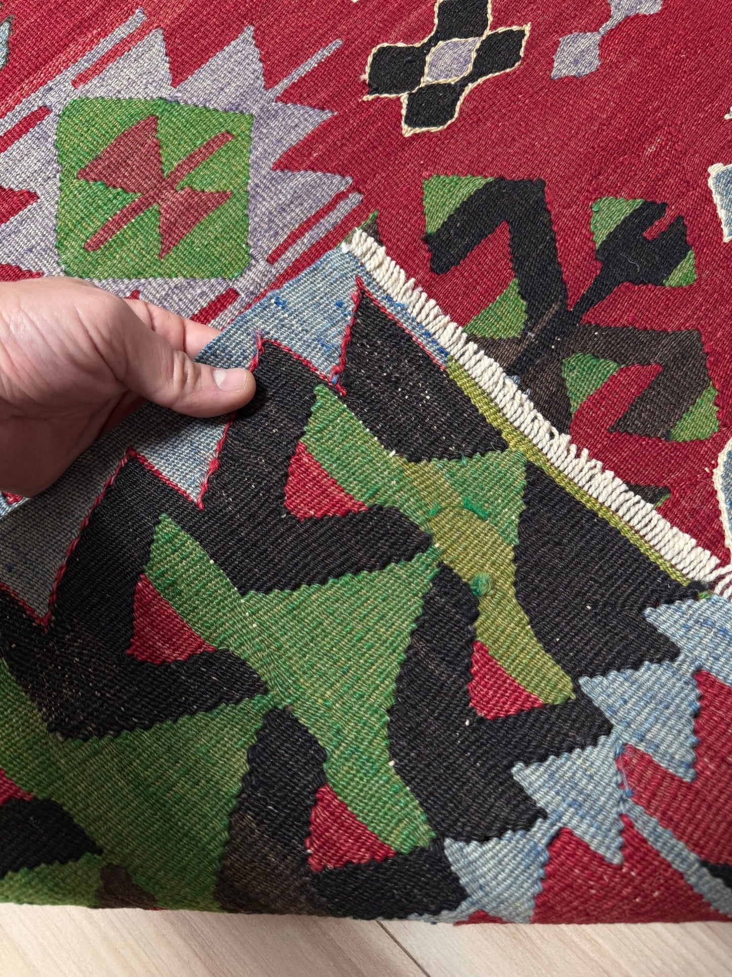 ✔ This Esme Turkish vintage kilim flatweave is a riot of joyful geometry, where bold diamond medallions steal the scene in earthy reds, mossy greens, and sky blues. The rhythmic zigzags and tribal motifs bring a lively, almost musical energy to the piece, making it feel both timeless and refreshingly spirited. Rich burgundy tones ground the design, while soft greens and cool blues add an unexpected lightness, keeping the eye dancing across the weave. Handwoven in pure wool, this kilim feels like a conversation between tradition and play — ready to spark life into any space.