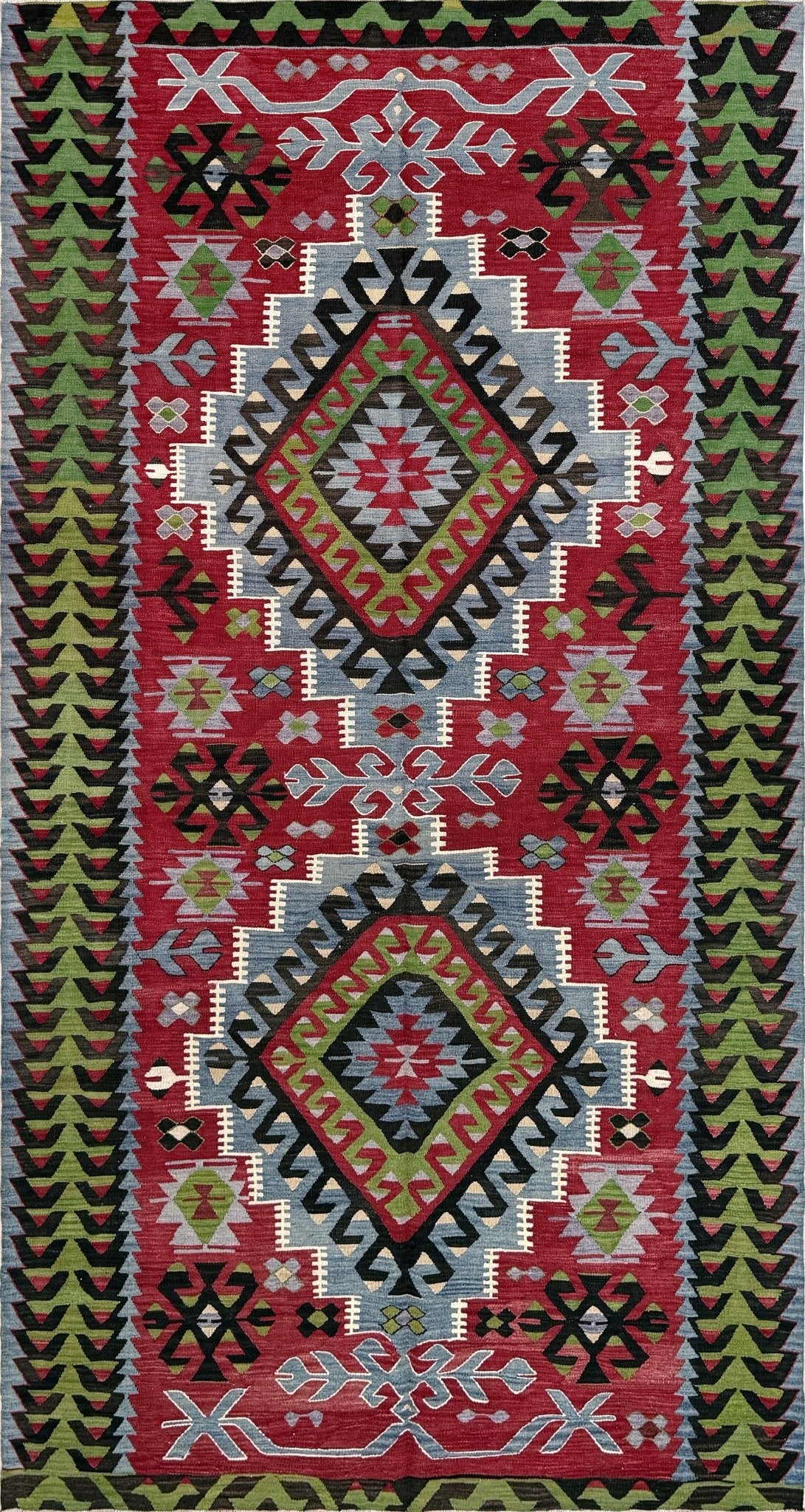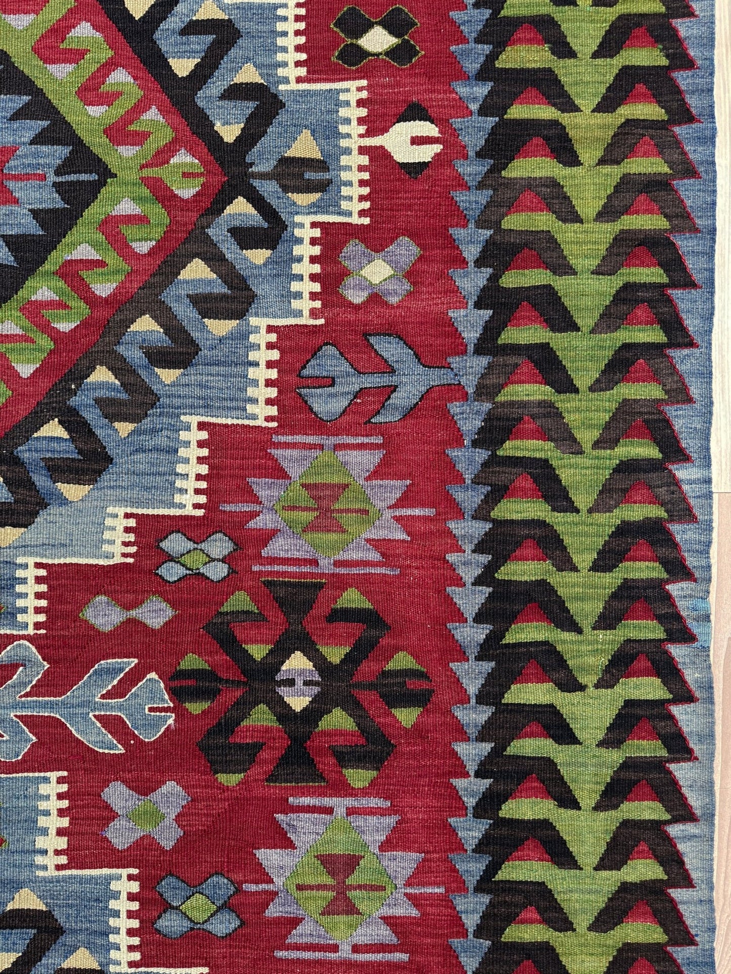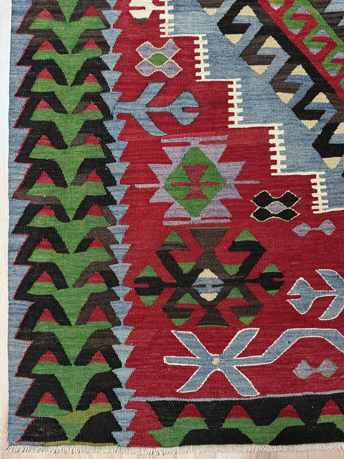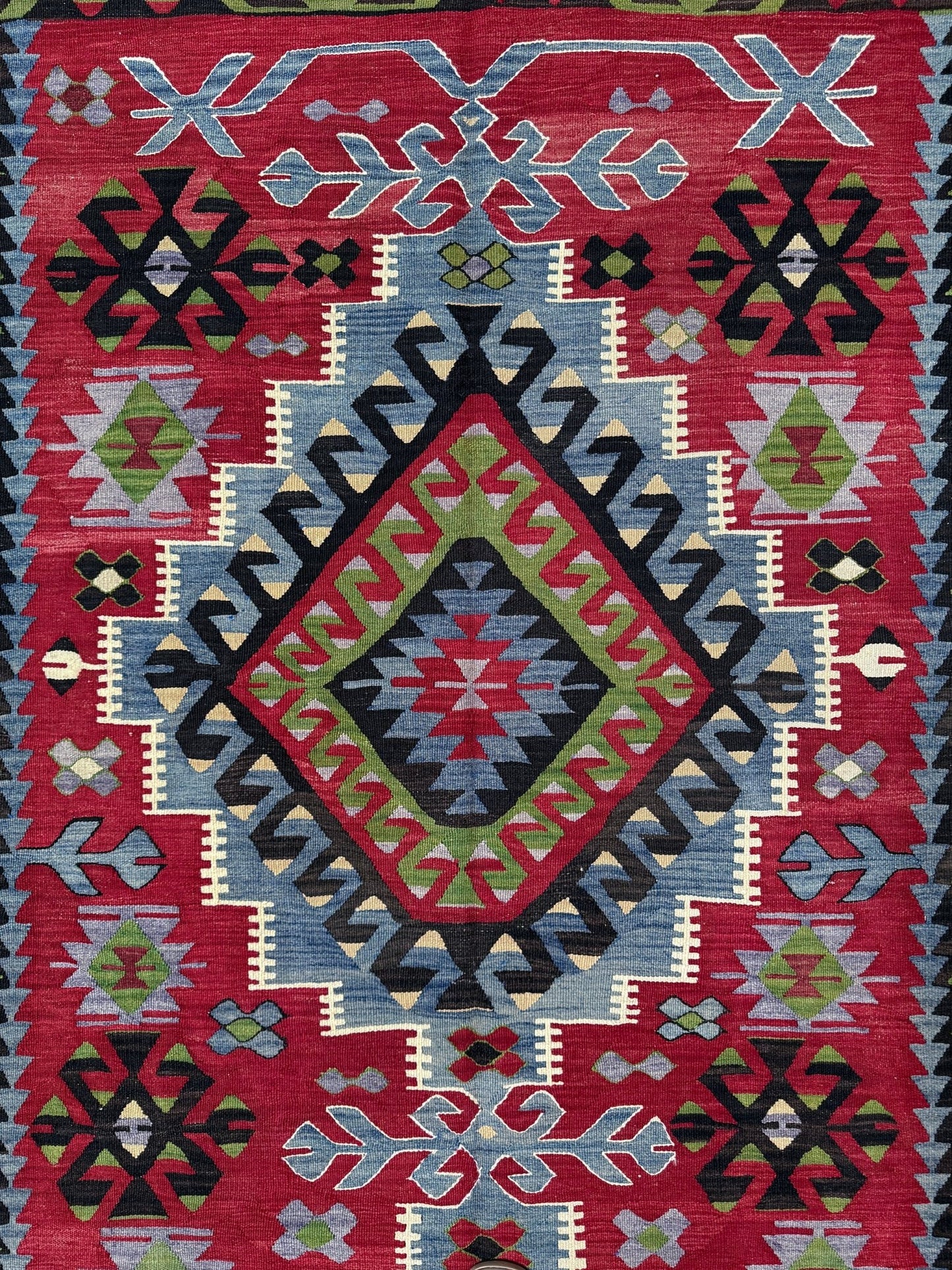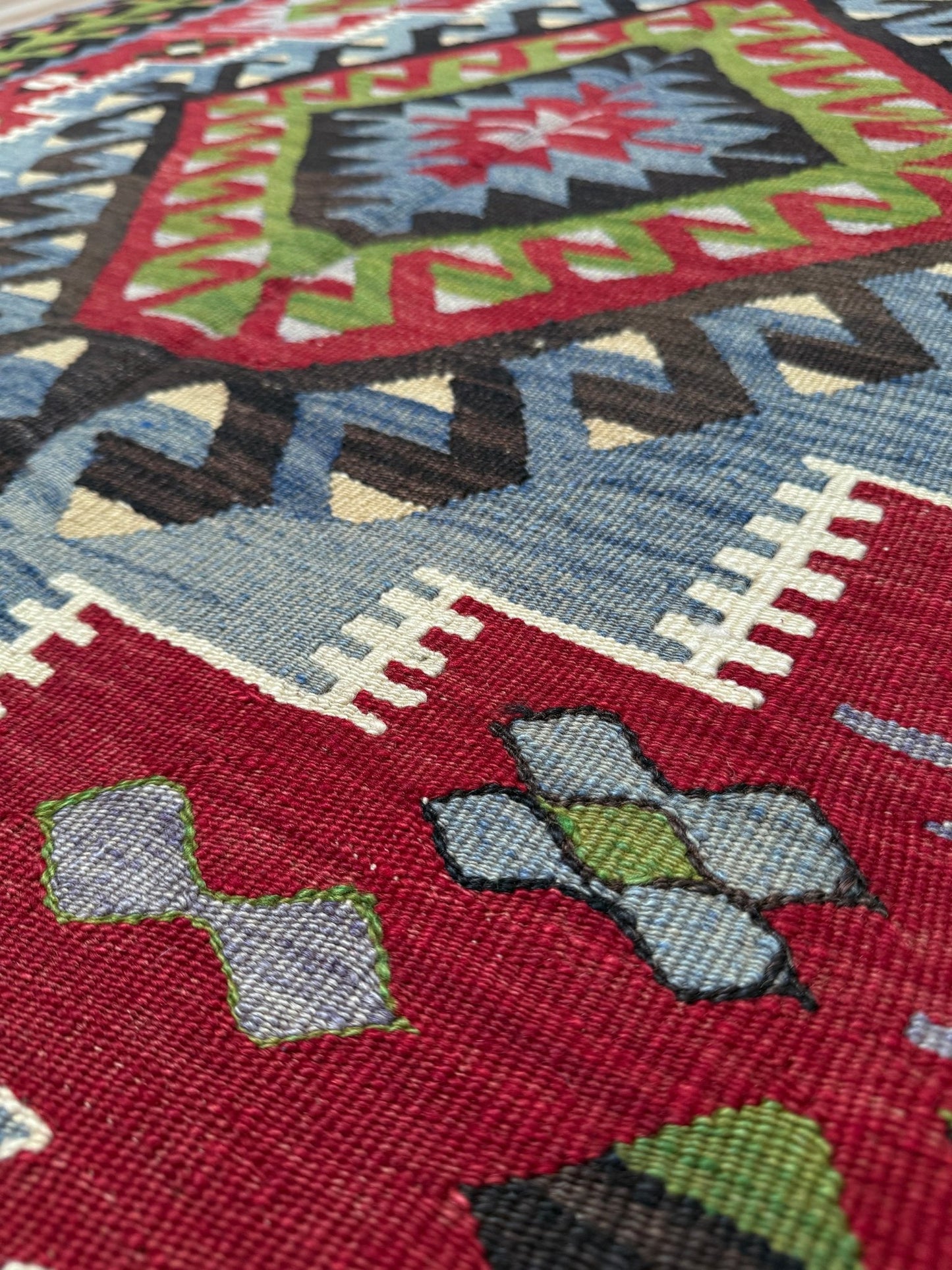 ✔ This Esme Turkish vintage kilim flatweave is a riot of joyful geometry, where bold diamond medallions steal the scene in earthy reds, mossy greens, and sky blues. The rhythmic zigzags and tribal motifs bring a lively, almost musical energy to the piece, making it feel both timeless and refreshingly spirited. Rich burgundy tones ground the design, while soft greens and cool blues add an unexpected lightness, keeping the eye dancing across the weave. Handwoven in pure wool, this kilim feels like a conversation between tradition and play — ready to spark life into any space.