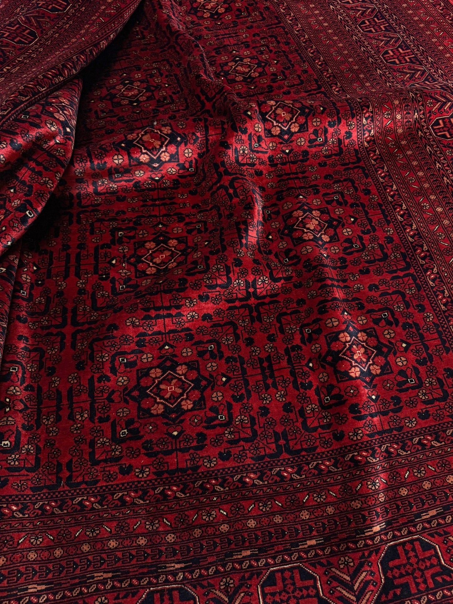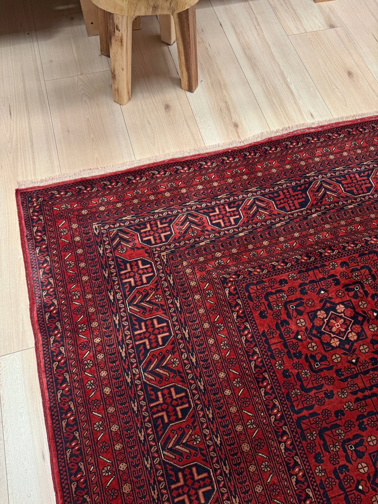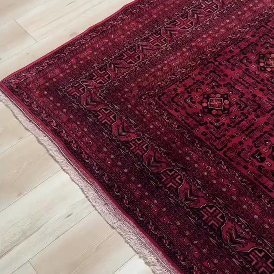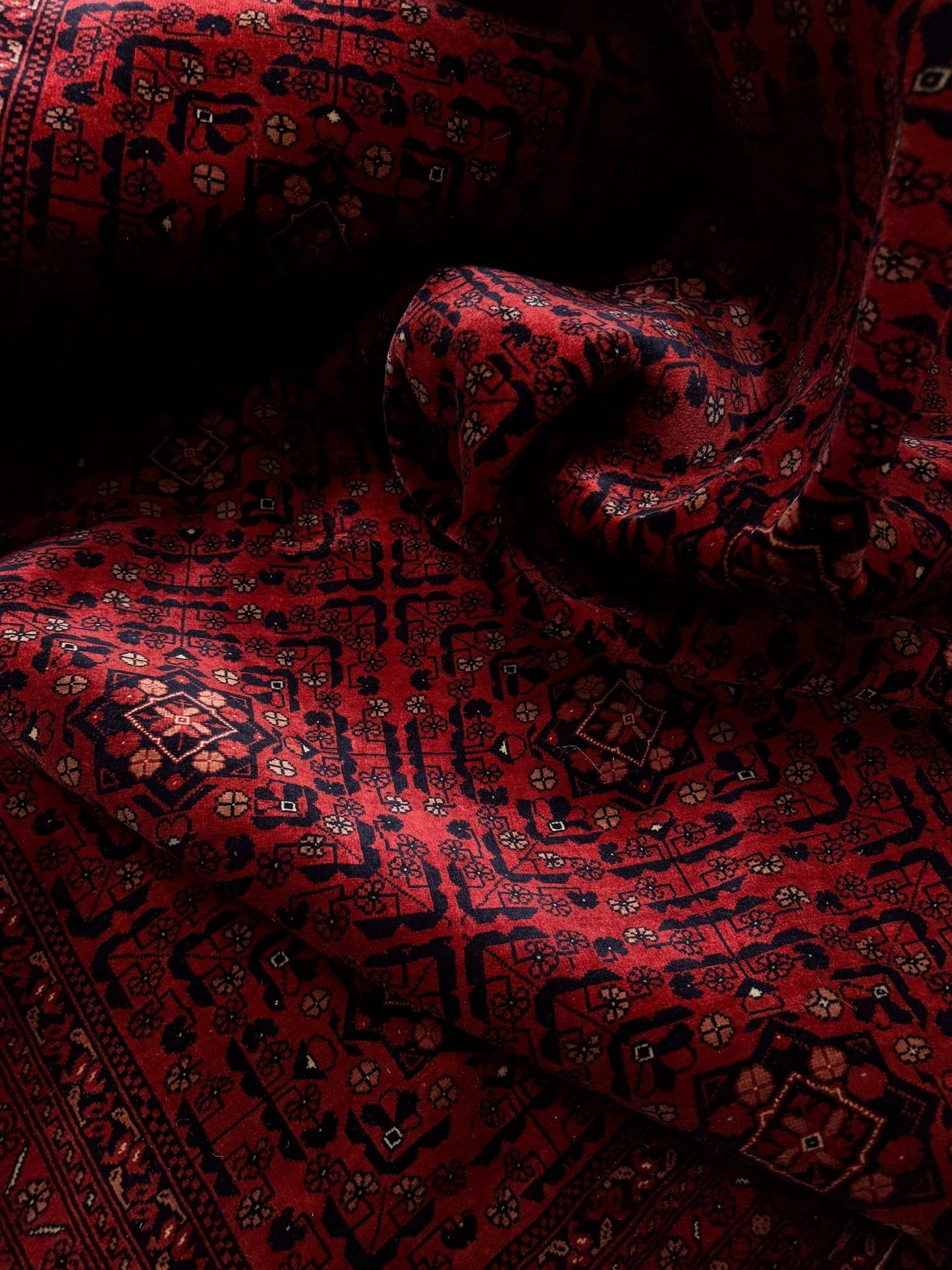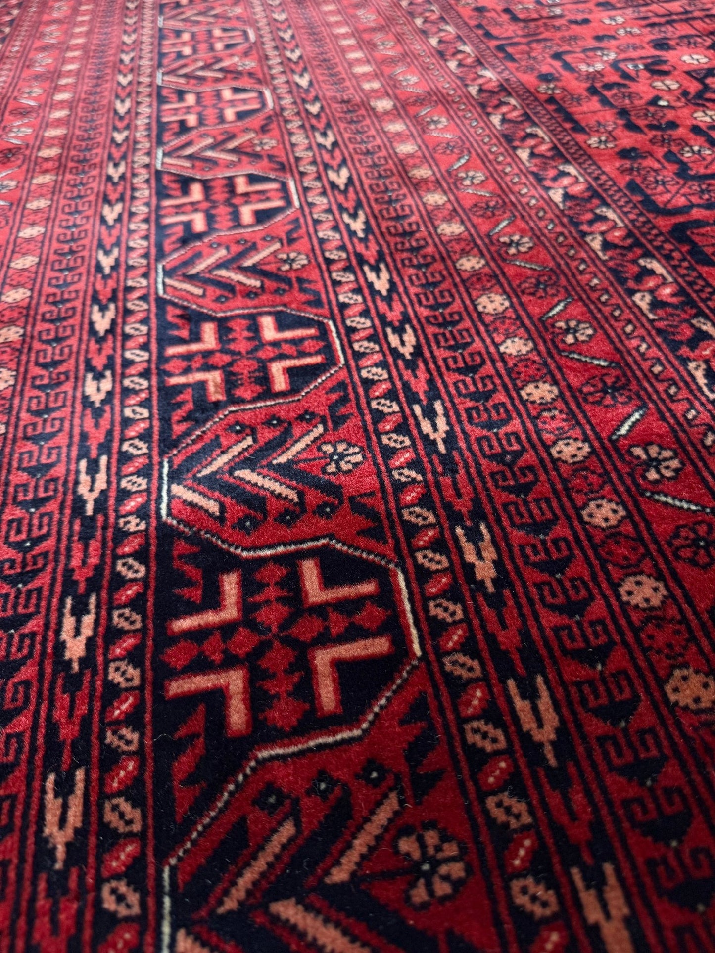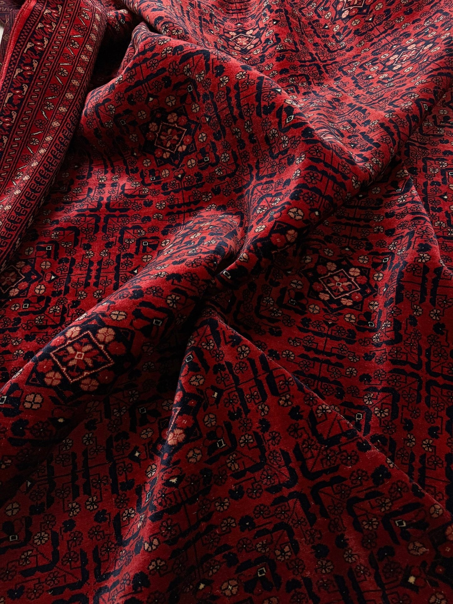 ✔ Featuring the iconic Khal Mohammadi design, this Turkmen Bilcik vintage rug is all about deep, delicious reds, smoky garnets, and inky blacks swirling together in a hypnotic, geometric rhythm. The pattern is bold and disciplined, yet there's a quiet elegance in its repetition—almost meditative. Hand-knotted from silky, shiny Ghazni wool, it catches the light just right and feels like velvet underfoot (yes, really). Sophisticated with a wink of playfulness, this rug doesn’t just warm a room—it gives it a pulse.