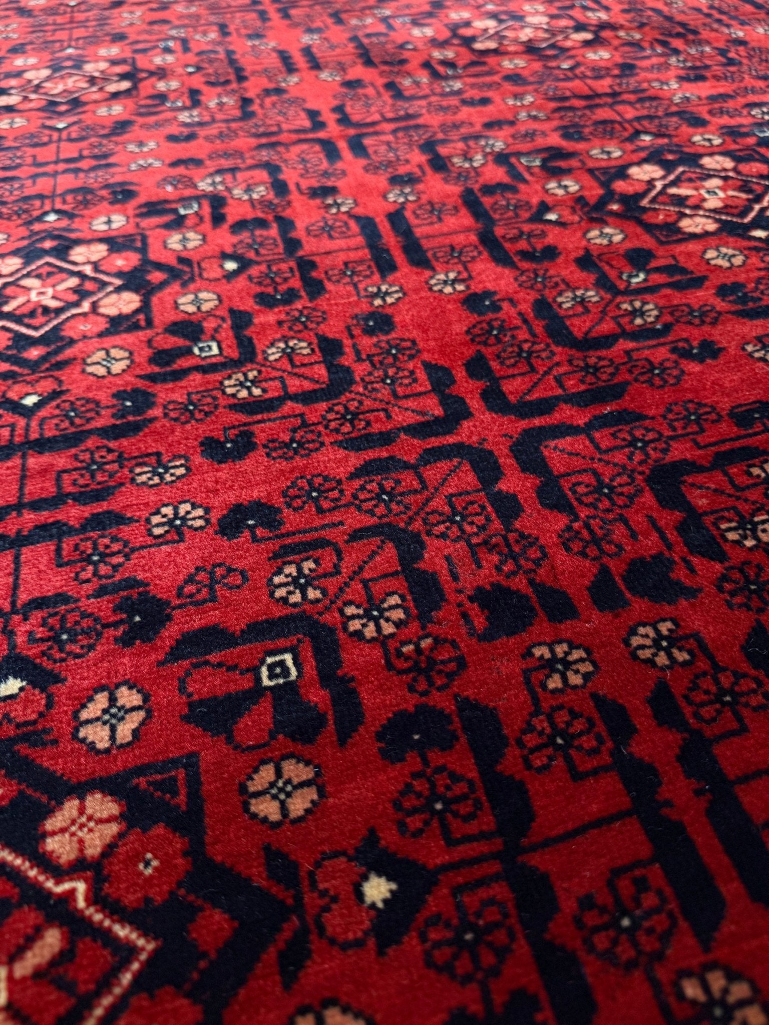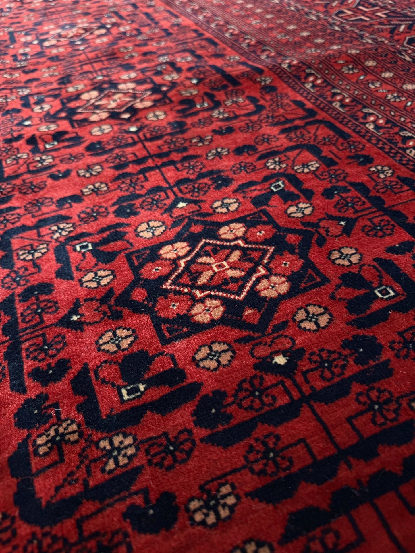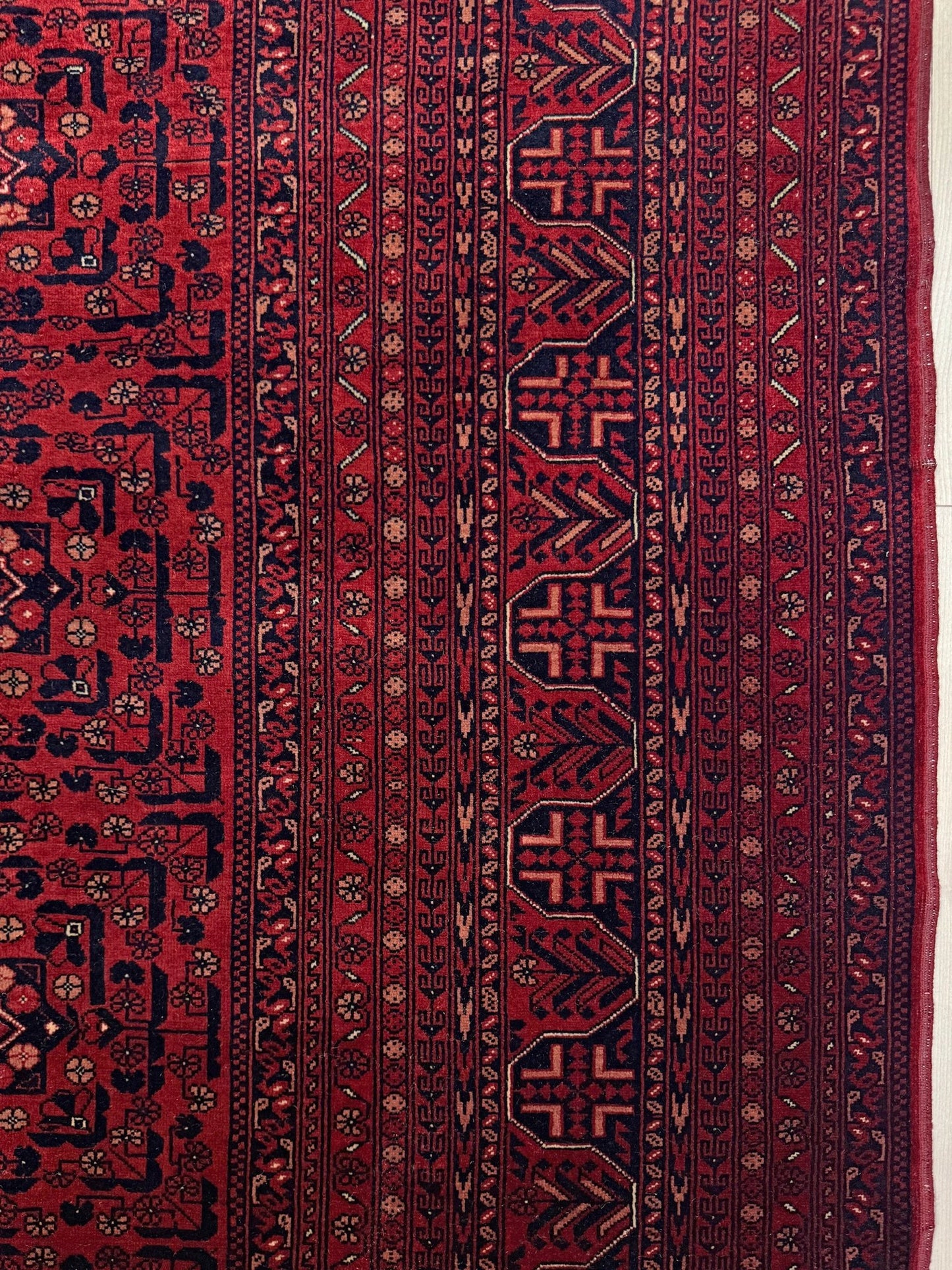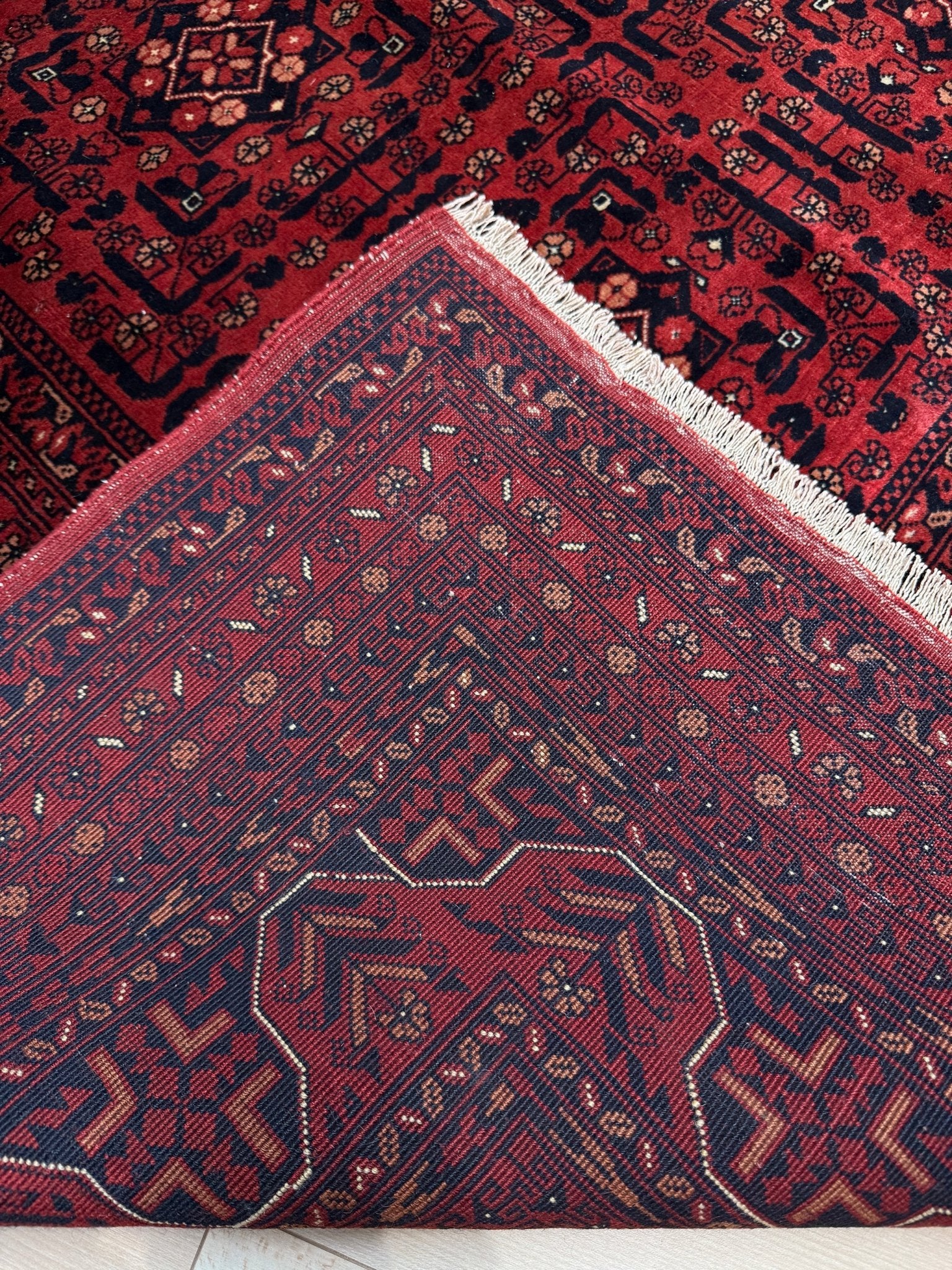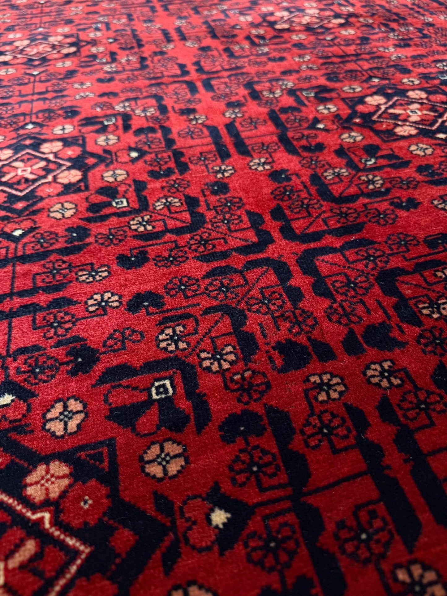✔ Featuring the iconic Khal Mohammadi design, this Turkmen Bilcik vintage rug is all about deep, delicious reds, smoky garnets, and inky blacks swirling together in a hypnotic, geometric rhythm. The pattern is bold and disciplined, yet there's a quiet elegance in its repetition—almost meditative. Hand-knotted from silky, shiny Ghazni wool, it catches the light just right and feels like velvet underfoot (yes, really). Sophisticated with a wink of playfulness, this rug doesn’t just warm a room—it gives it a pulse.