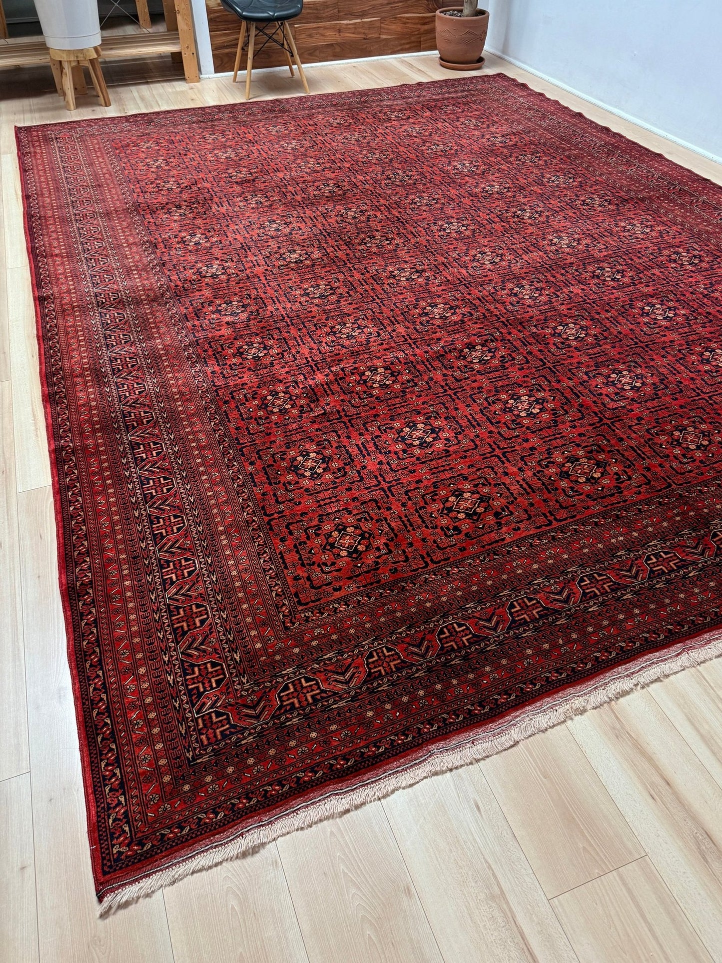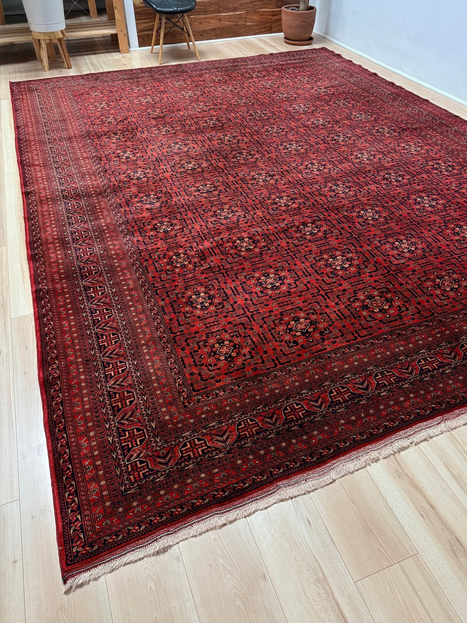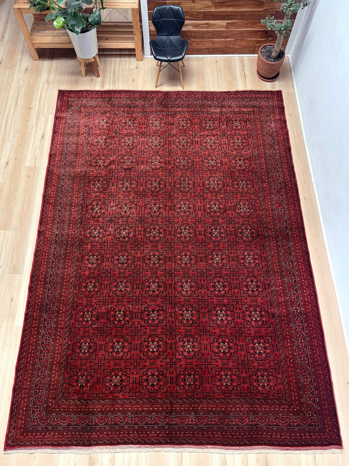 Garnet Red Bilcik Vintage Turkmen Rug • Handmade Wool Carpet • 10x14 Traditional Rug for Living Room, Bedroom, Dining & Office