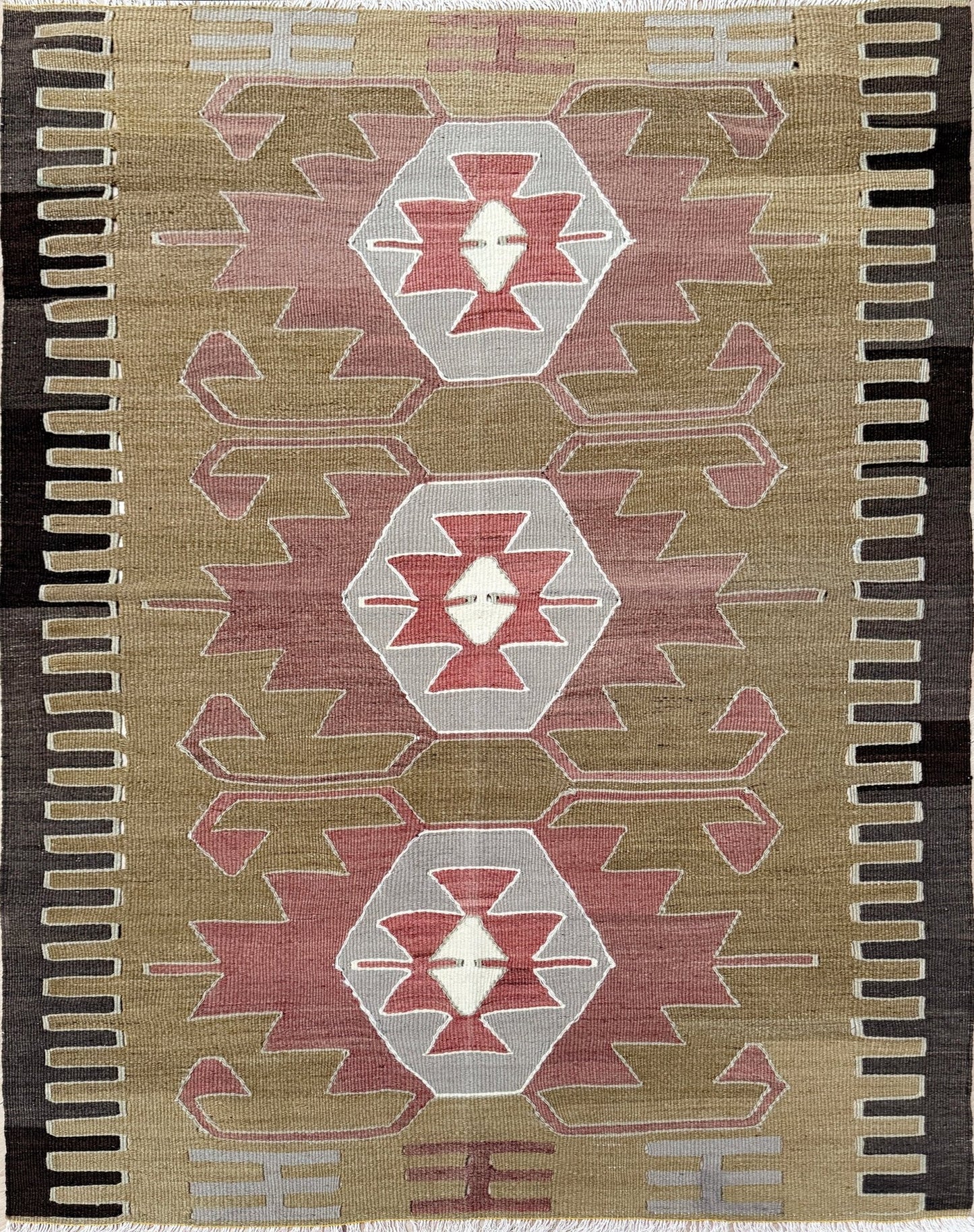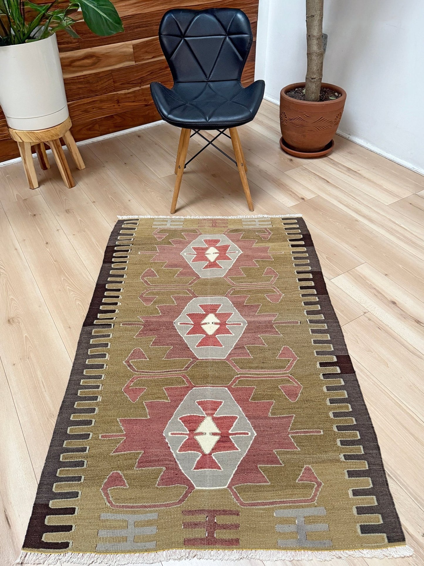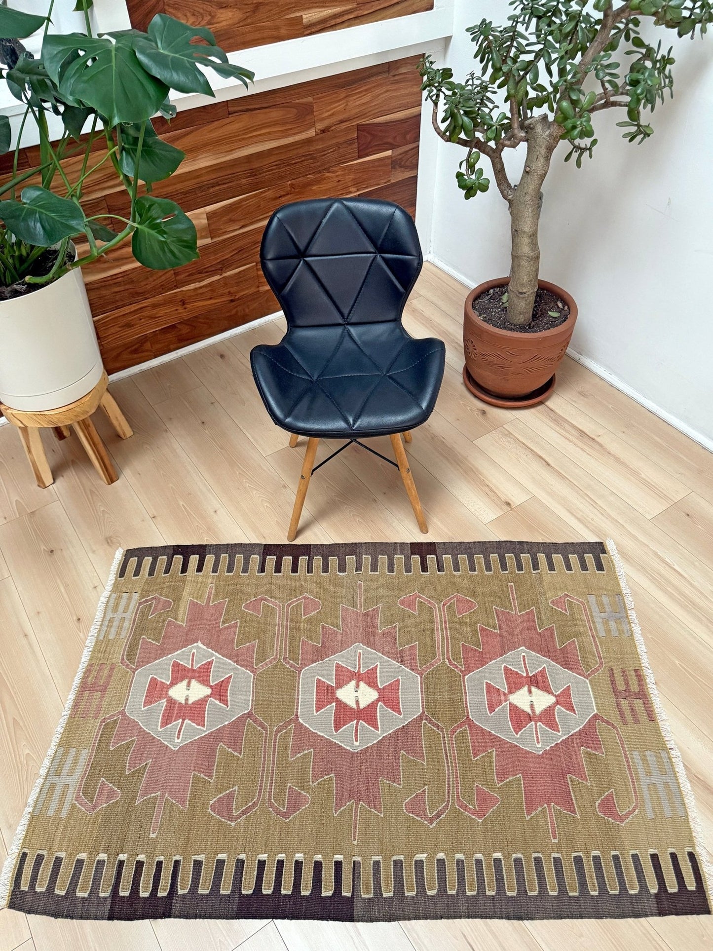 3x4 Green Navajo Style Muted Turkish Kilim Rug • Handmade Wool Carpet • Tribal Flatweave Rug for Living Room, Bedroom, Dining, Kitchen & Nursery