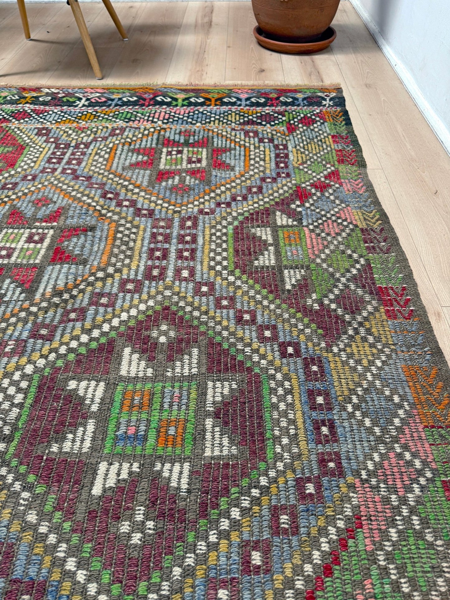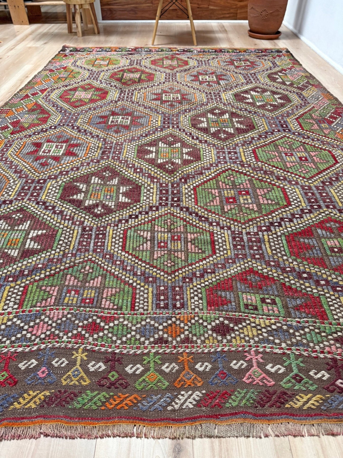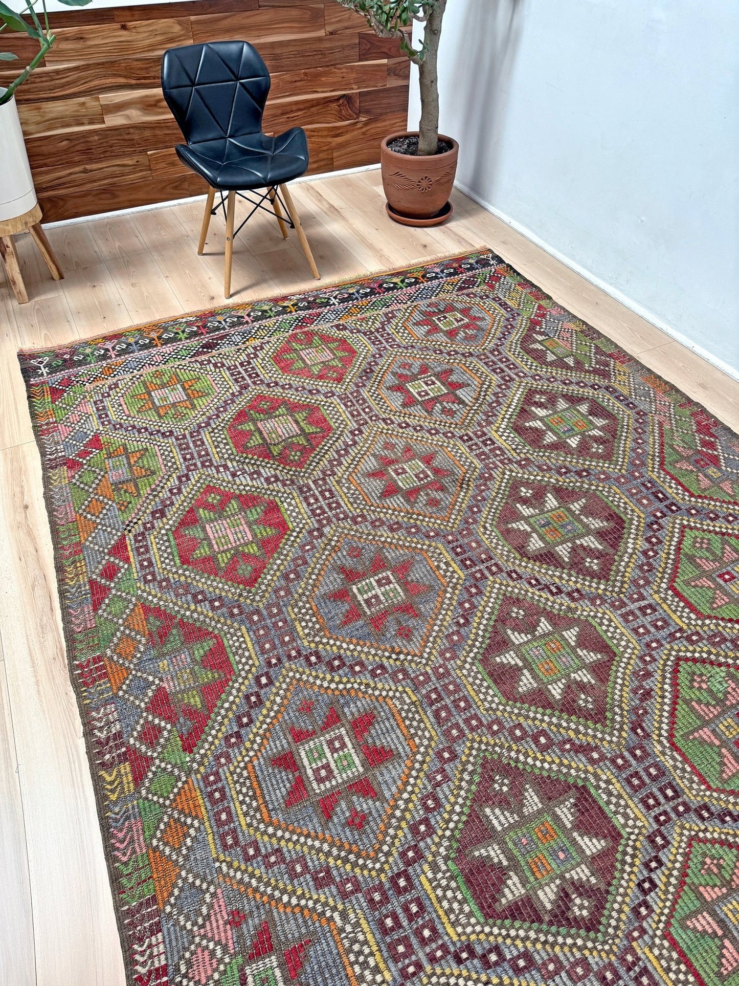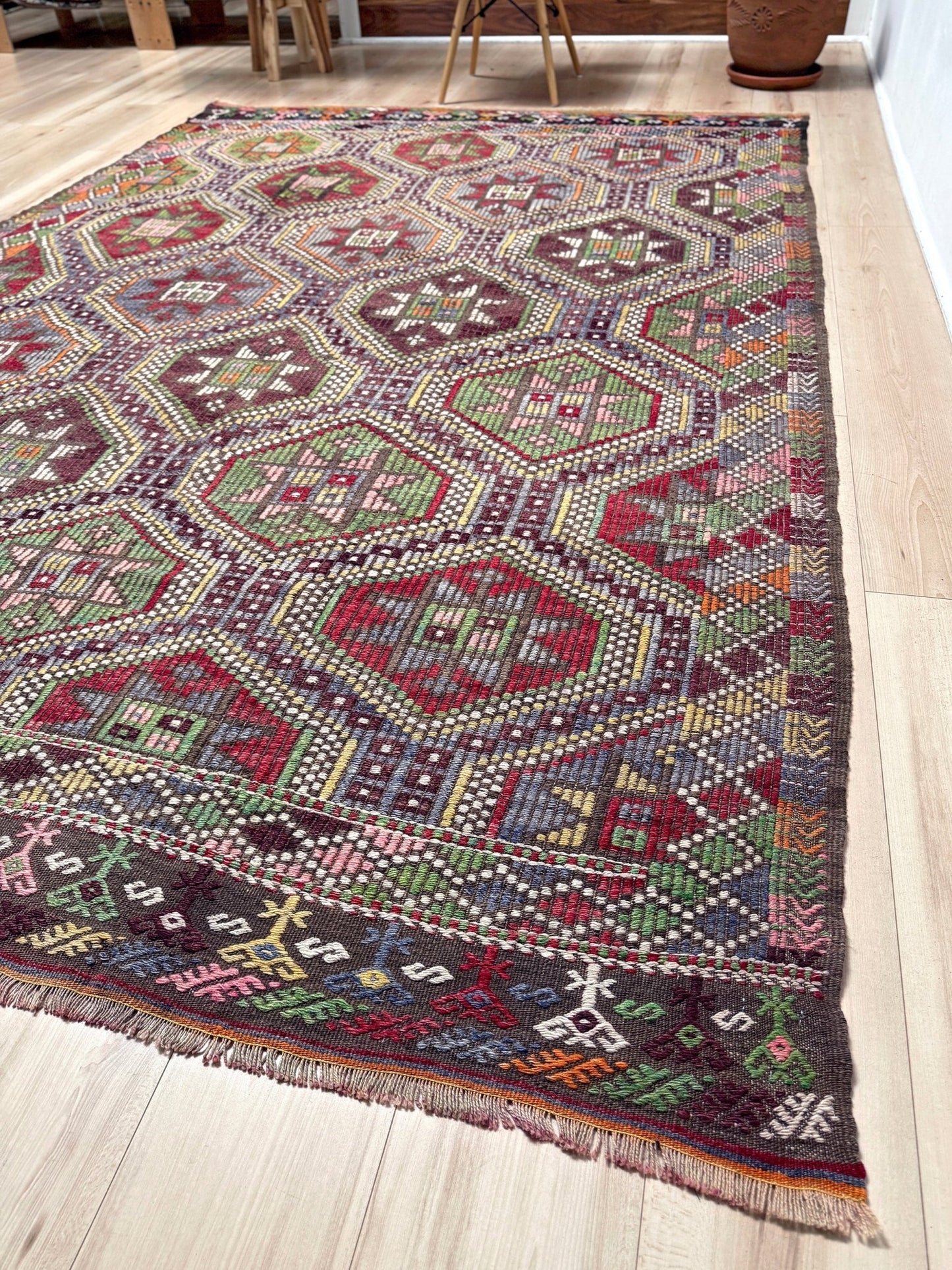 Zili Cicim Embroidered Vintage Turkish Kilim Rug • Handmade Flatweave Wool Carpet • 6x9 Geometric Tribal Rug for Living Room, Bedroom, Dining, Kitchen & Nursery