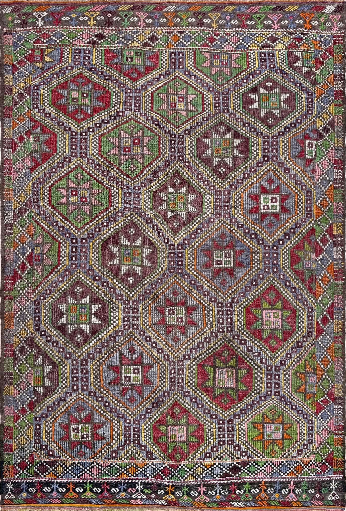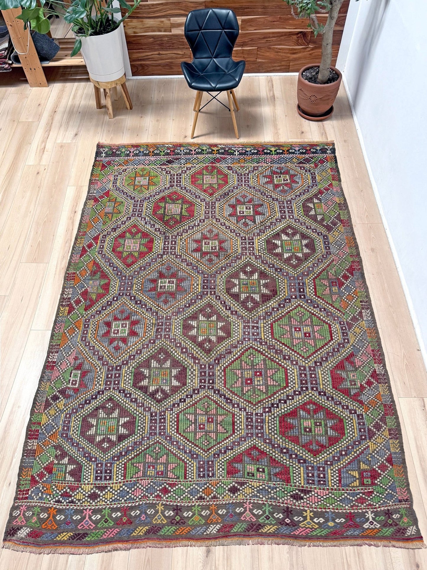 ✔ This vintage Turkish kilim is a joyful mosaic of star motifs nested in bold geometric medallions, each dancing across the surface like constellations in a midnight sky. Earthy reds, mossy greens, and golden ochres mingle with soft pastels, giving the rug a rare balance of vibrancy and warmth. The flatweave texture brings out the crispness of the design, while the playful rhythm of colors keeps the eye moving, discovering new details with every glance. Perfect for anyone looking to add a touch of folk charm and timeless character to their space.