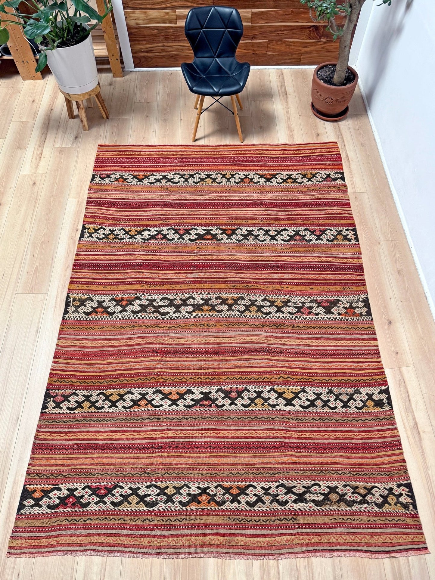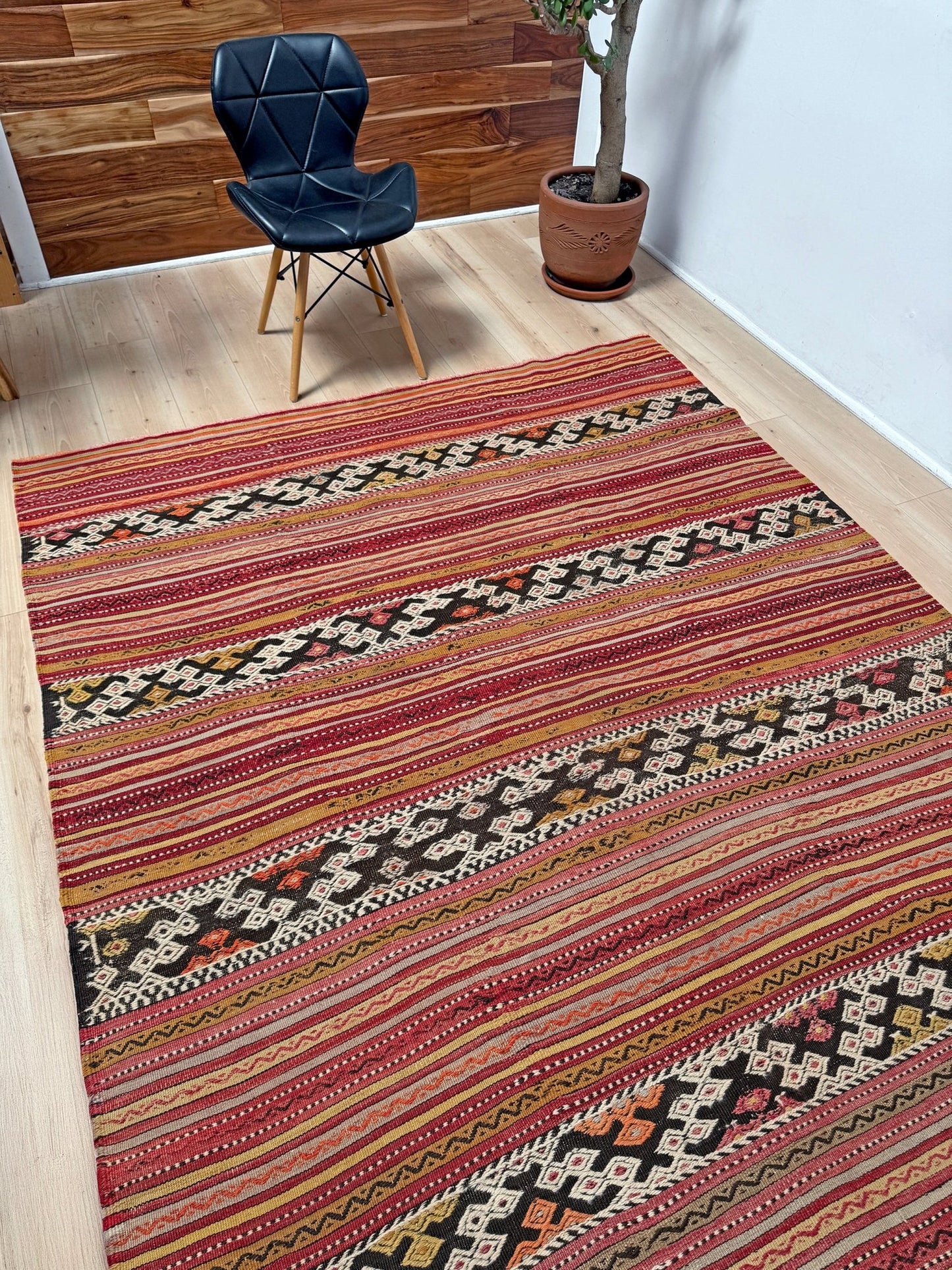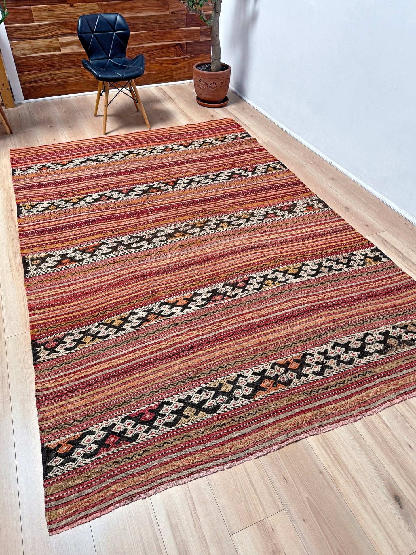 Vintage Turkish Kilim Rug • Handmade Flatweave Wool Carpet • 6x8 Striped Orange Geometric Tribal Rug for Living Room, Bedroom, Dining, Kitchen & Nursery