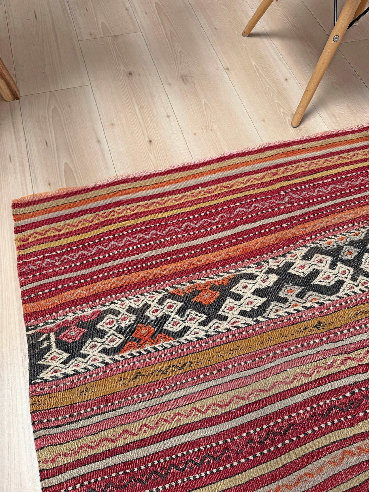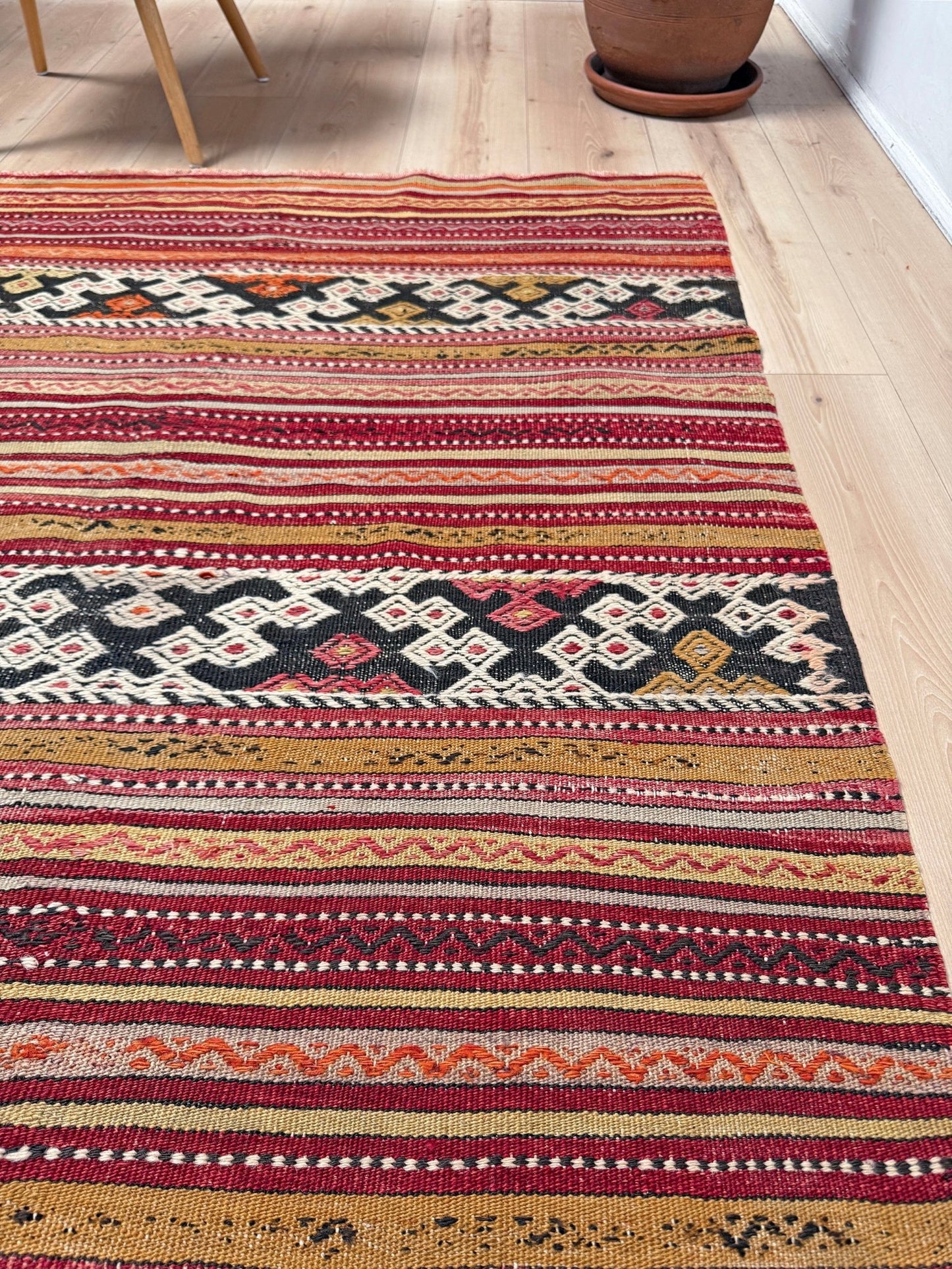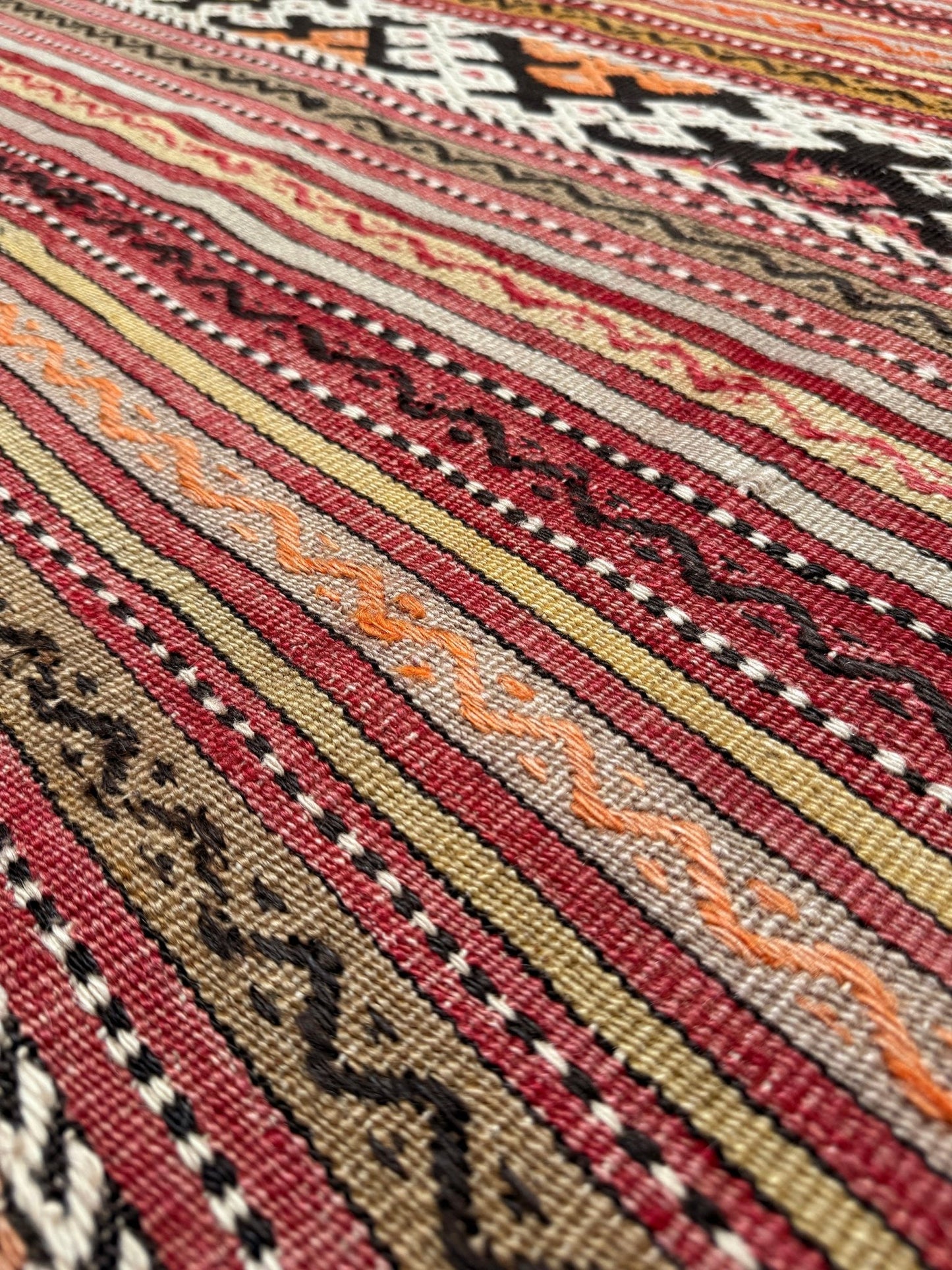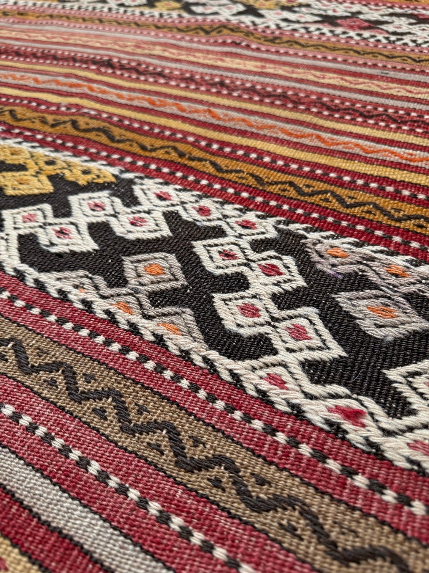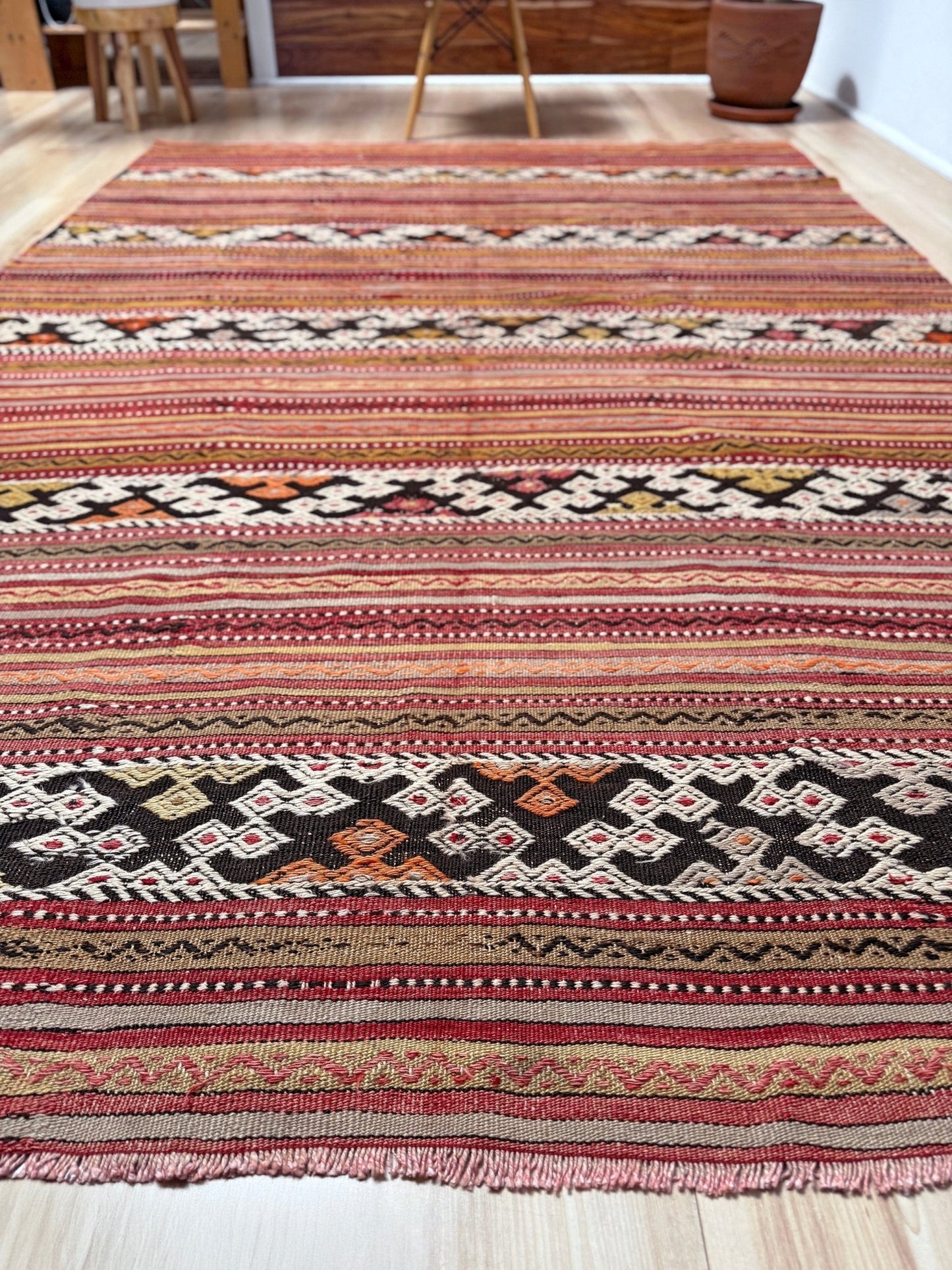 ✔ This vintage Turkish kilim is a joyful celebration of color and craft, with its playful interplay of earthy ochres, warm terracottas, and deep magentas dancing across the handwoven wool. Bold black-and-white geometric bands cut through the softer stripes, creating a striking rhythm that feels both grounded and energetic. Each motif whispers stories of Anatolian heritage, woven with precision yet brimming with life. The effect is effortlessly charming — a perfect balance of rustic soul and sophisticated flair that instantly enlivens any space.
