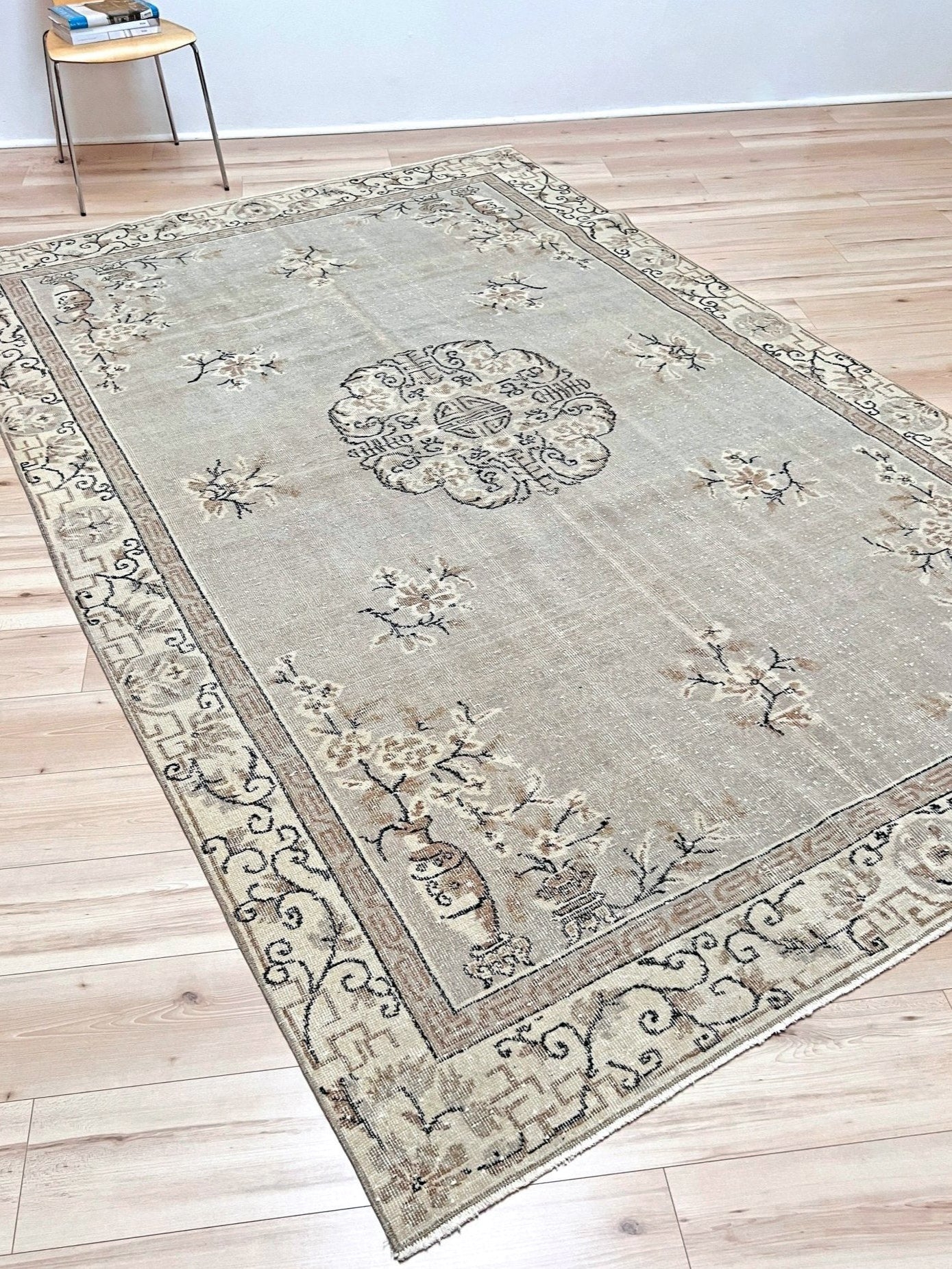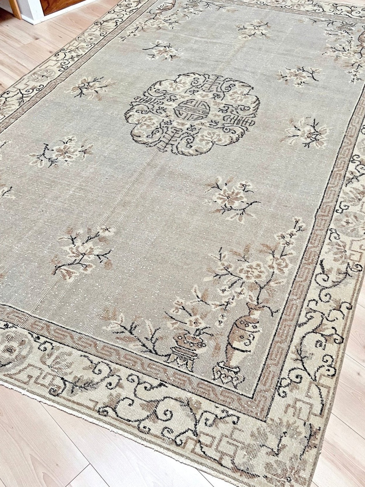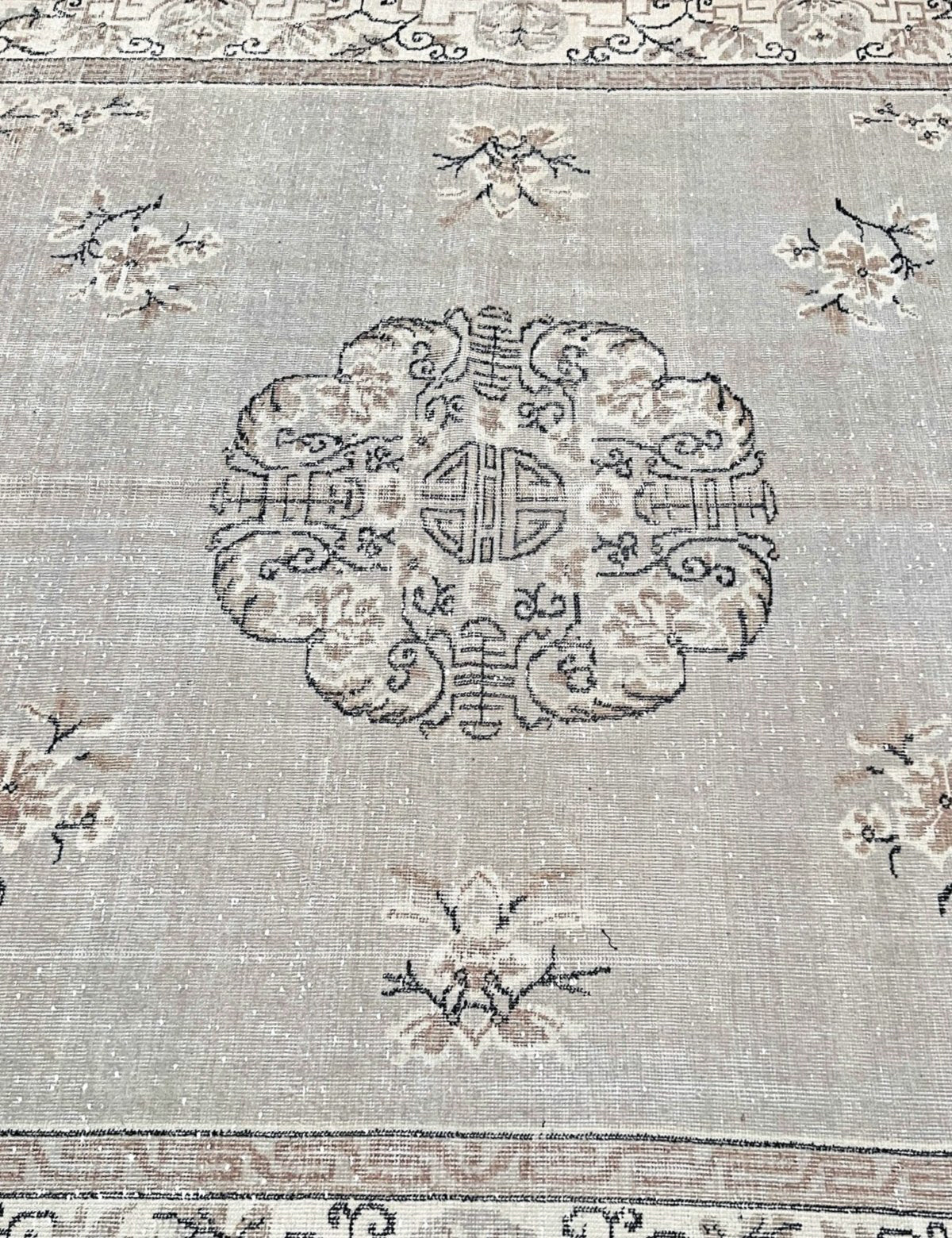 Traditionally hand-knotted in Turkey. This rug has gone a professional distressing and  washing process to give it a modern muted look. Although it originates from Turkey, it showcases design elements that draw significant inspiration from antique Chinese Ghiordes rugs, notably evident in its intricate medallion, borders and corner motifs. It has a low pile and it is very durable.