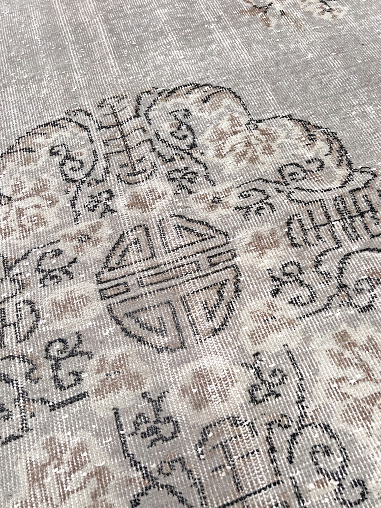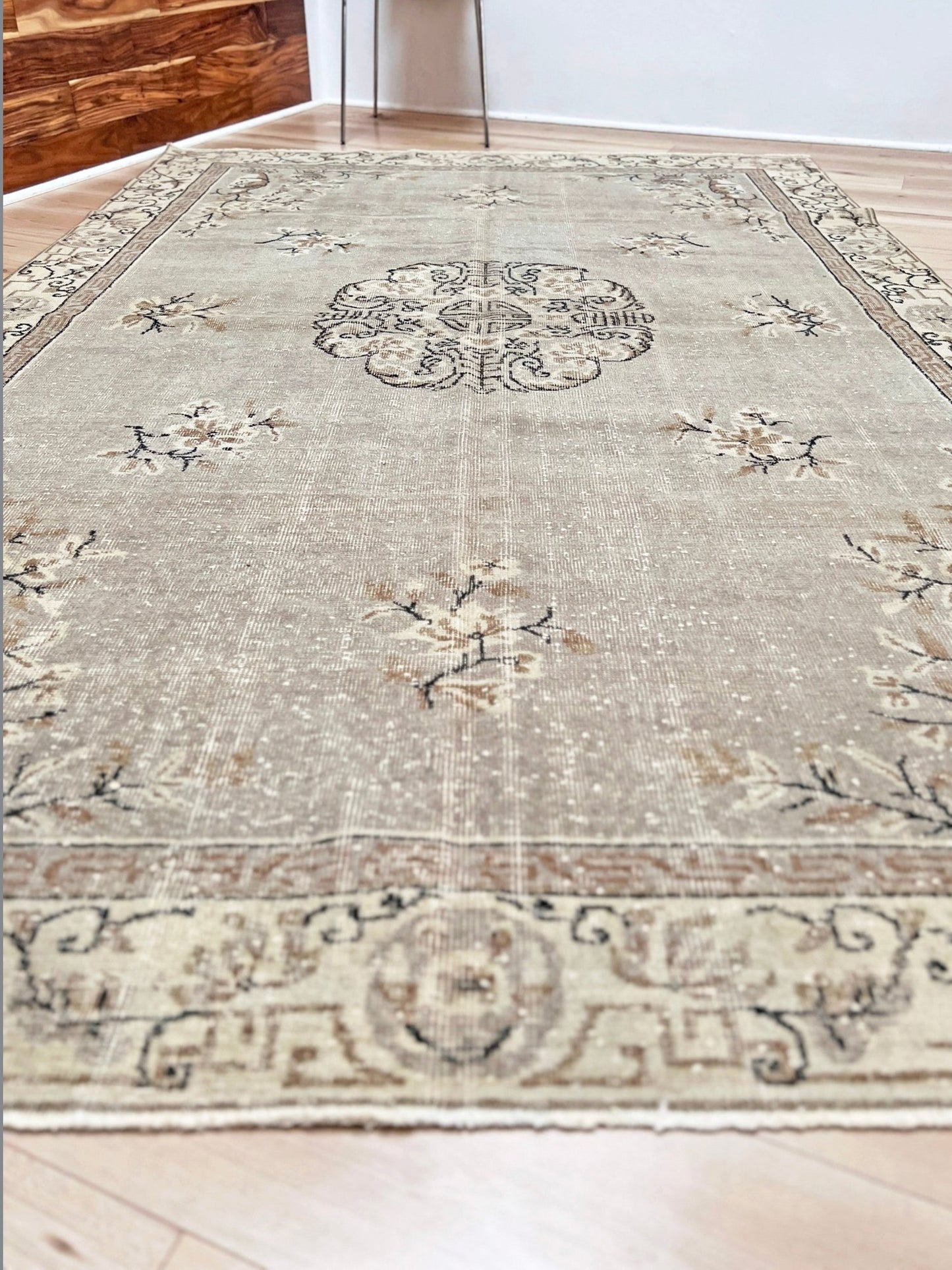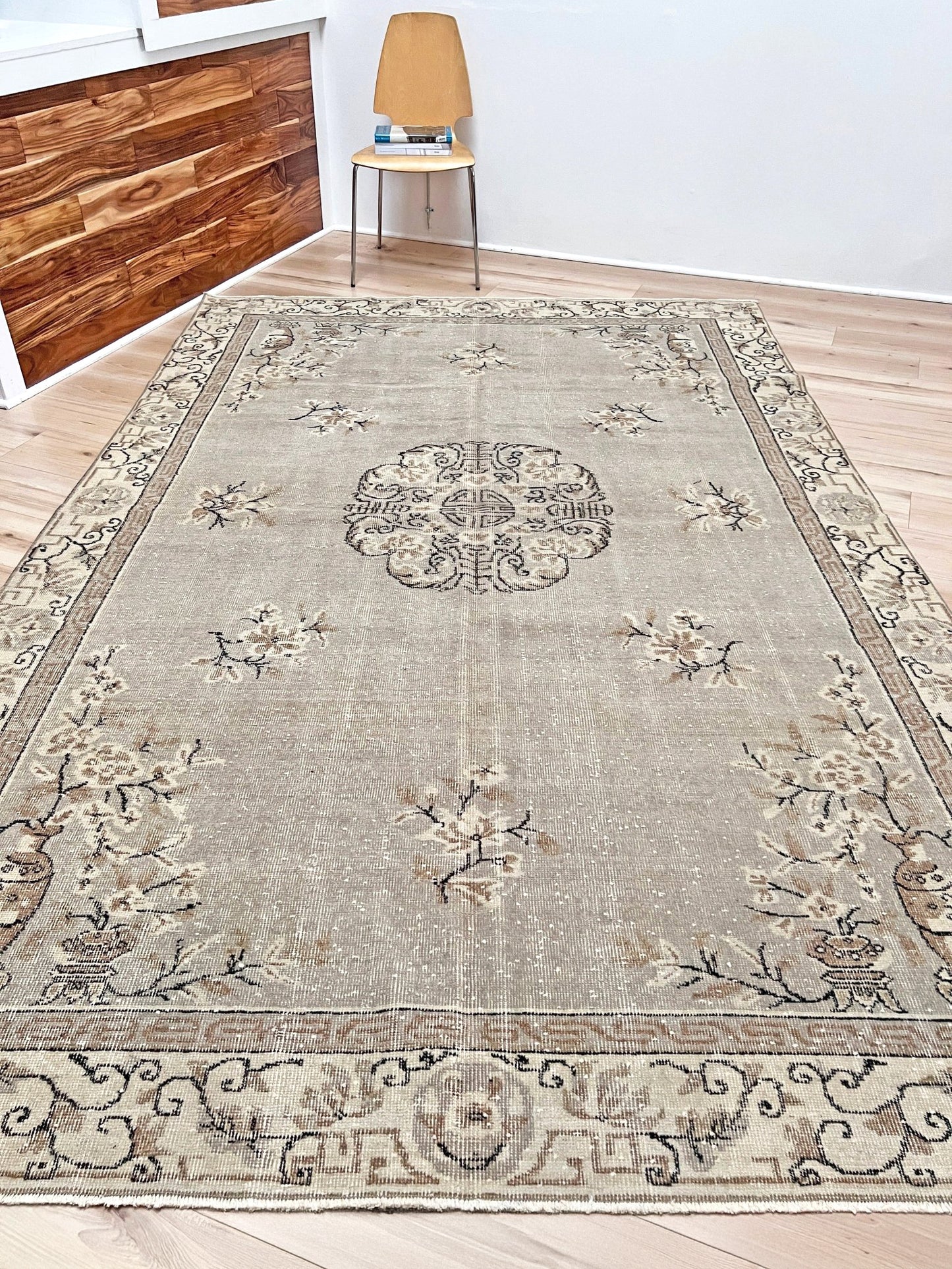 Traditionally hand-knotted in Turkey. This rug has gone a professional distressing and  washing process to give it a modern muted look. Although it originates from Turkey, it showcases design elements that draw significant inspiration from antique Chinese Ghiordes rugs, notably evident in its intricate medallion, borders and corner motifs. It has a low pile and it is very durable.