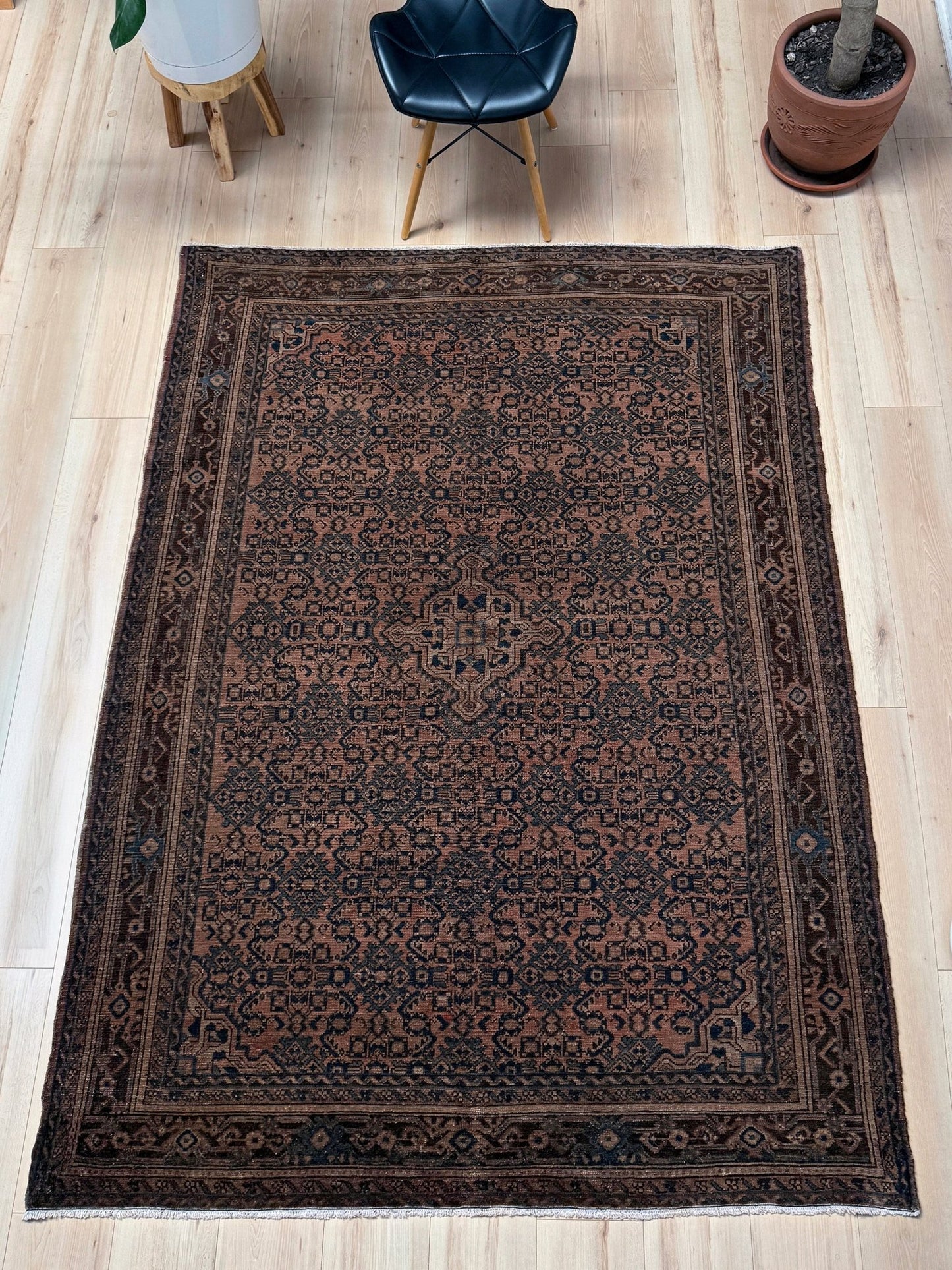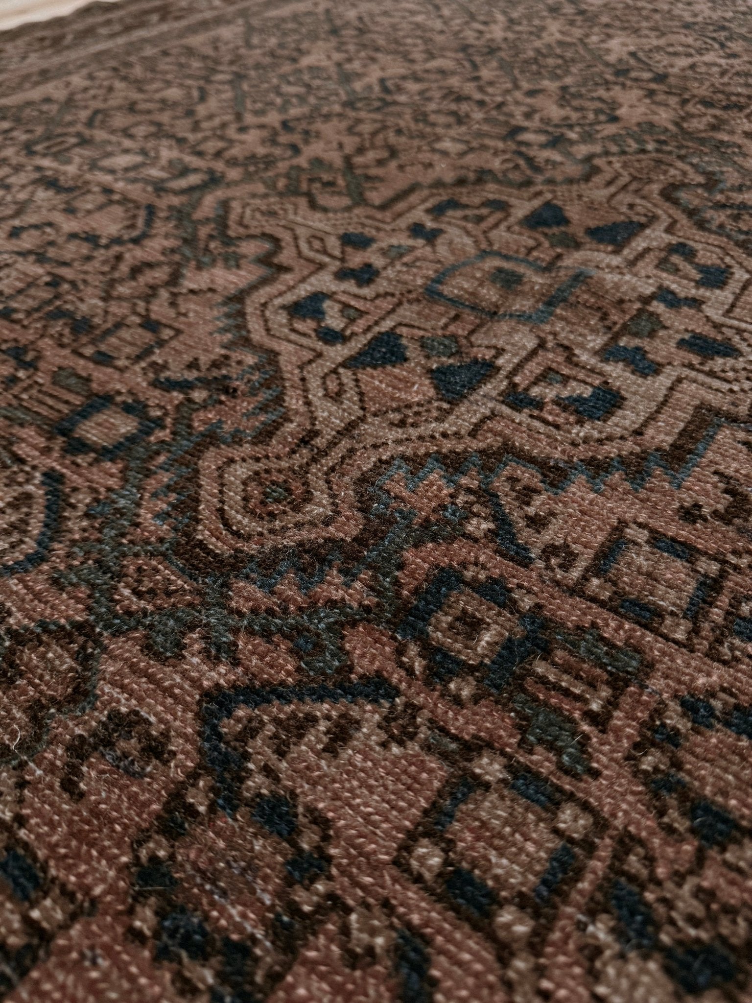 ✔ There’s something irresistibly moody about this vintage handmade rug—its deep, inky indigo and rich espresso hues seem to whisper stories of timeworn elegance. The intricate lattice of geometric motifs is softened by age, creating a mesmerizing, almost hypnotic effect that pulls you in. A central medallion subtly emerges from the tapestry of patterns, adding just the right amount of quiet drama. Perfectly imperfect, its worn patina only adds to its charm, making it feel like a treasure unearthed rather than simpl y purchased.