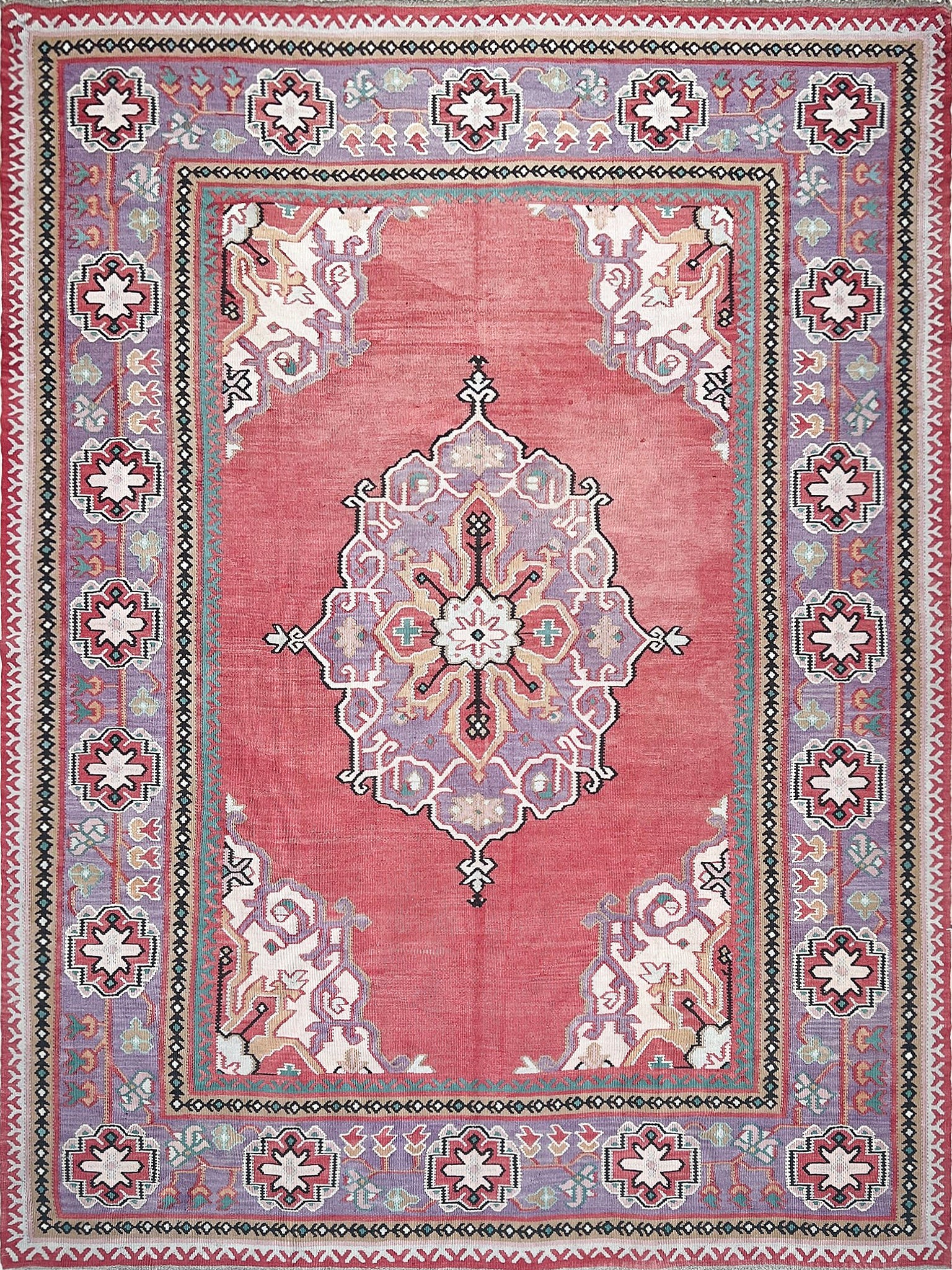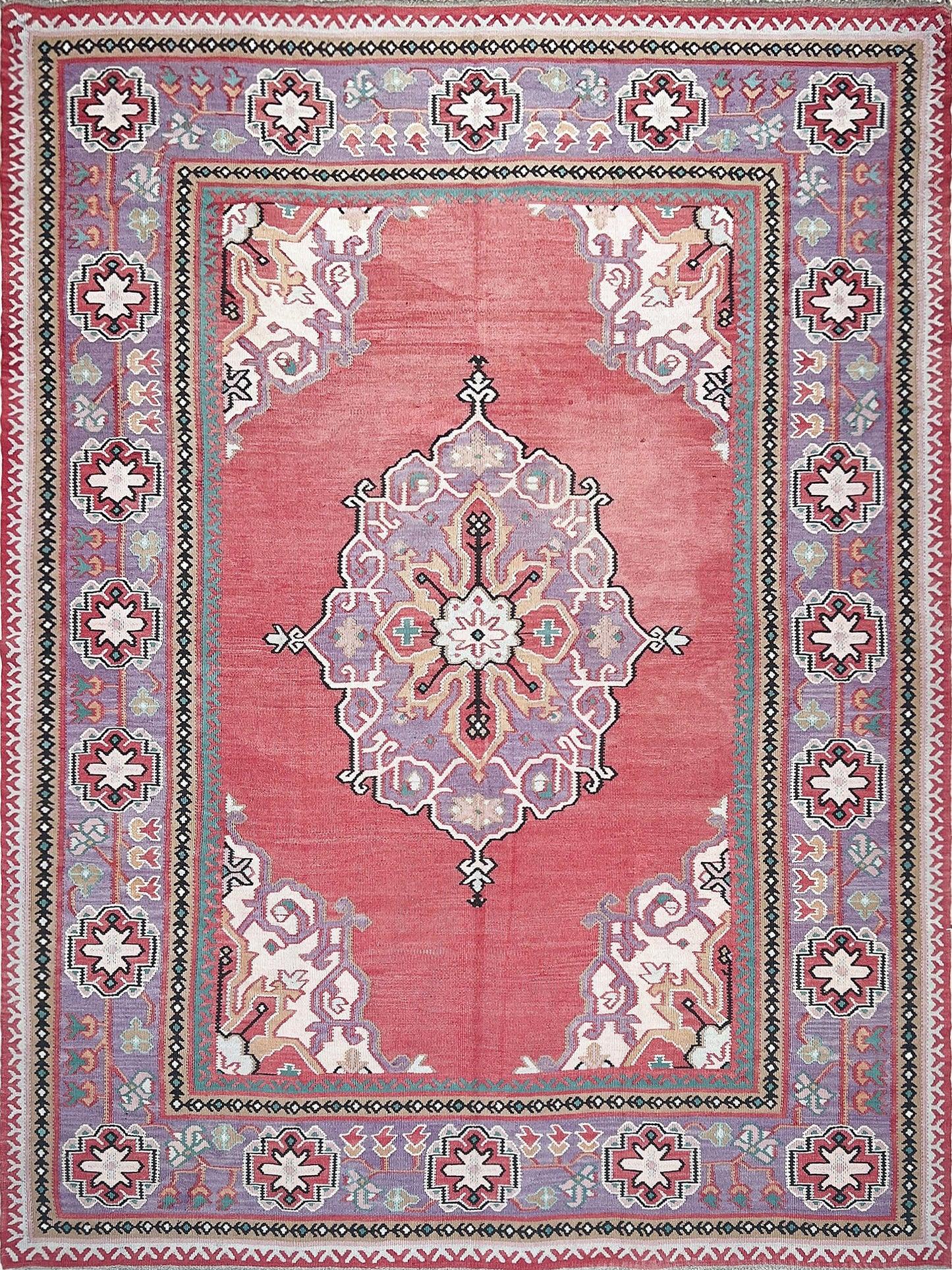 An exceptional antique Turkish Oushak kilim rug dating back to the 1930s. This rare find ceased production many years ago, highlighting its significance and scarcity. Its vibrant red and light purple border beautifully complement the large central medallion, distinguishing it as a true masterpiece among kilim rugs. Embracing a touch of history, a subtle discoloration around the medallion enhances the rug's distinctive character. Meticulously crafted by hand using the traditional kilim weaving technique, this rug not only exudes beauty but also boasts durability, ensuring its enduring allure as a timeless piece of history.